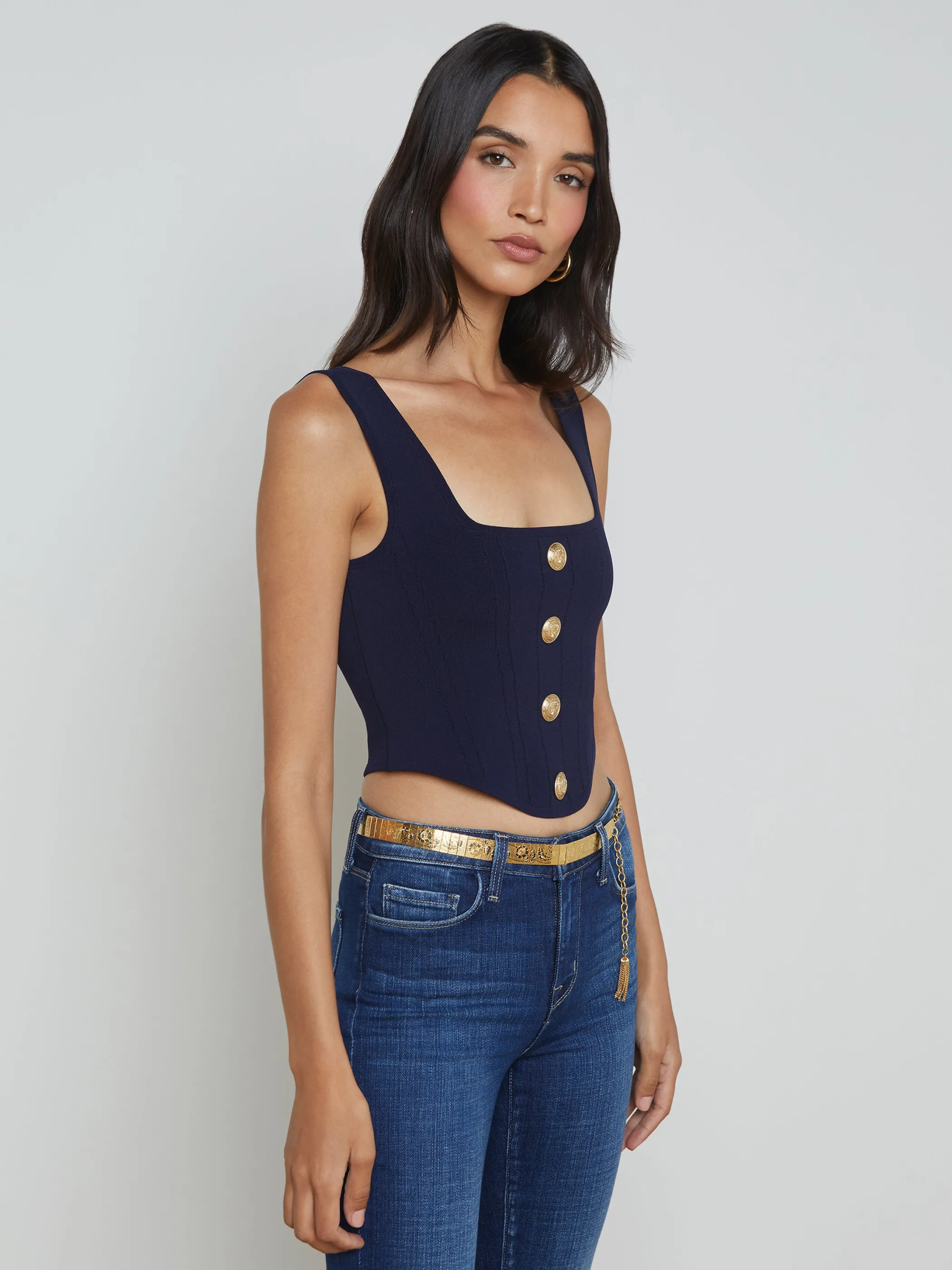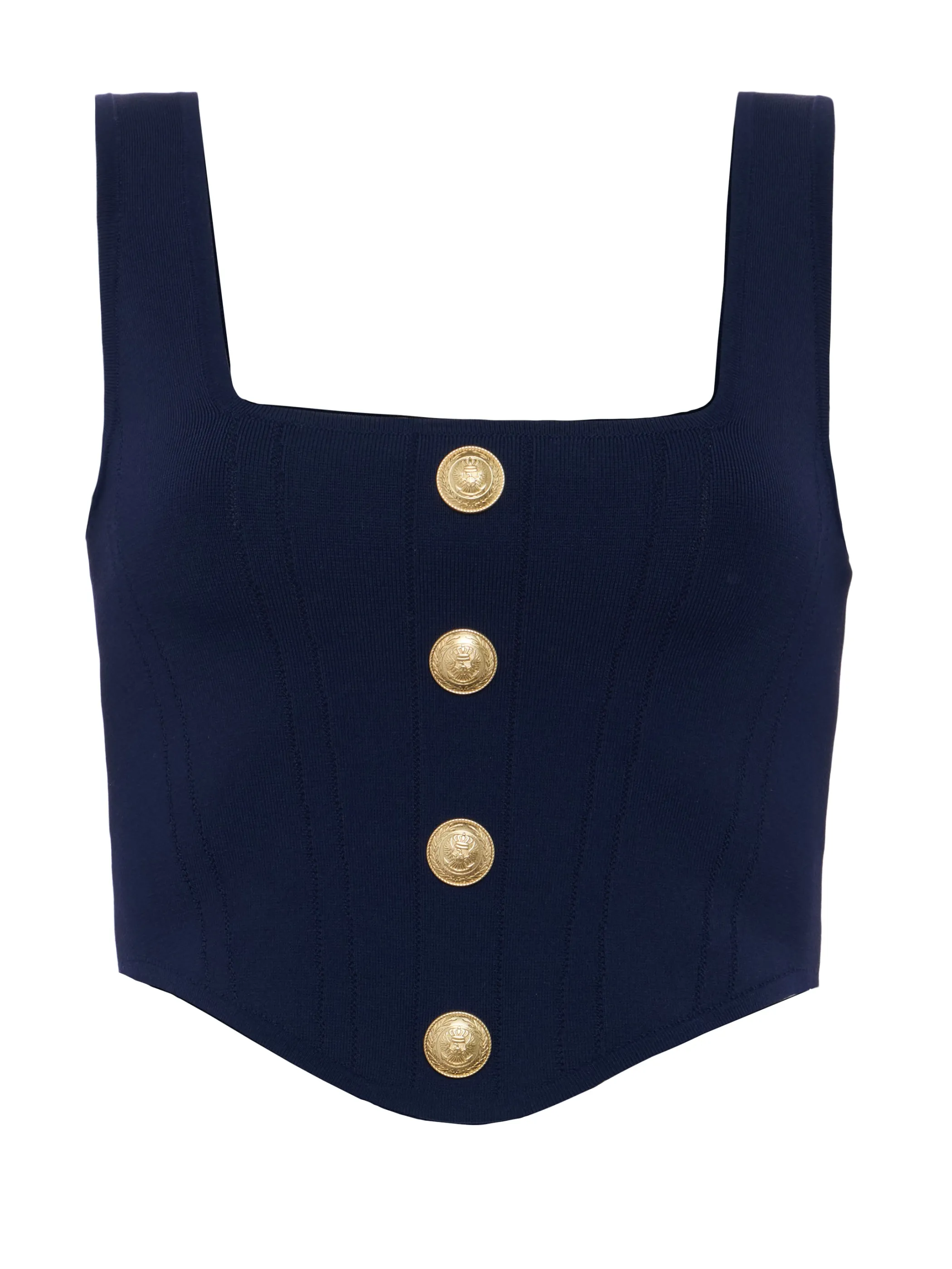 The perfect little top in a power knit that supports and smooths the figure, finished with a curved hemline that flatters and forgives. Now in dark midnight.