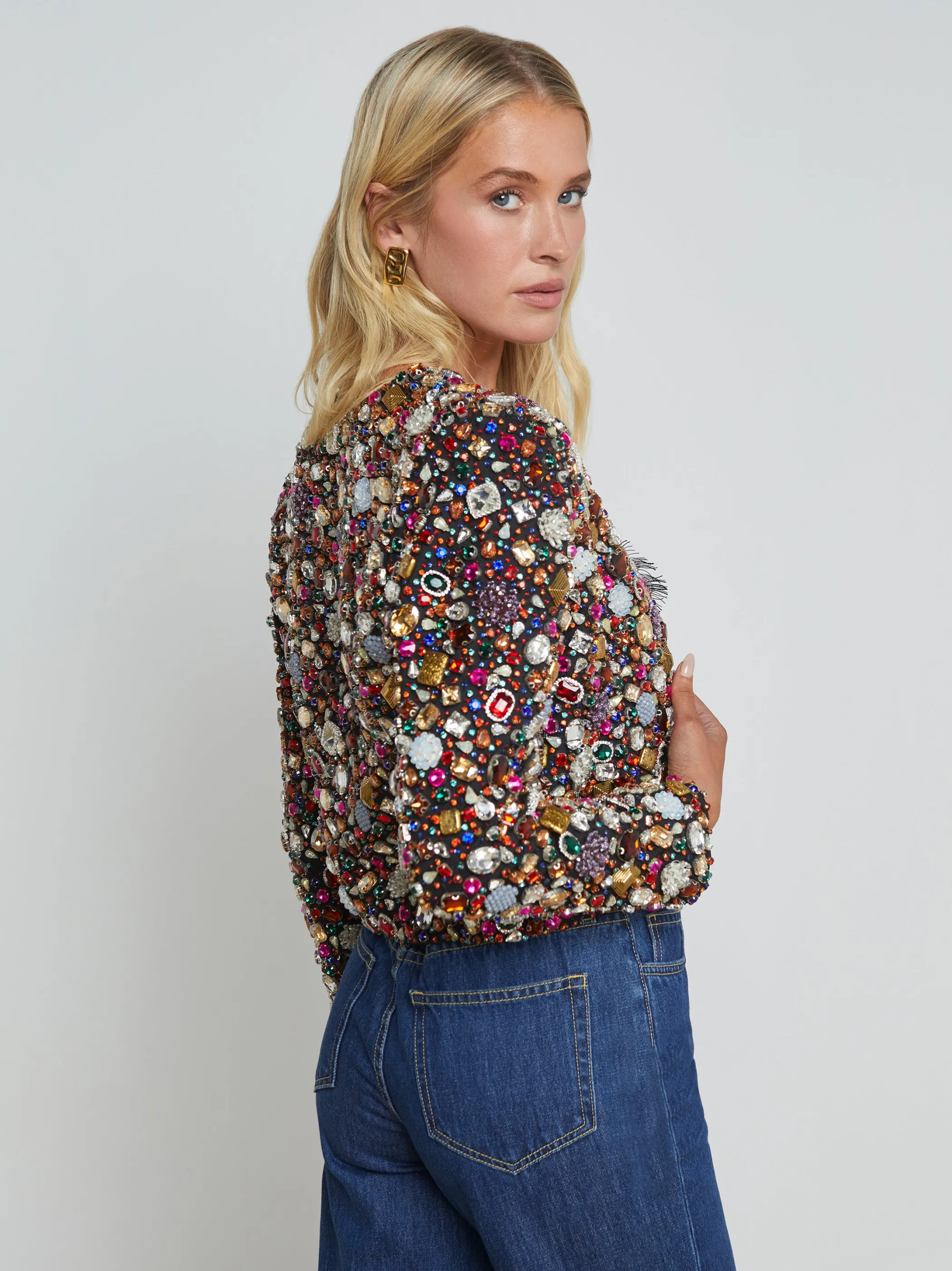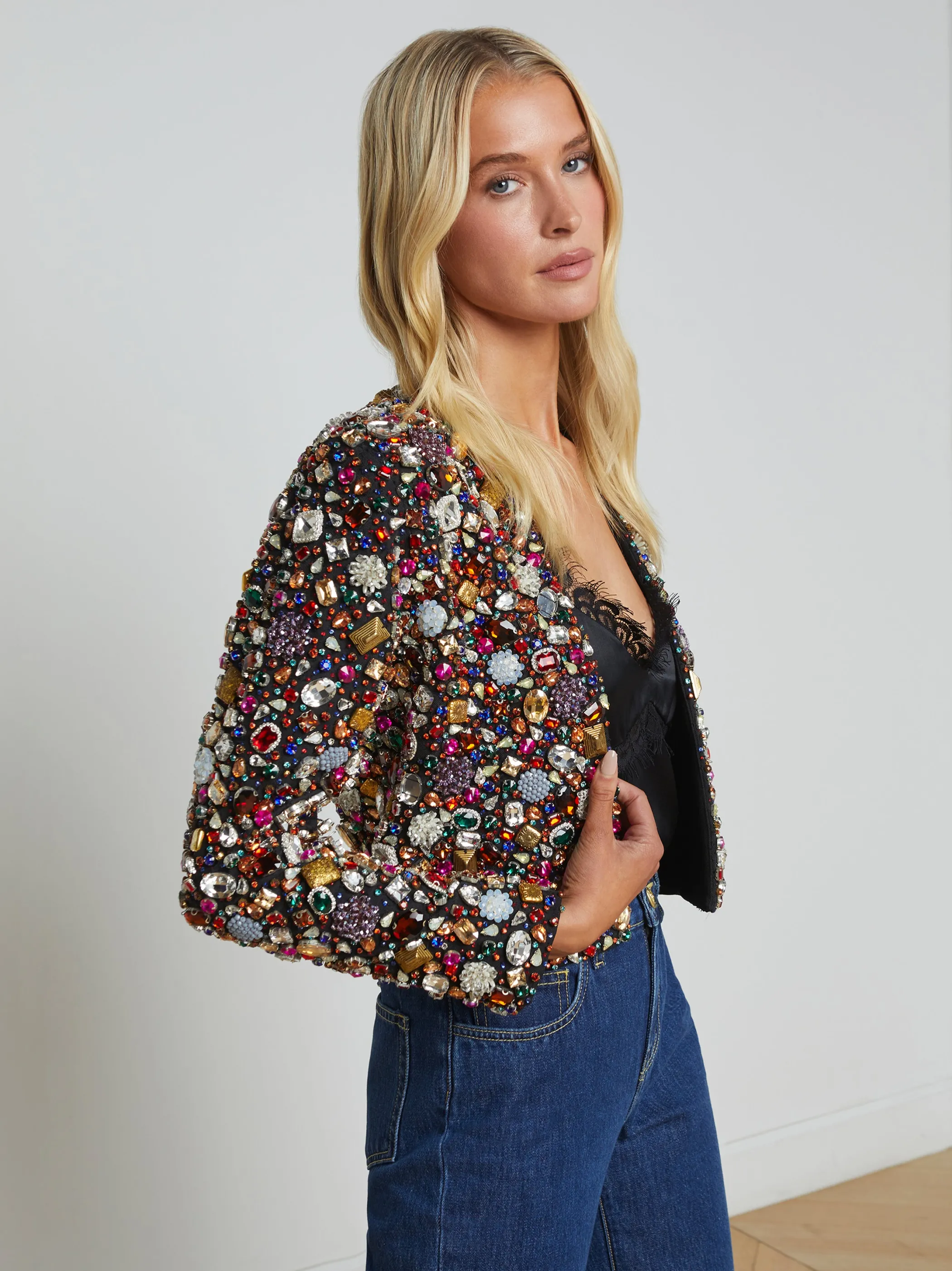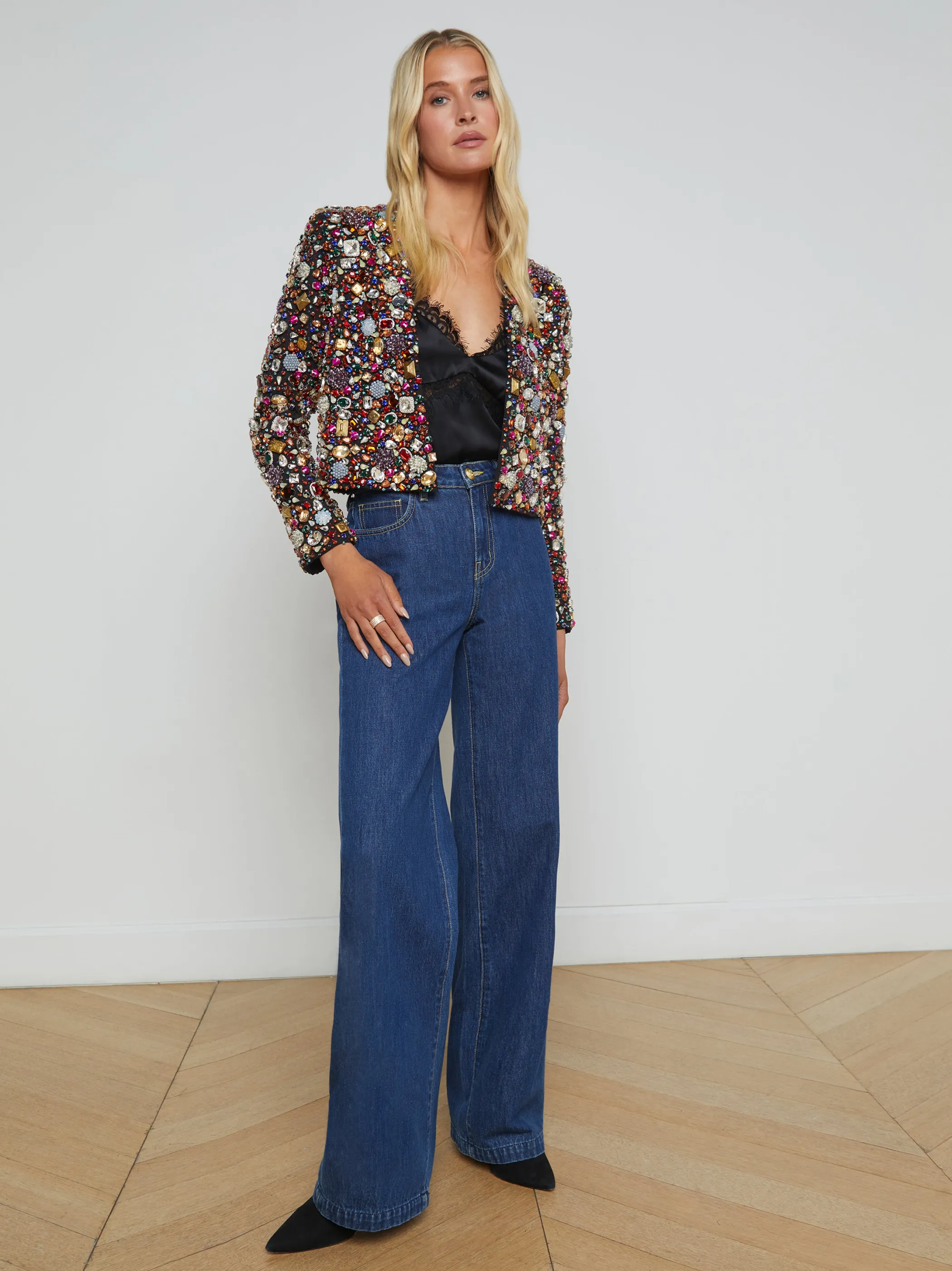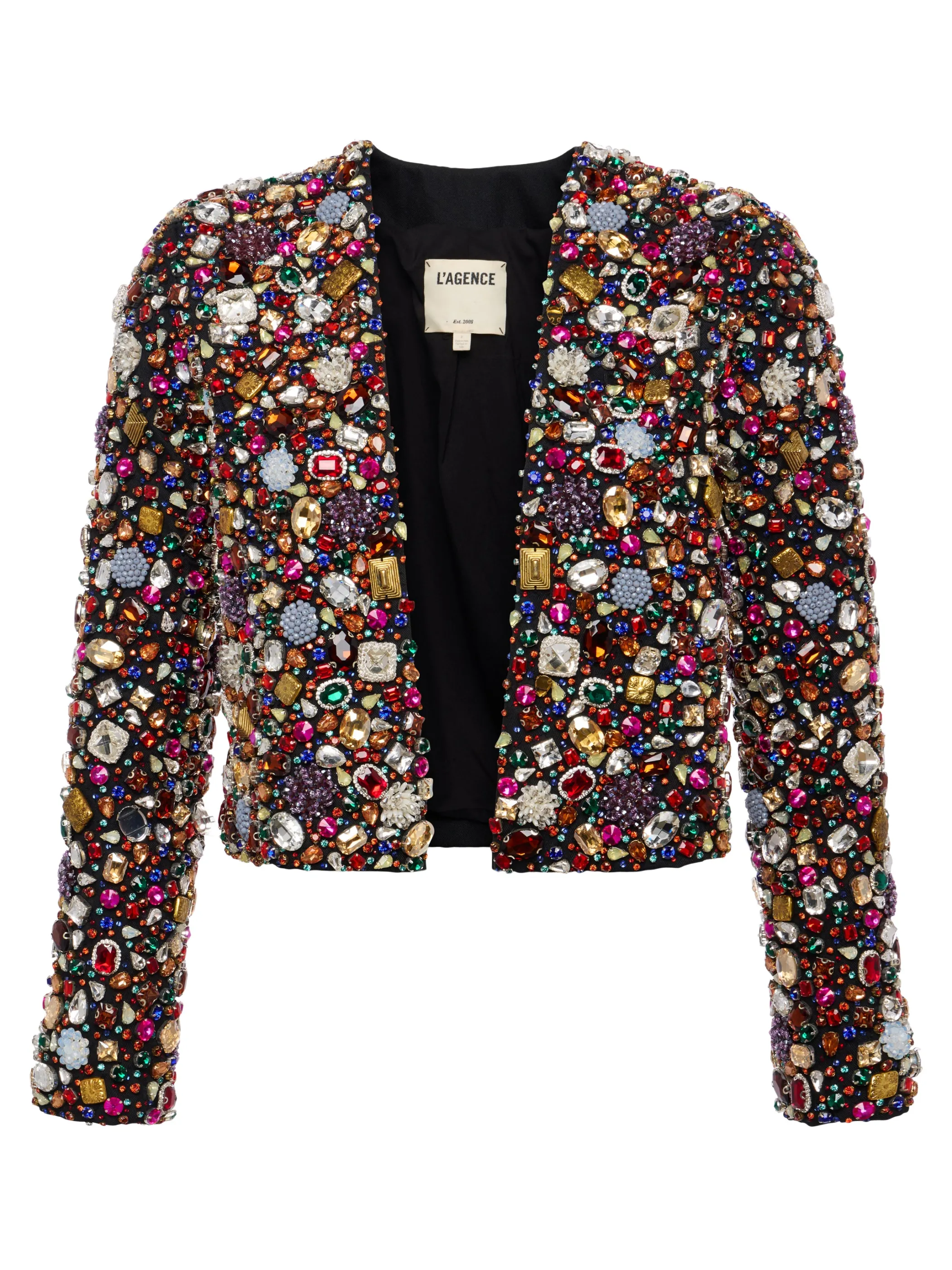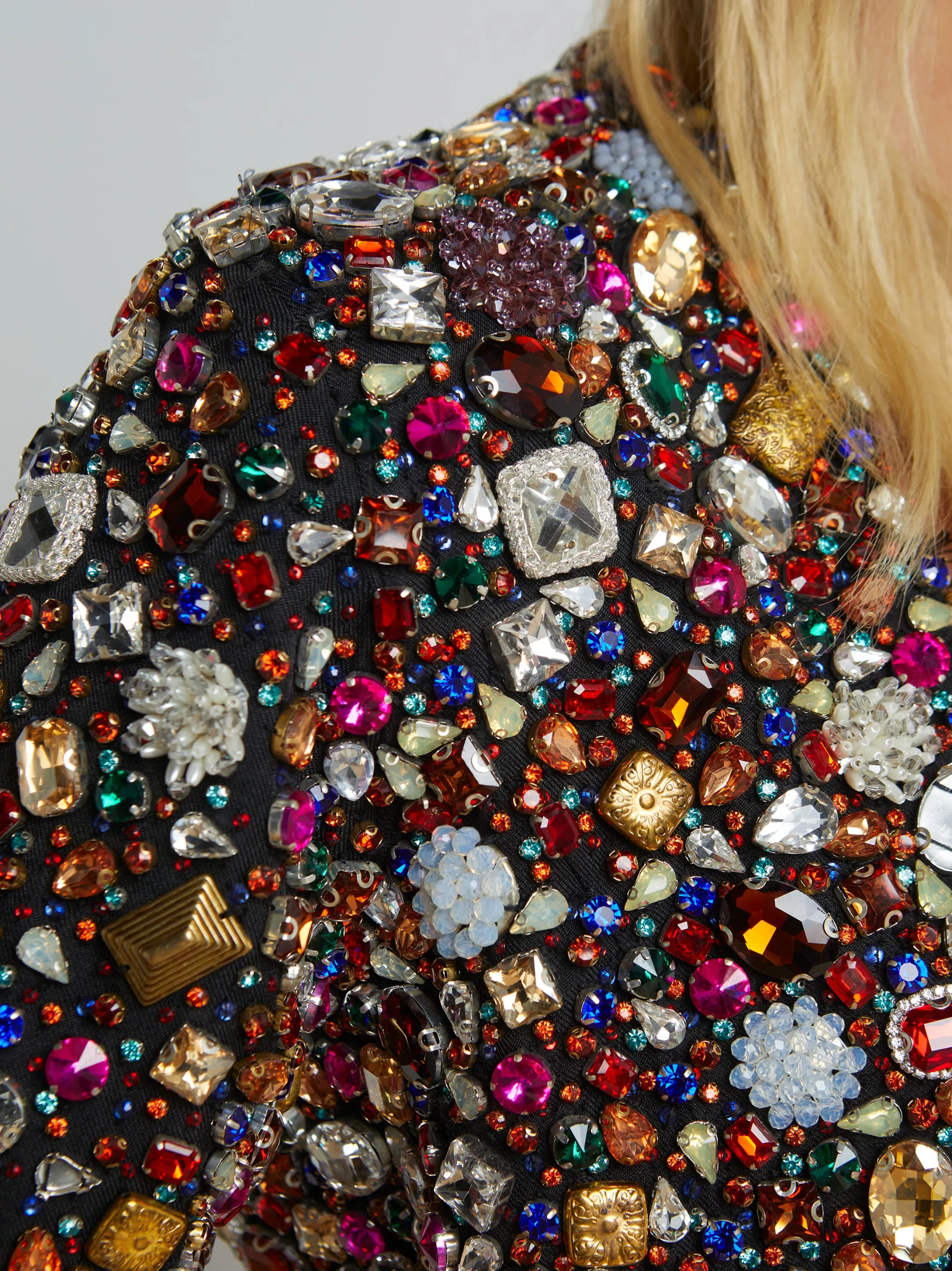 A stunning mélange of 39 different types of crystals in various hues, sizes, and textures adorns the Culver jacket. Each hand-sewn work of wearable art takes 120 hours to complete.