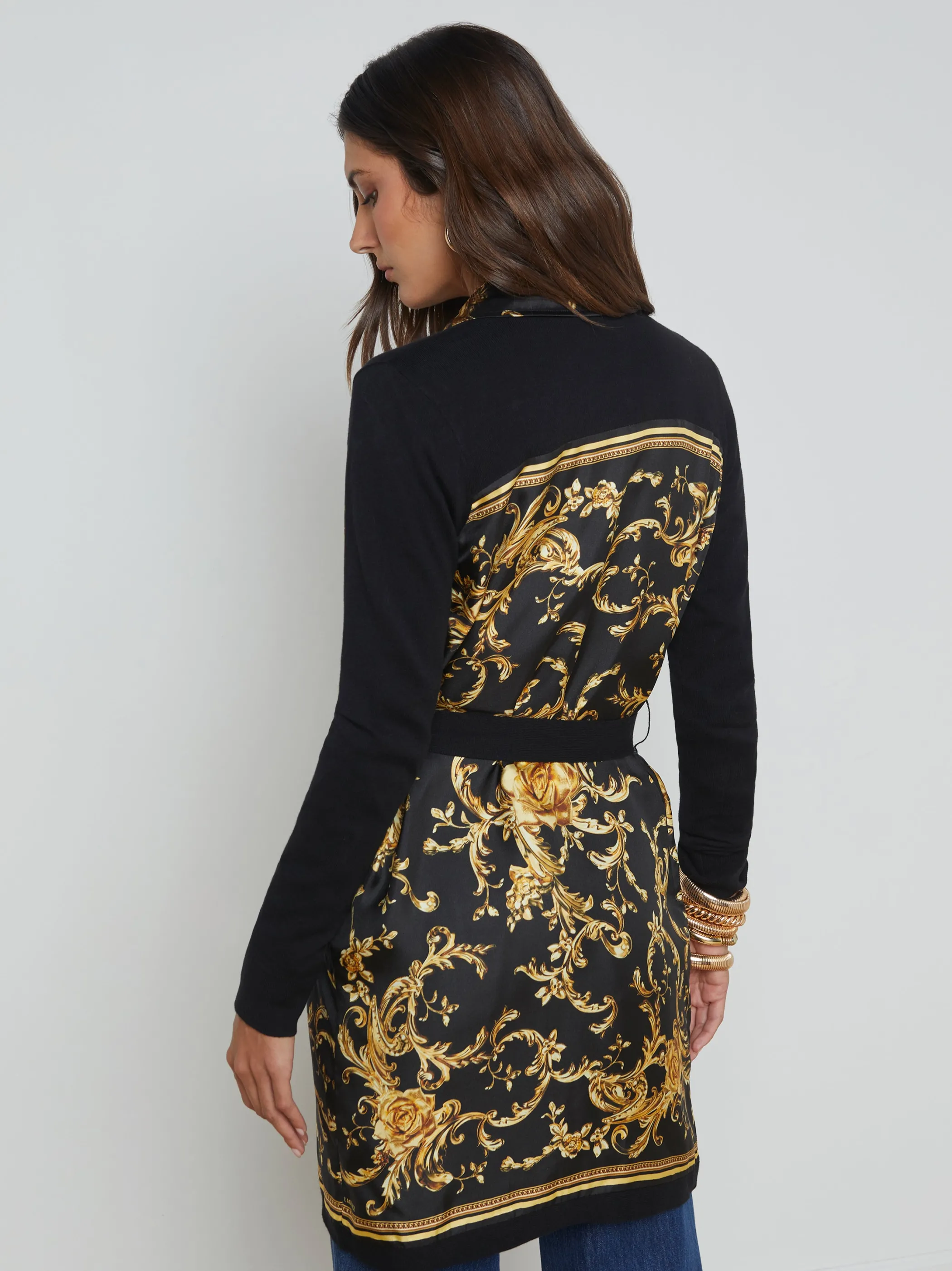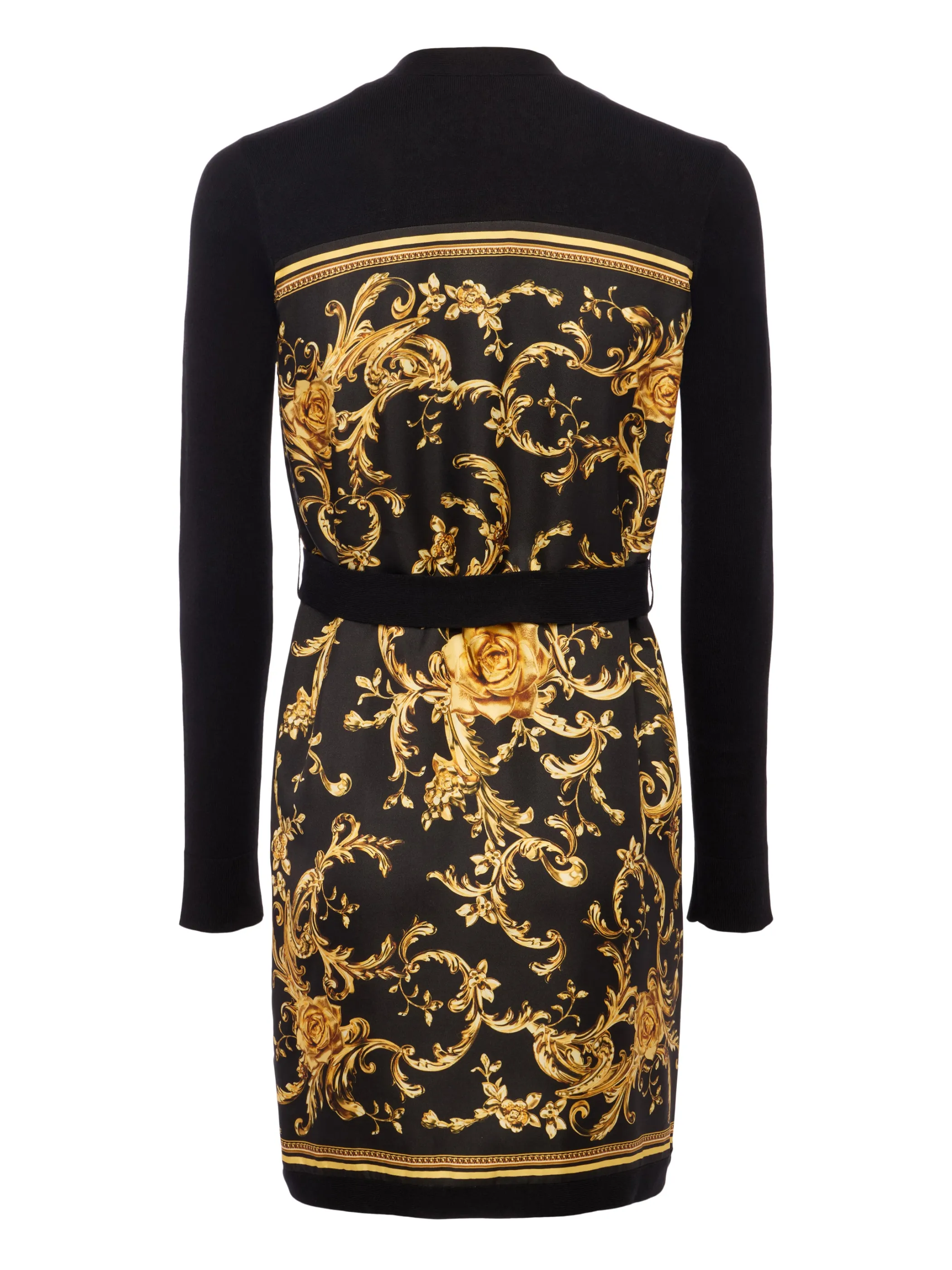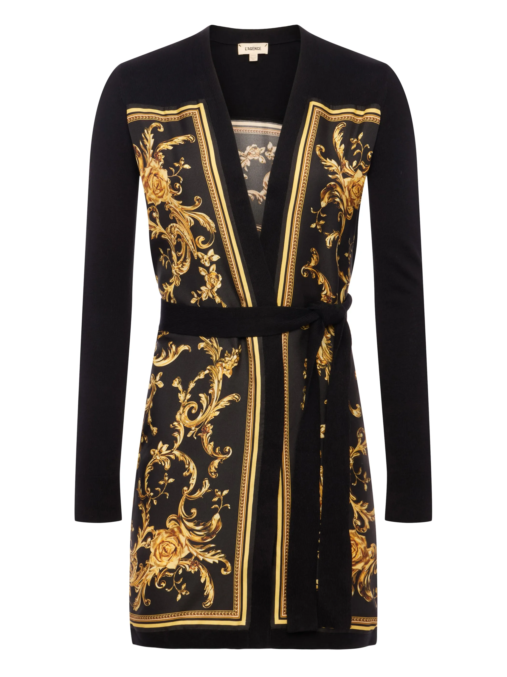 The everyday cardigan gets a sophisticated upgrade with 100% silk panels and a chic barocco print.