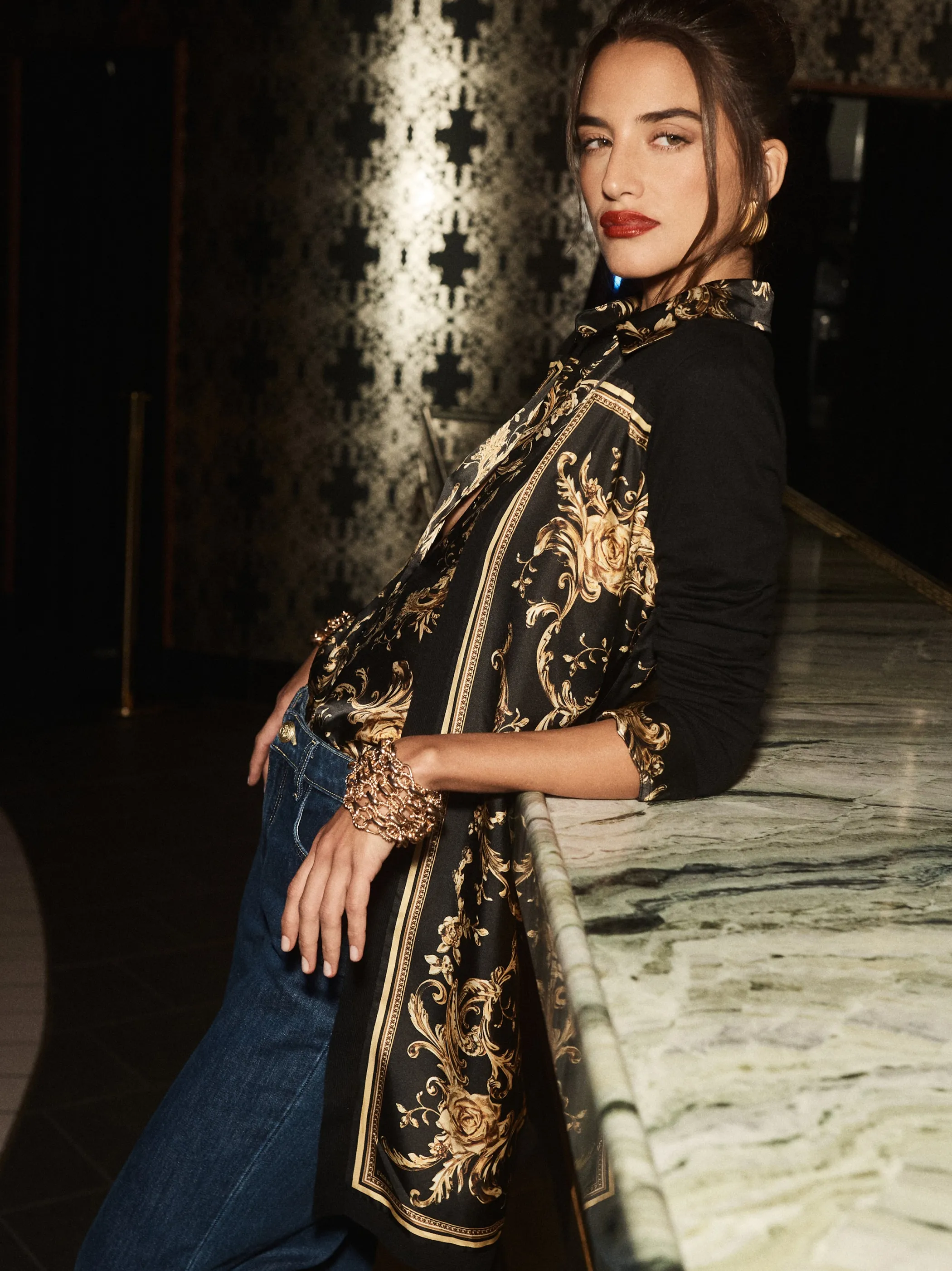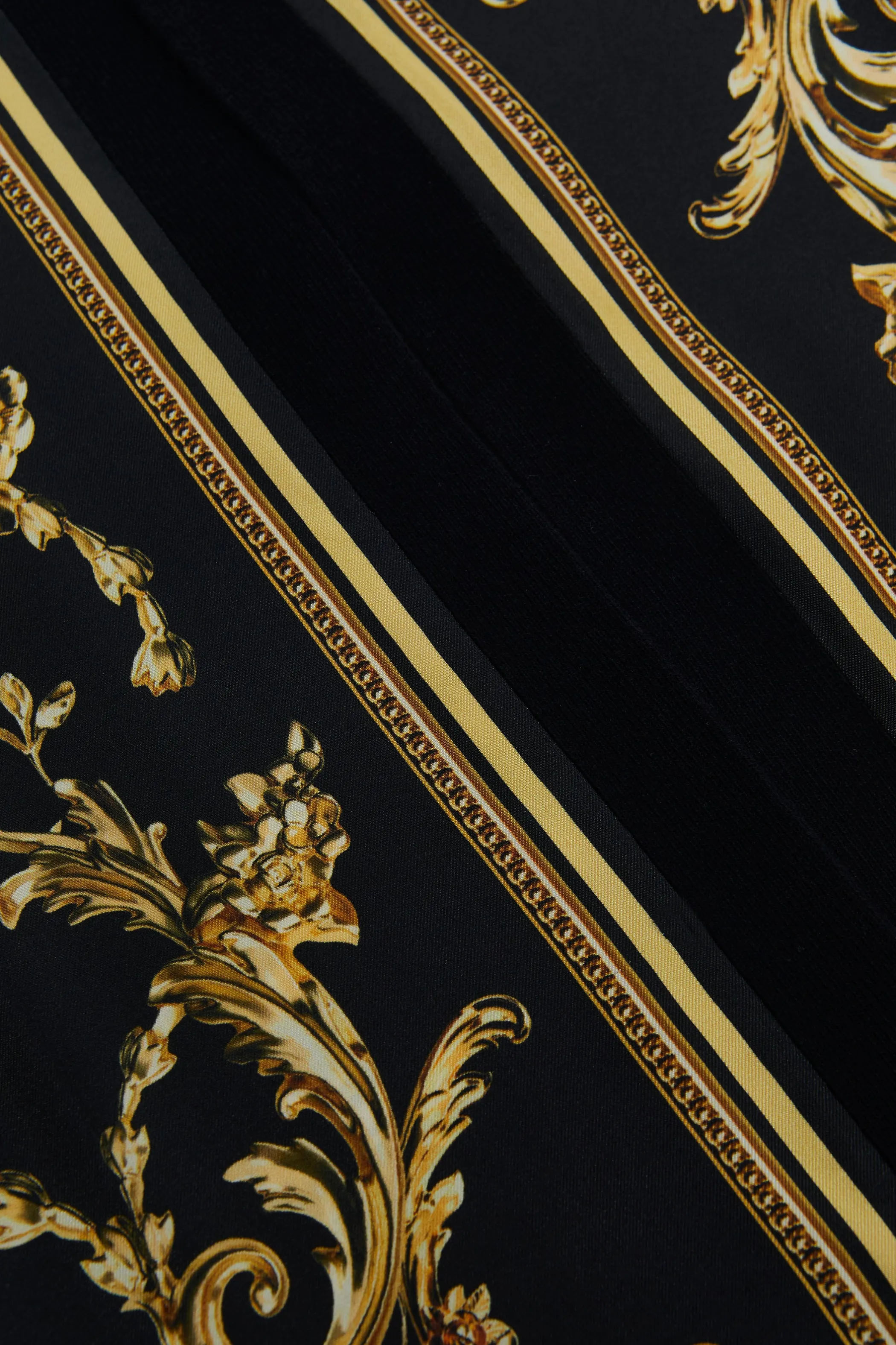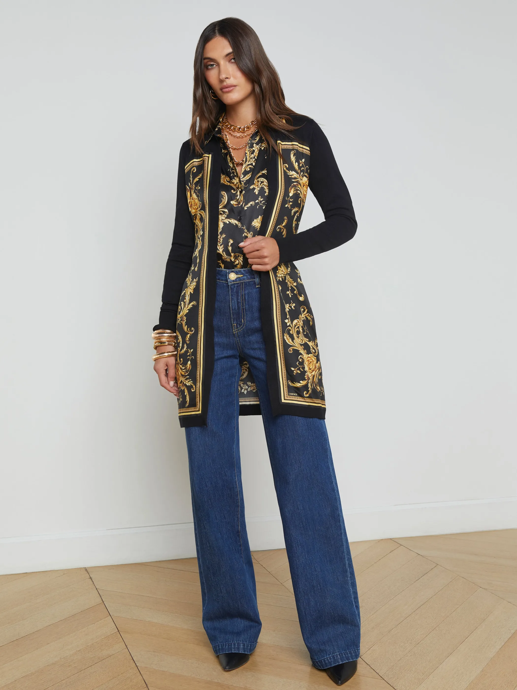 The everyday cardigan gets a sophisticated upgrade with 100% silk panels and a chic barocco print.