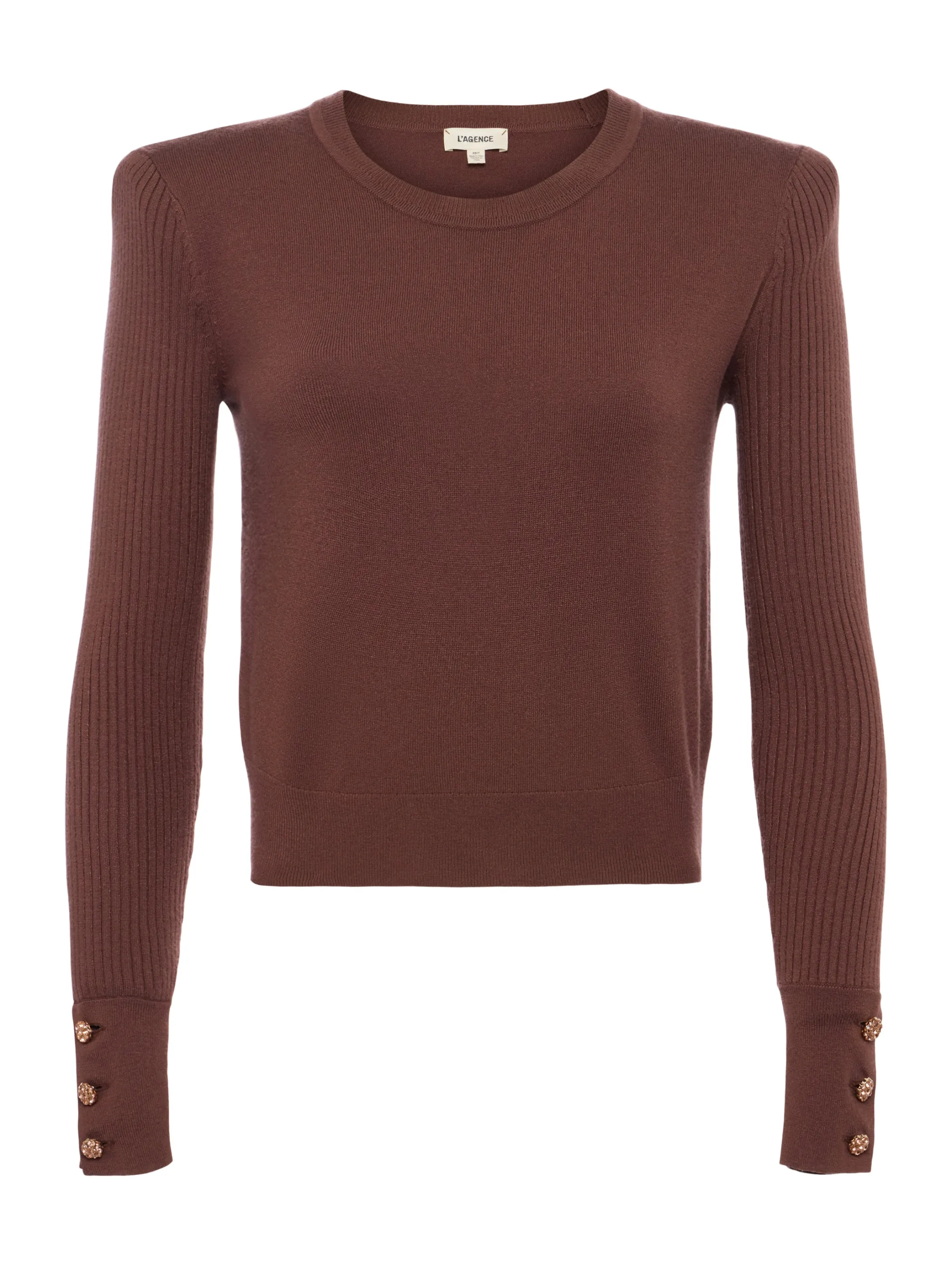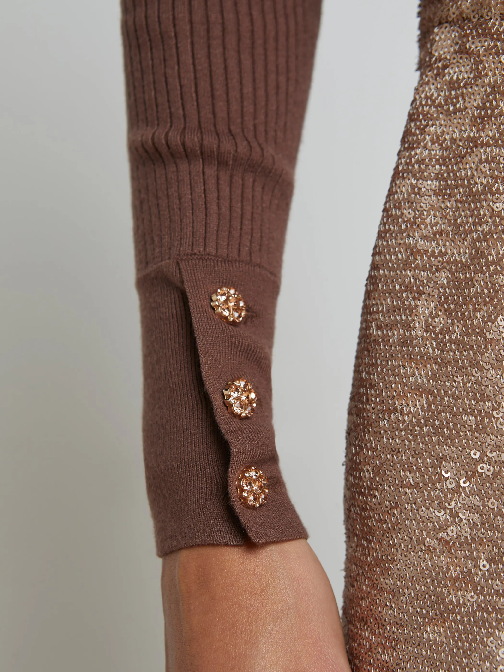 Crystal floral buttons add a touch of glamour to this lightweight crewneck sweater.