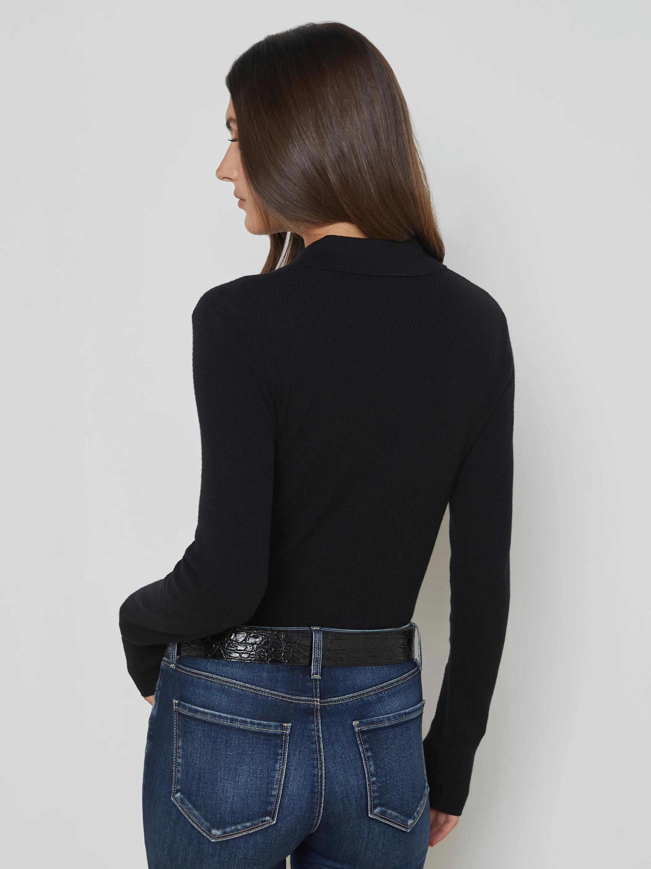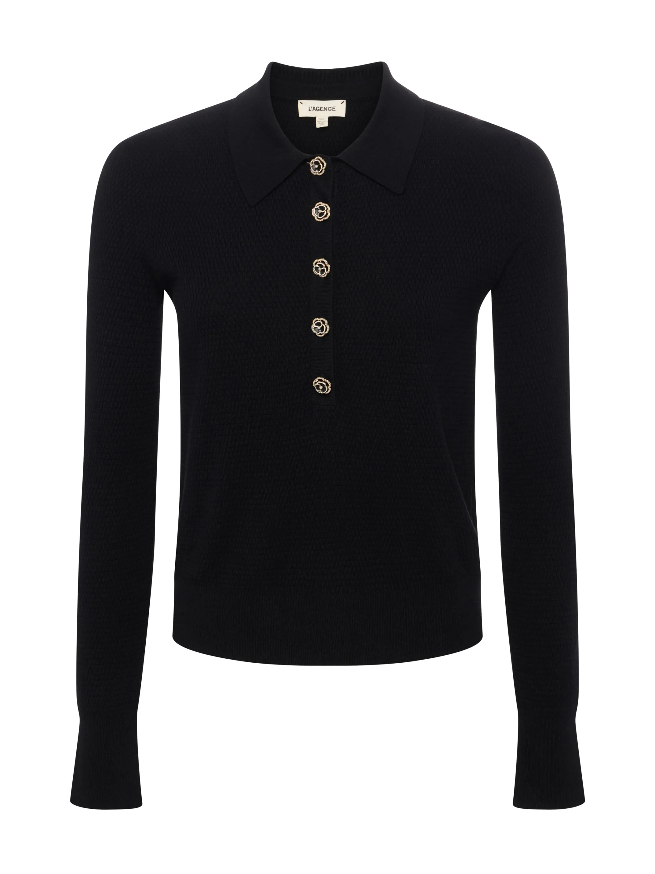 The L’AGENCE essential long sleeve knit and one of our fashion director’s favorite closet heroes. Now in a versatile black accentuated with floral buttons.
