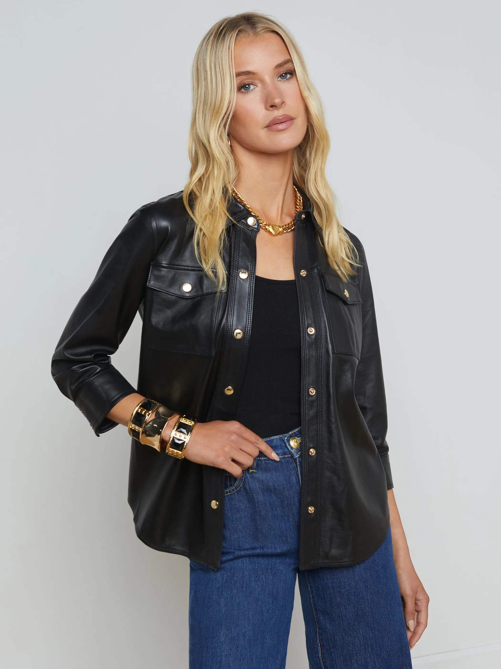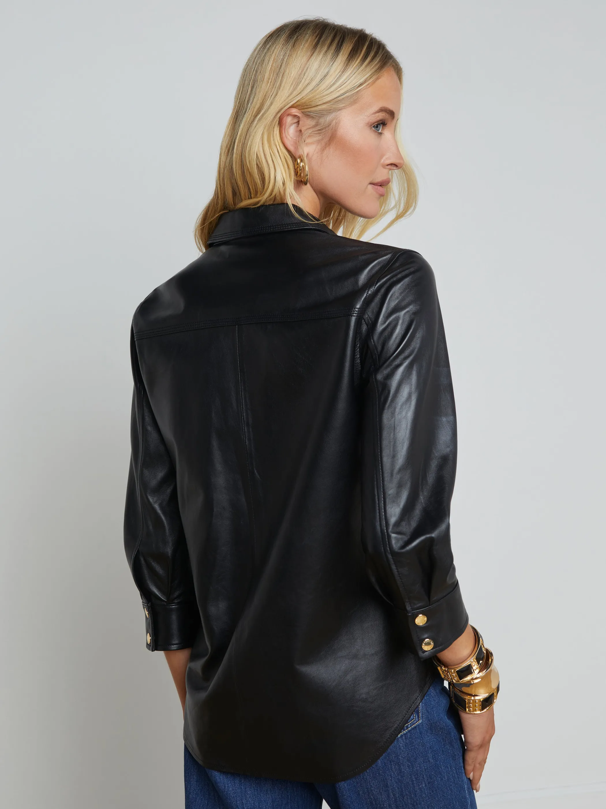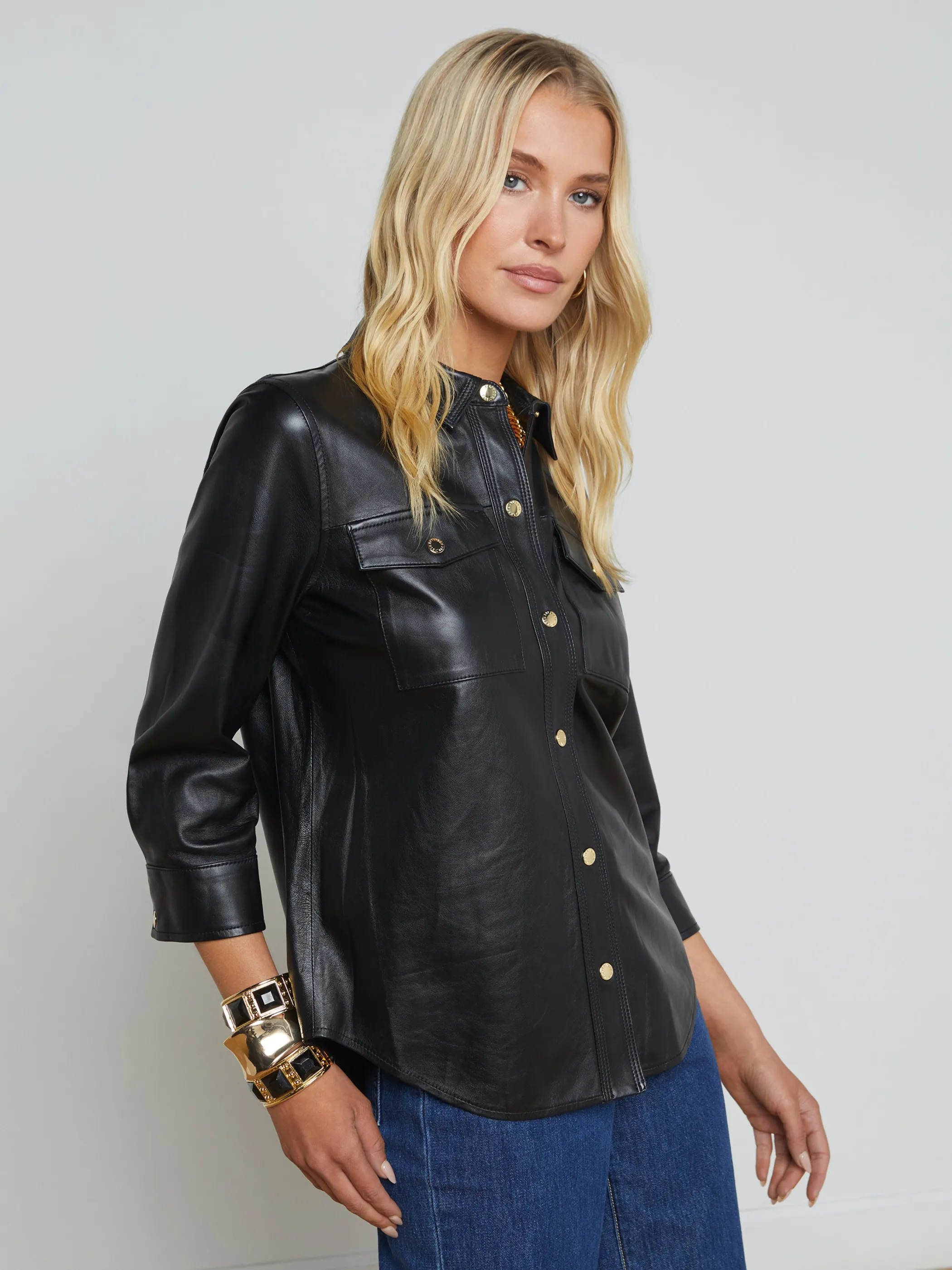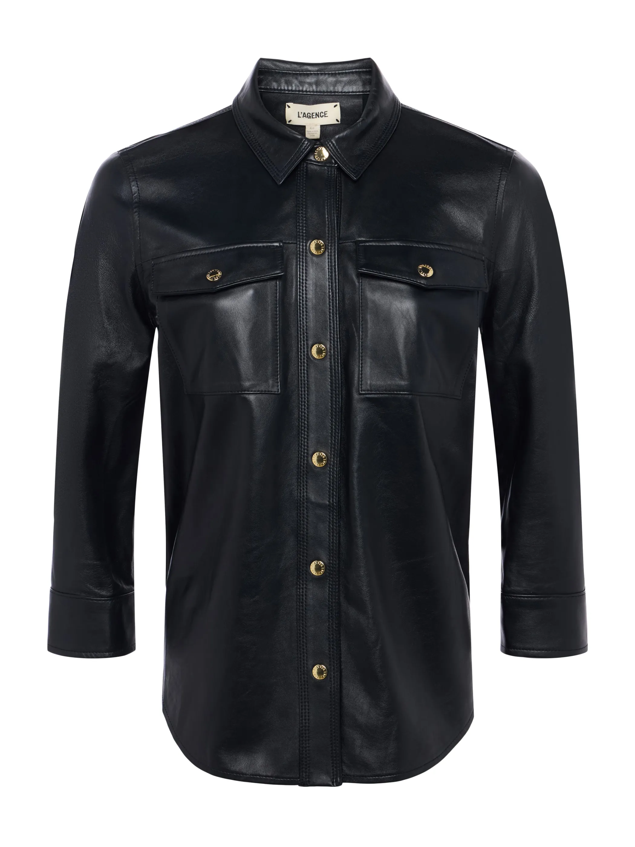 Meet your new hero piece, in supple, lightweight leather. Three quarter sleeves and gold snap buttons add a feminine twist. Wear it as a top or second layer now and forever.