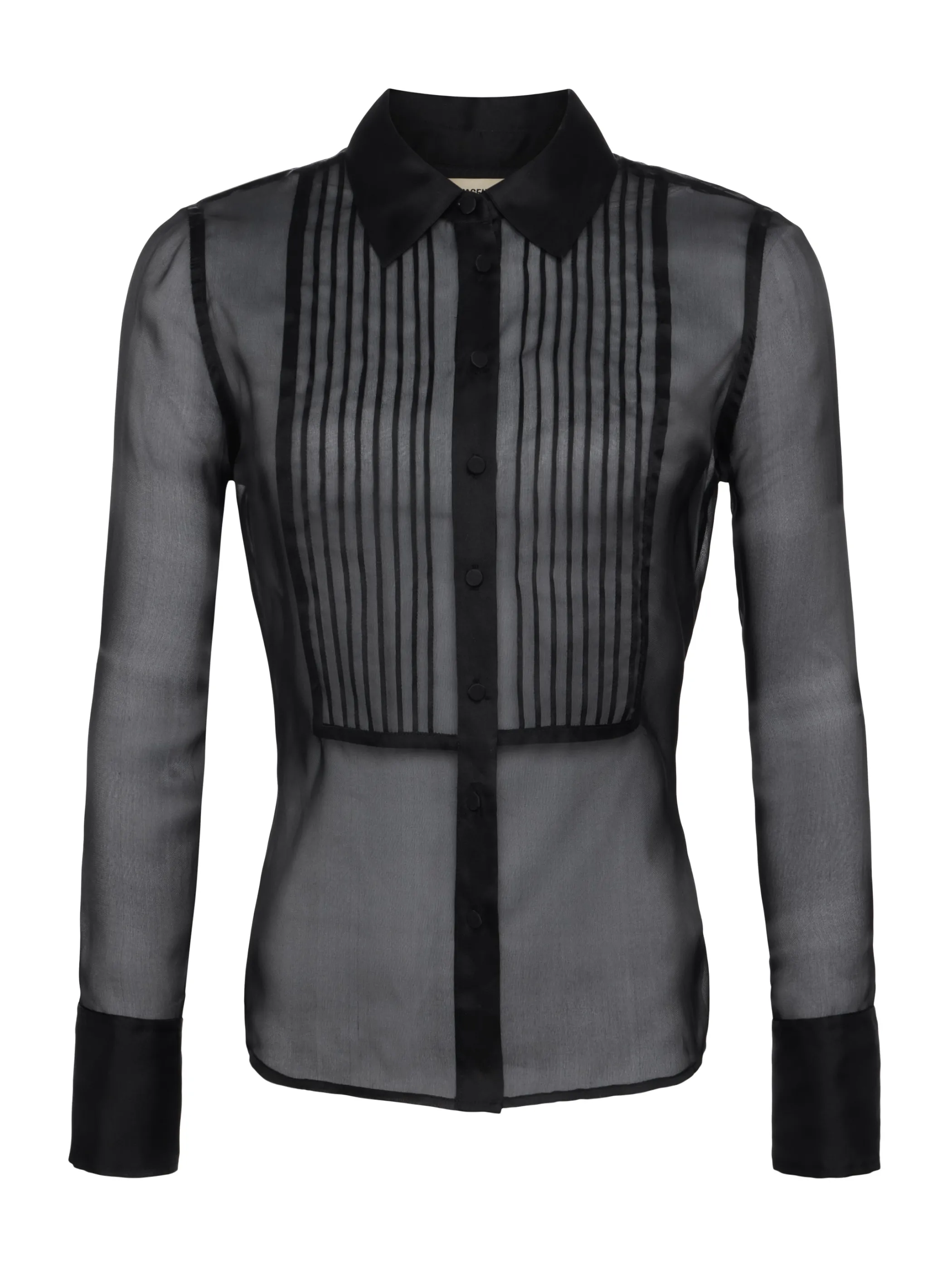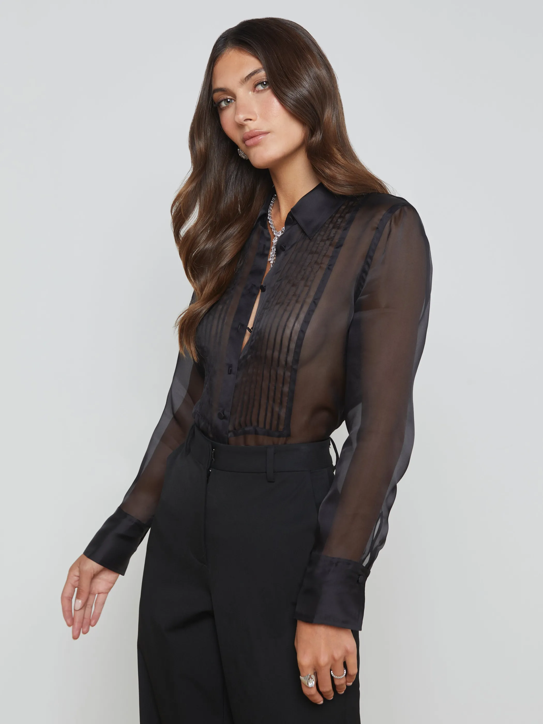 Meet the feminine version of the classic tuxedo shirt, crafted with breathtaking, sheer silk organza.