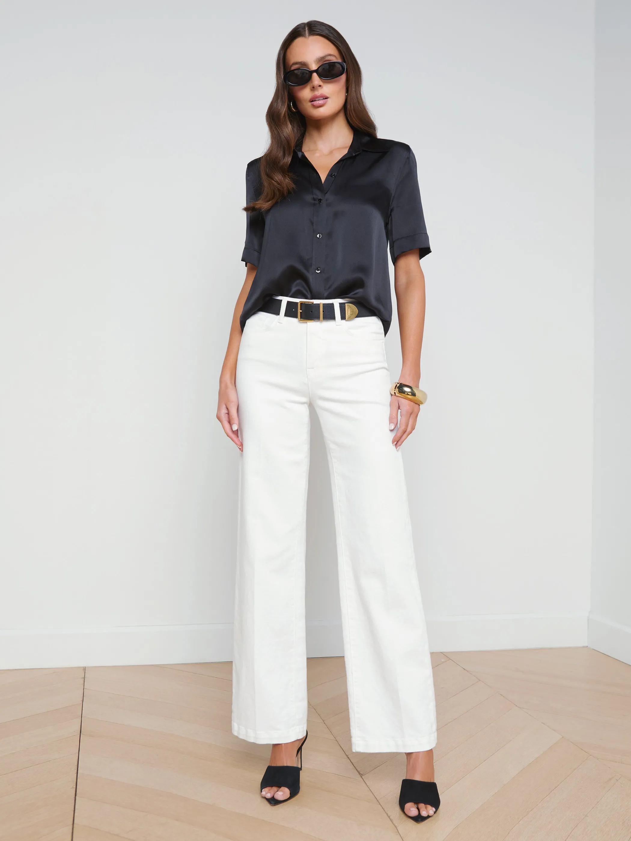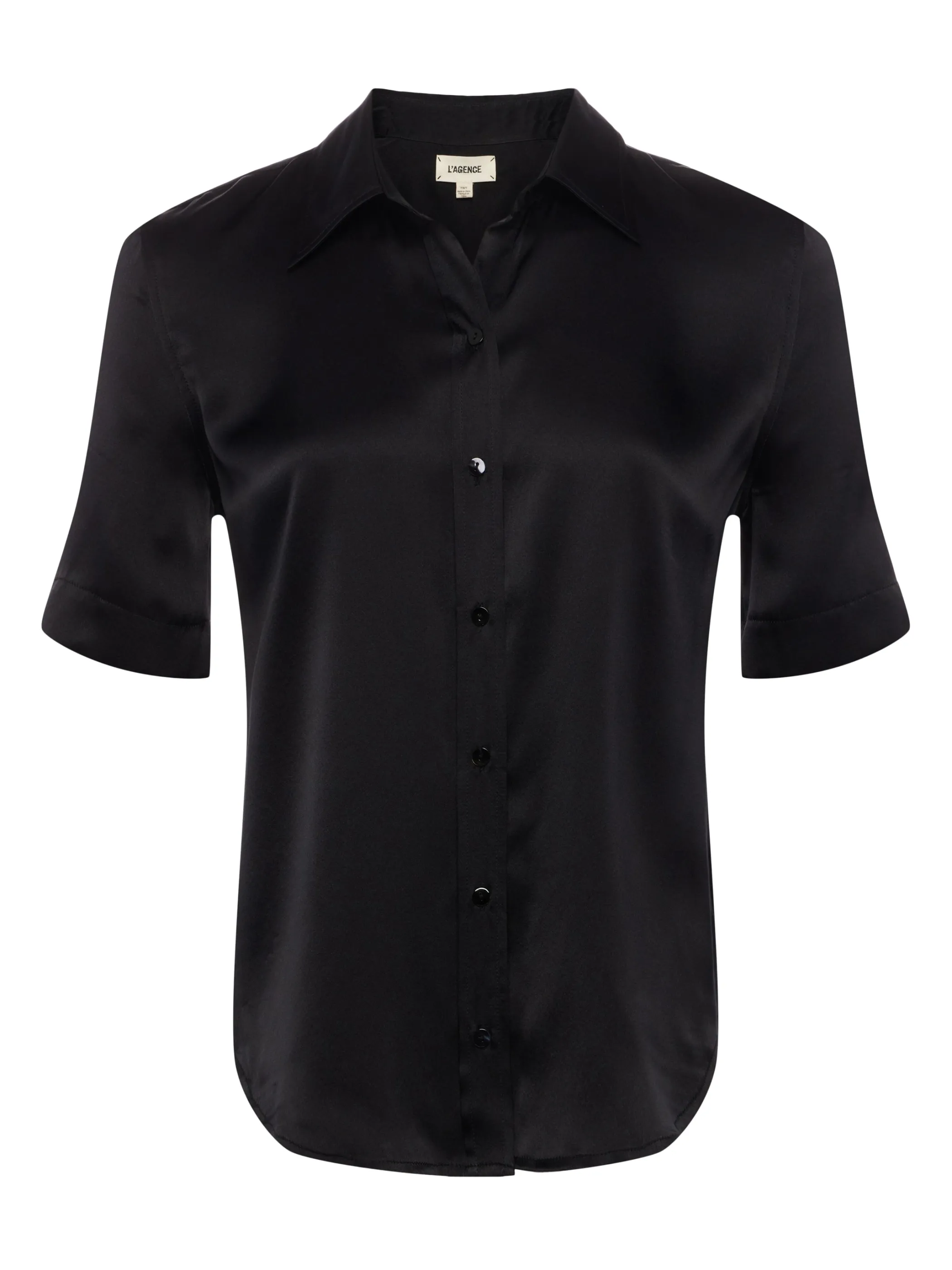 Introducing the short-sleeve version of our signature silk blouse: the Ellah. In lustrous silk charmeuse, she falls effortlessly over the figure for a flattering fit. Shirting details like a trim collar, back yoke and shirttail hem keep her timeless. Pair with white denim for chic summer style.