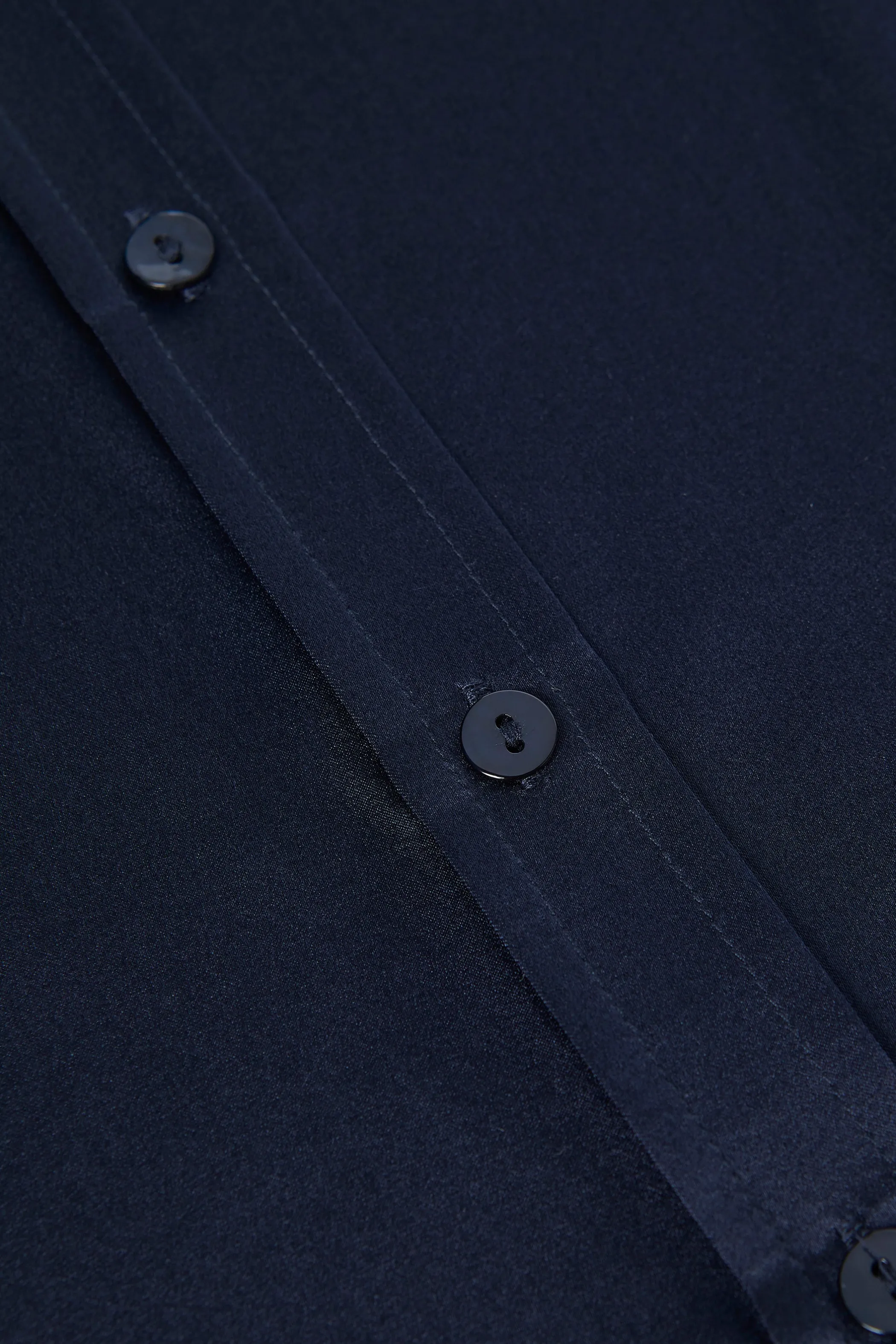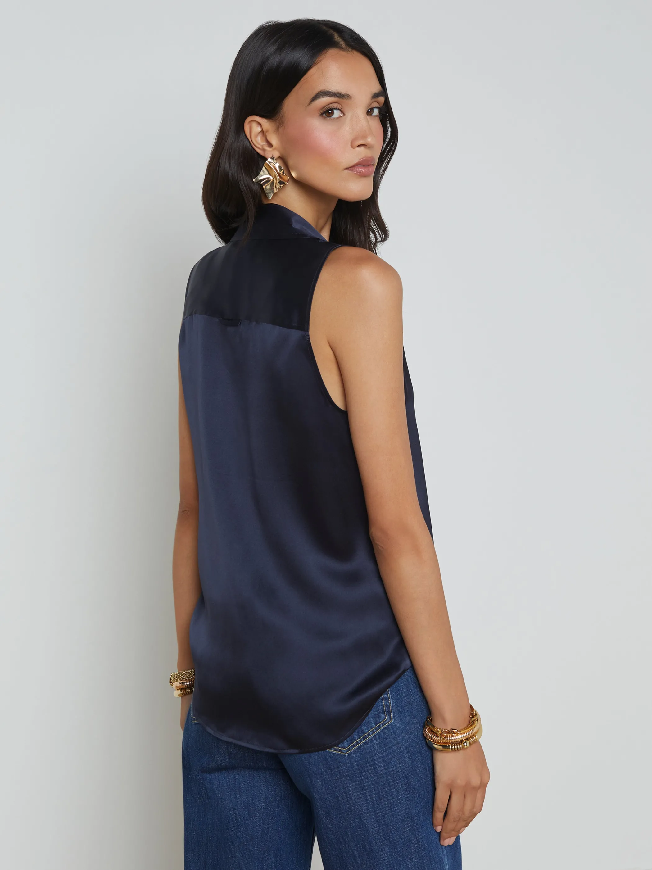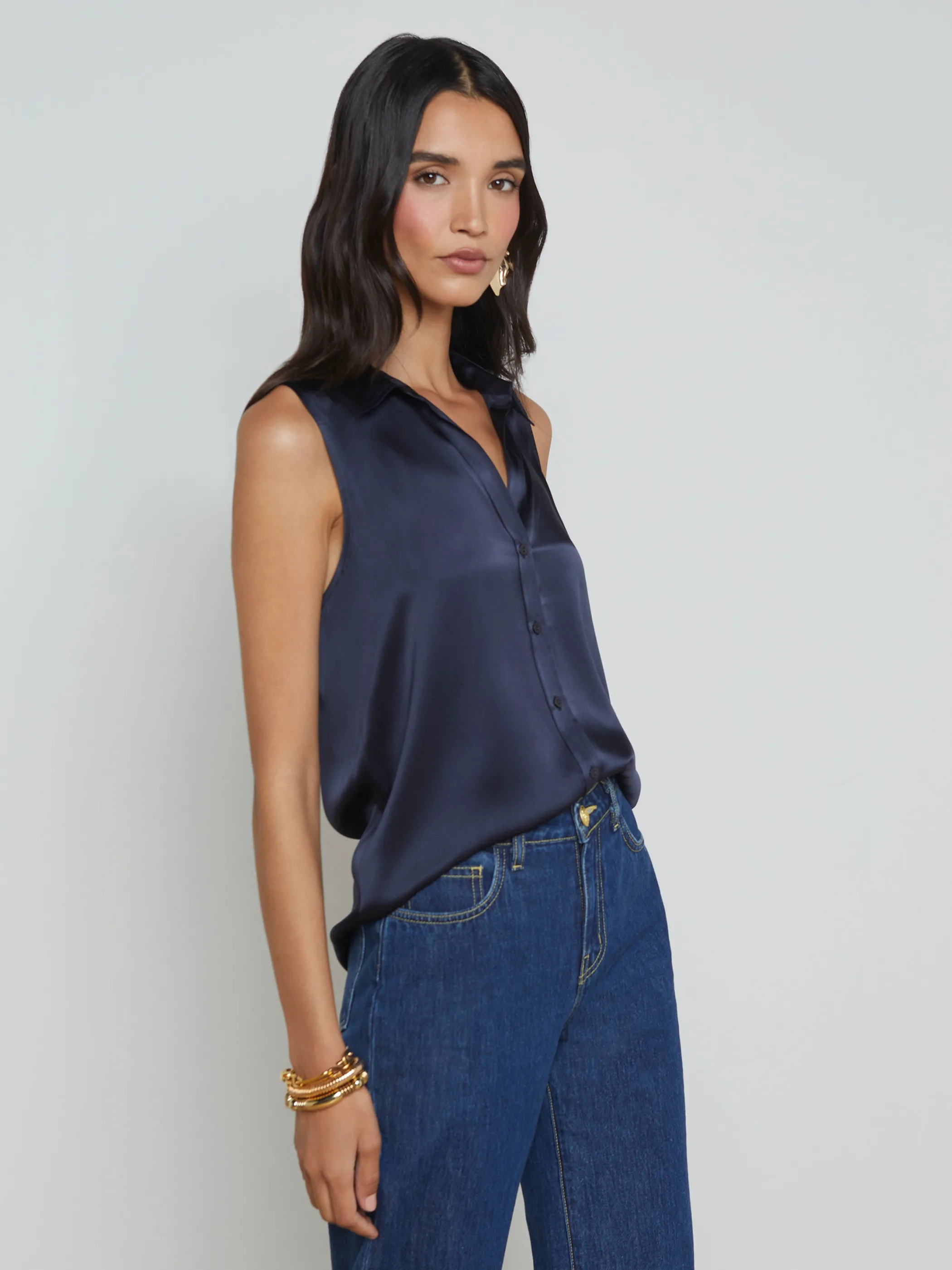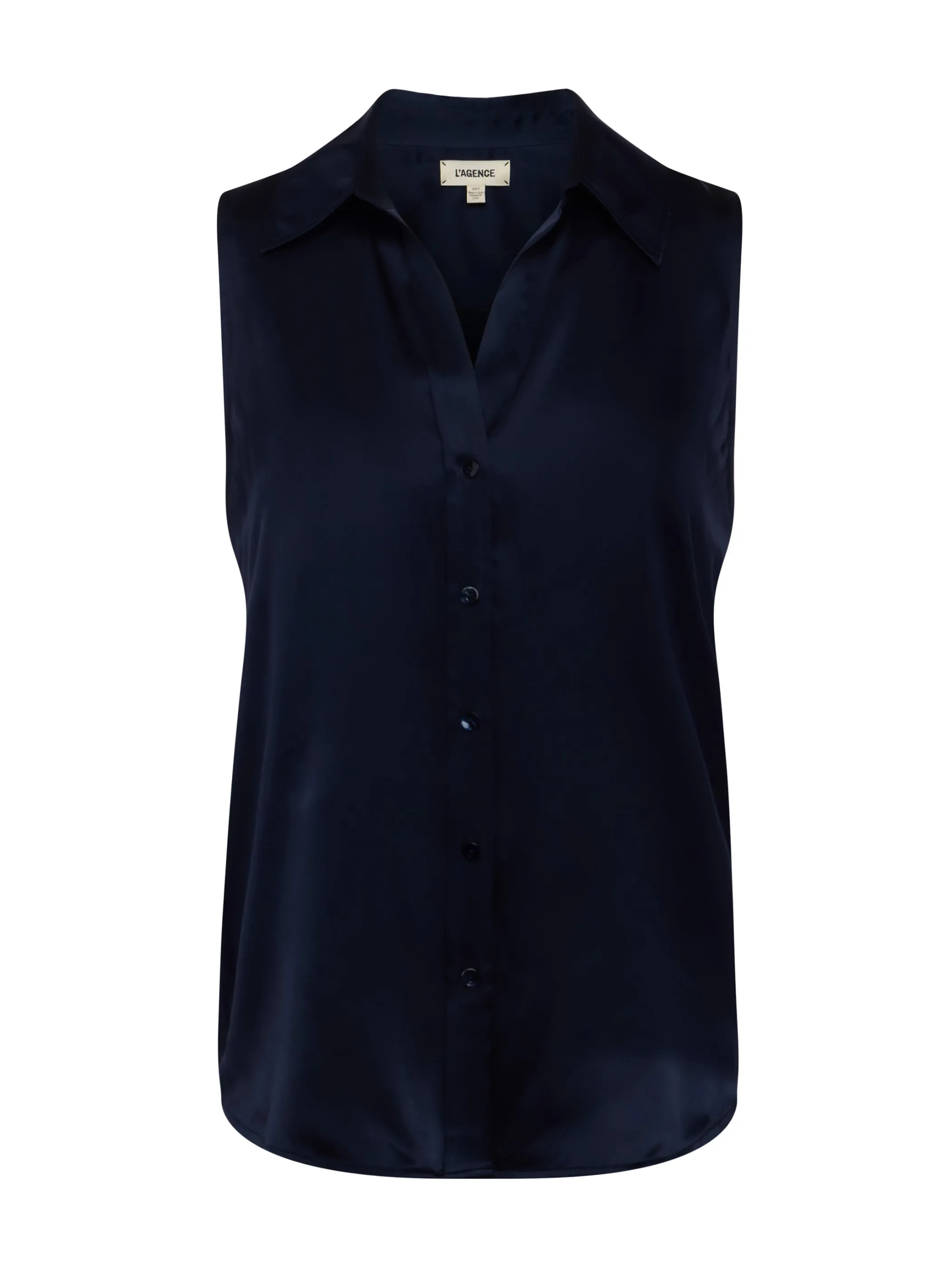 Your essential sleeveless silk blouse, with classic shirting details and an effortlessly relaxed fit in midnight blue. Perfect for office to evening.