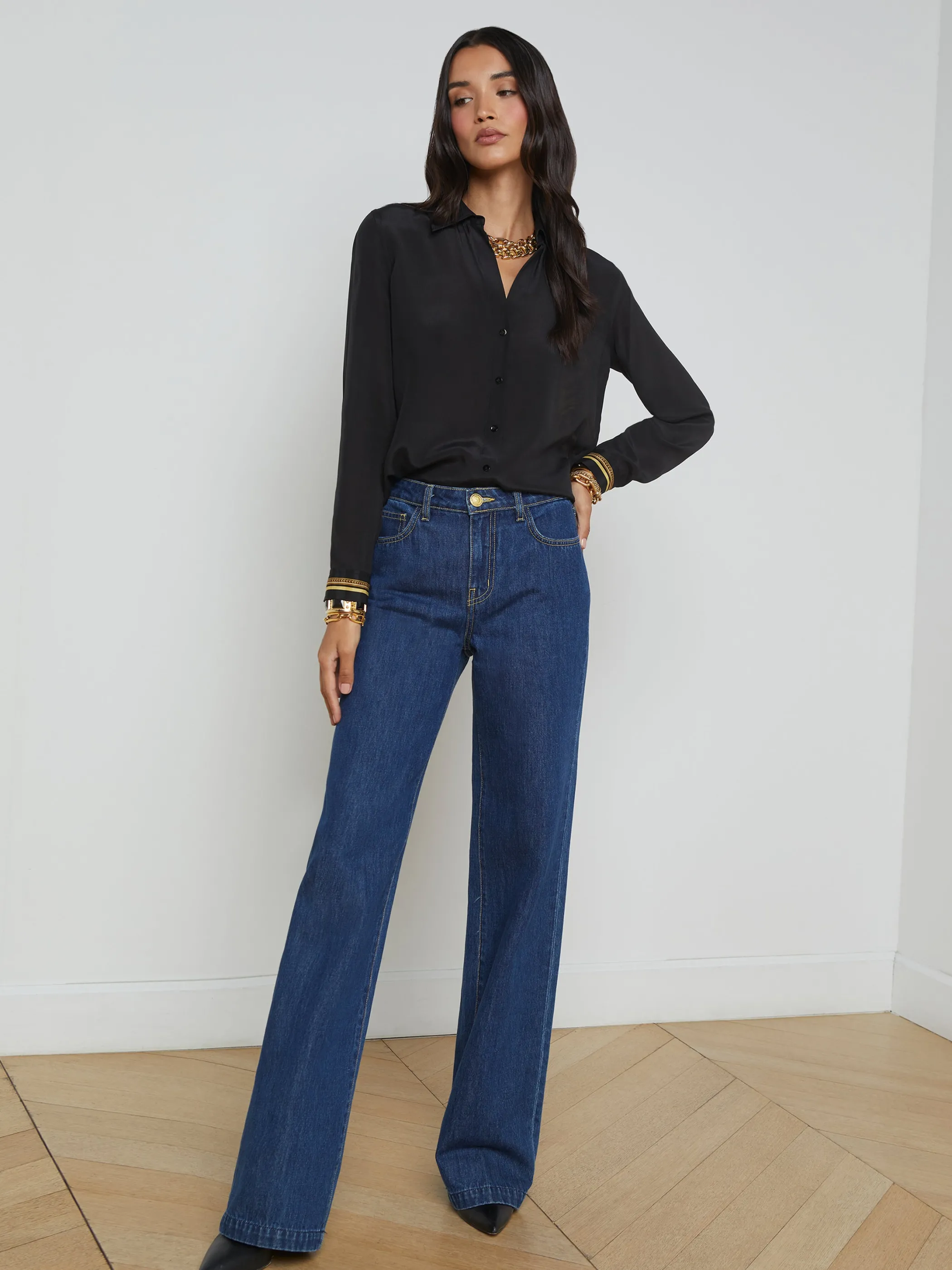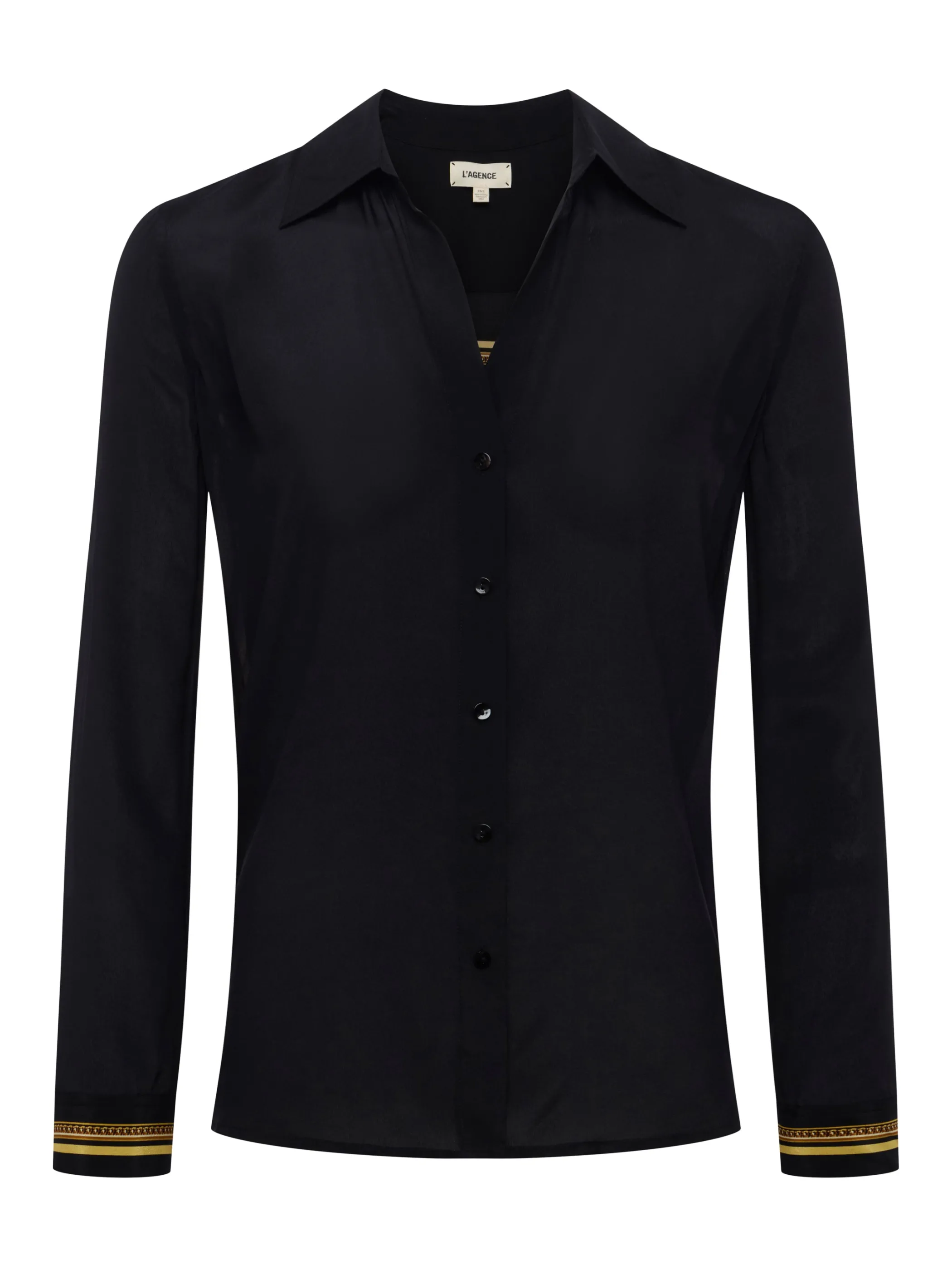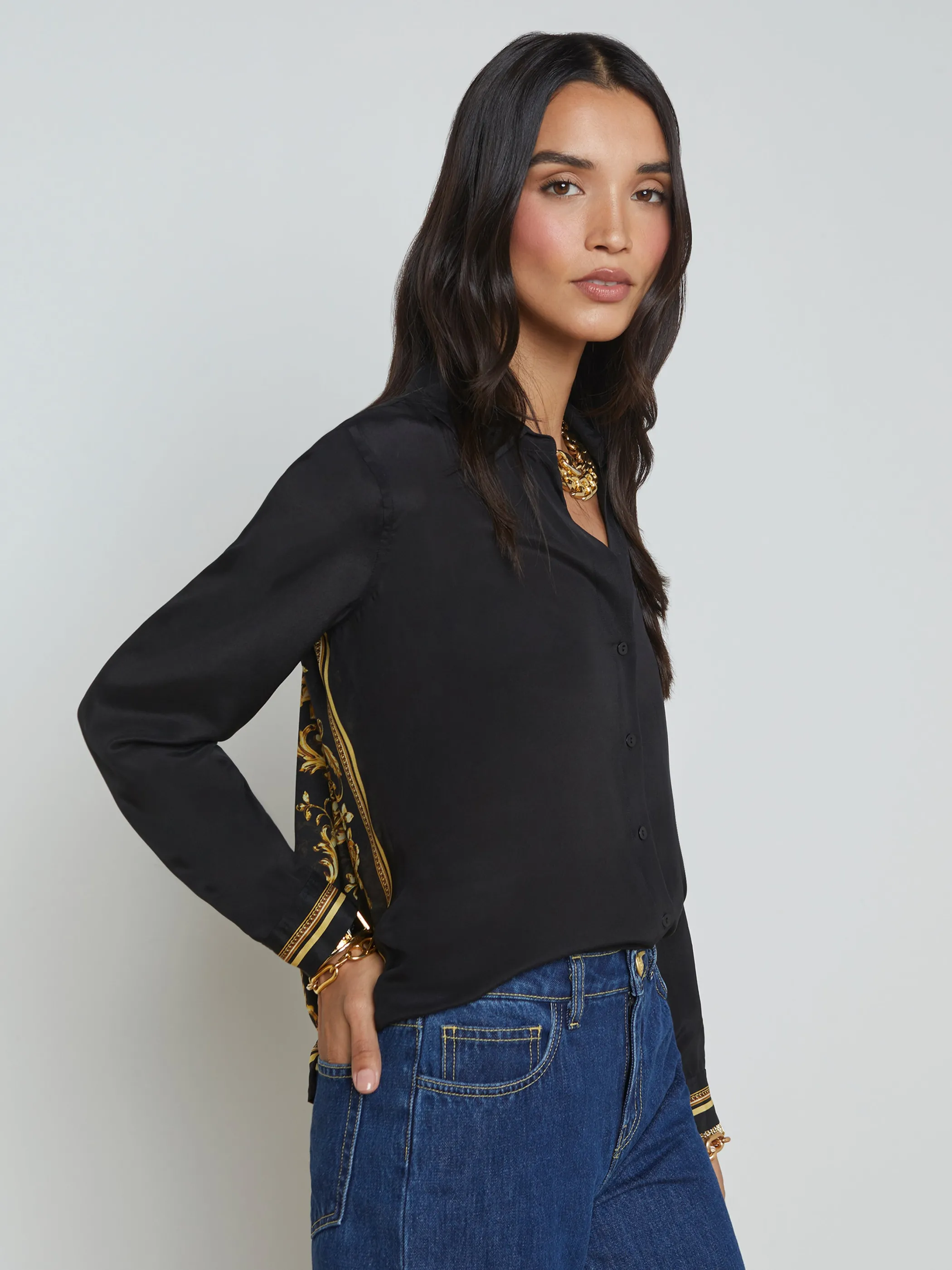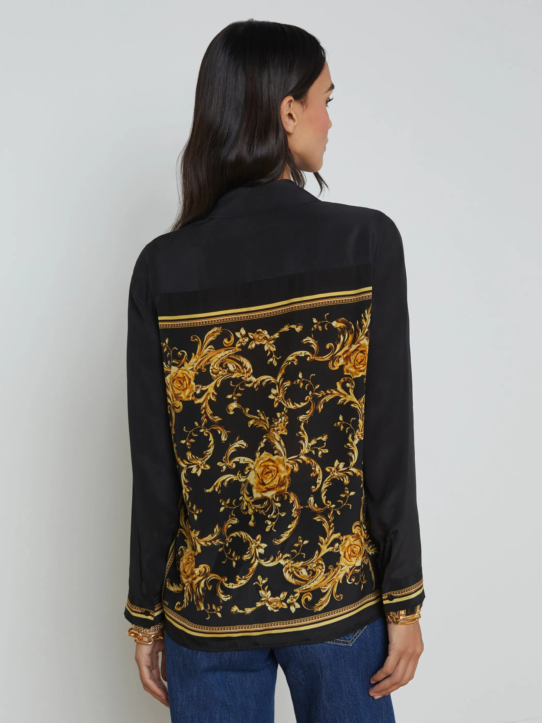 A classic silk button-down from the front and statement piece from the back, the Gio blouse is a L’AGENCE icon and bestseller every season. Now back in a rose swirl print.