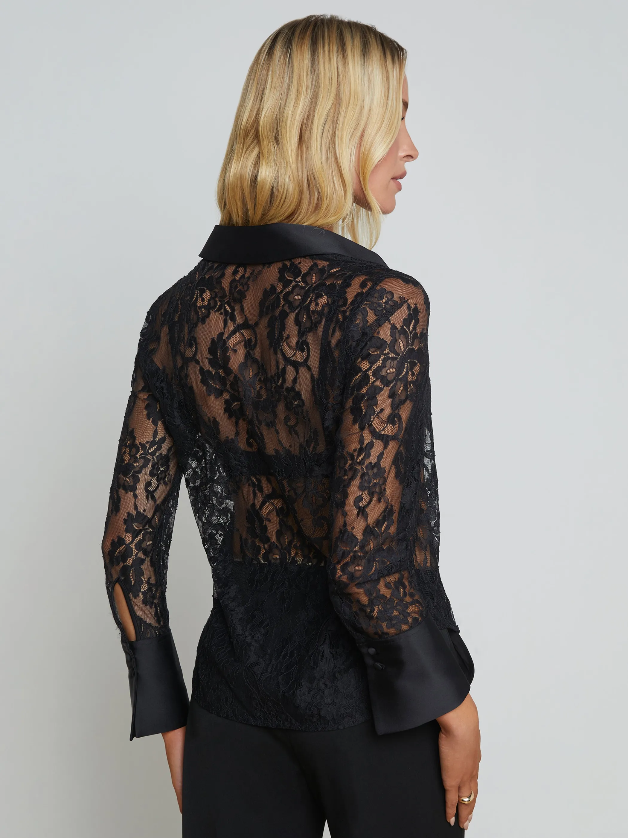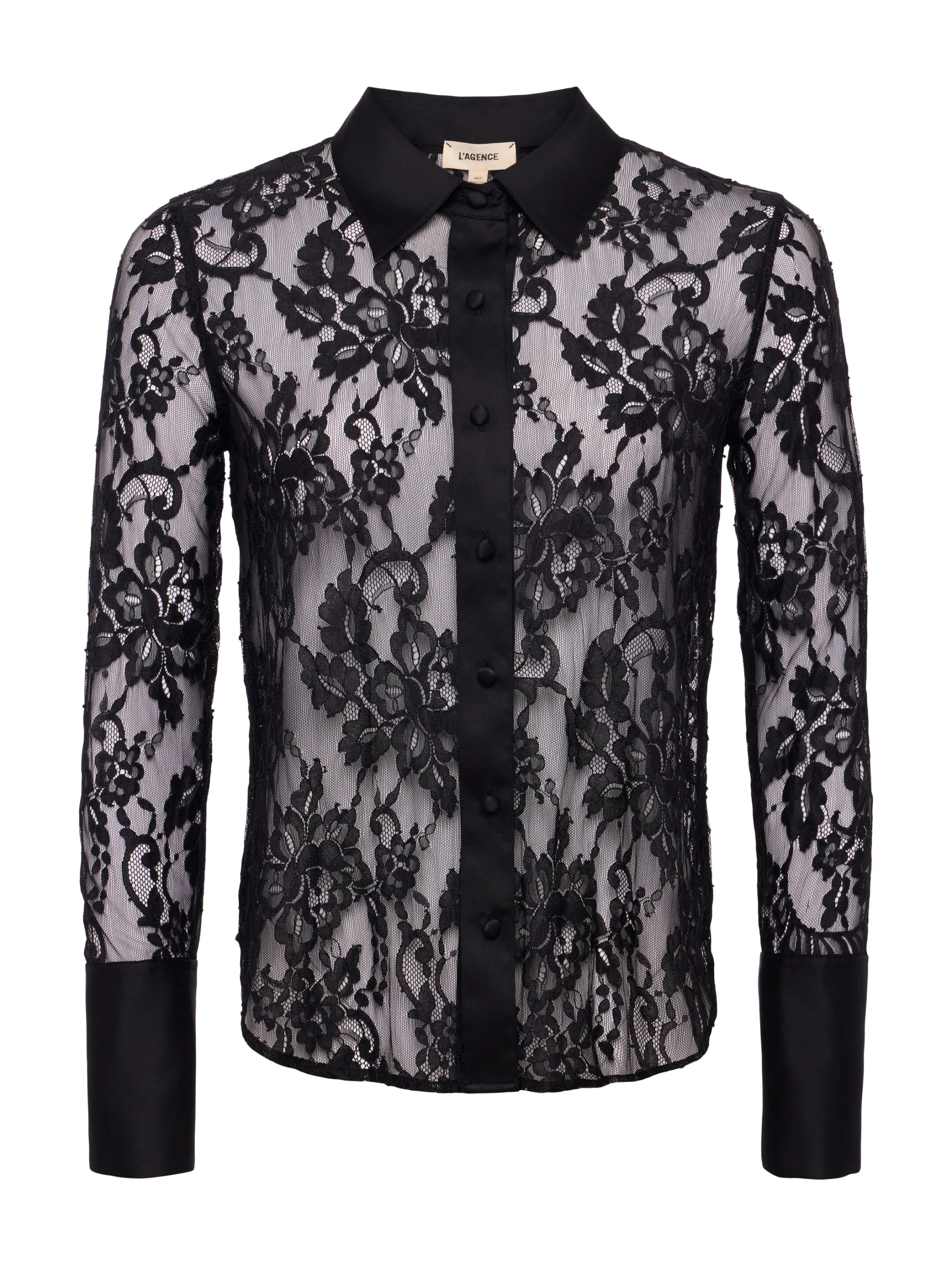 Our ultra feminine take on the classic button-down shirt, the Reims is crafted from a soft floral lace with contrasting satin elements.