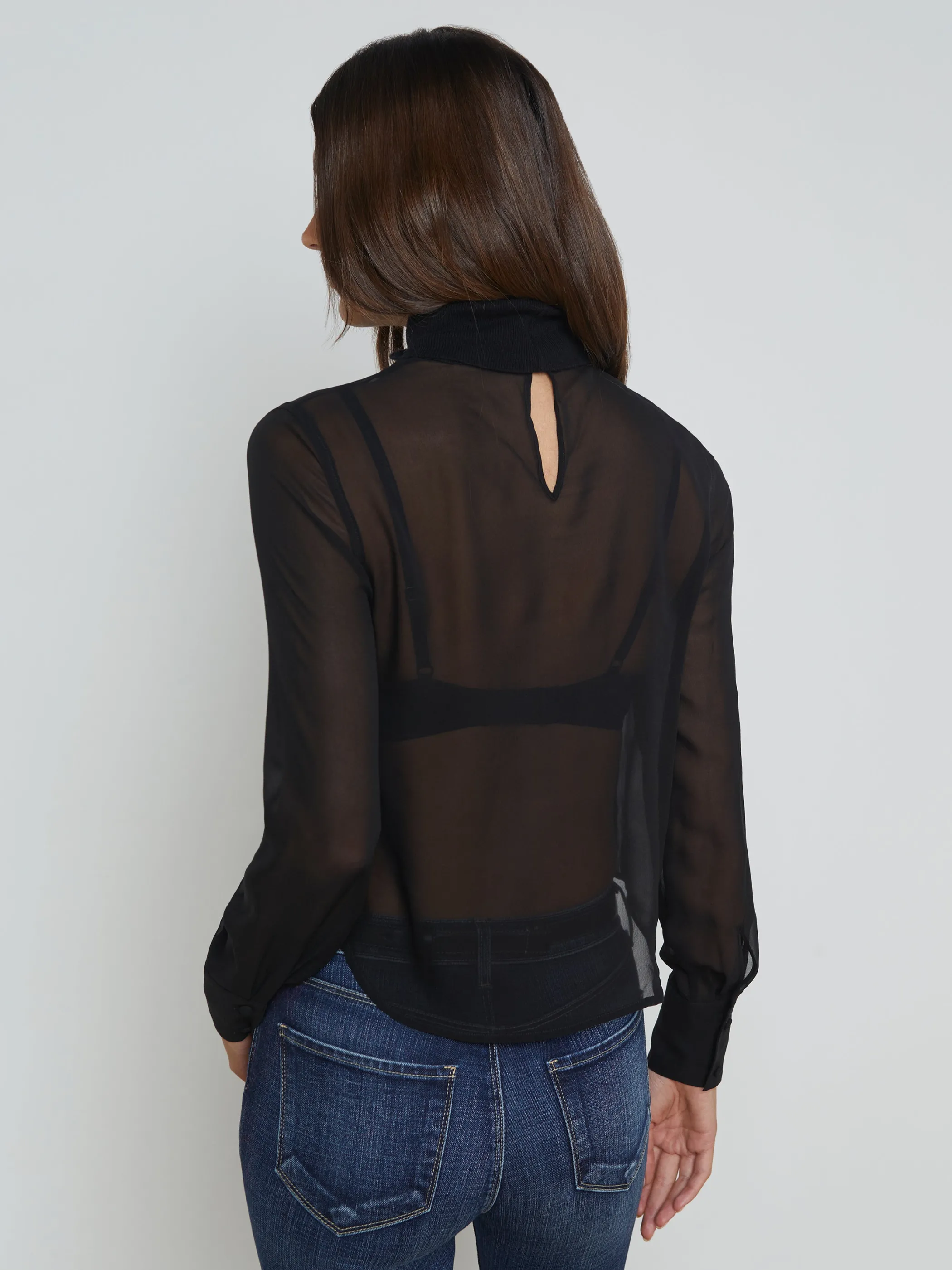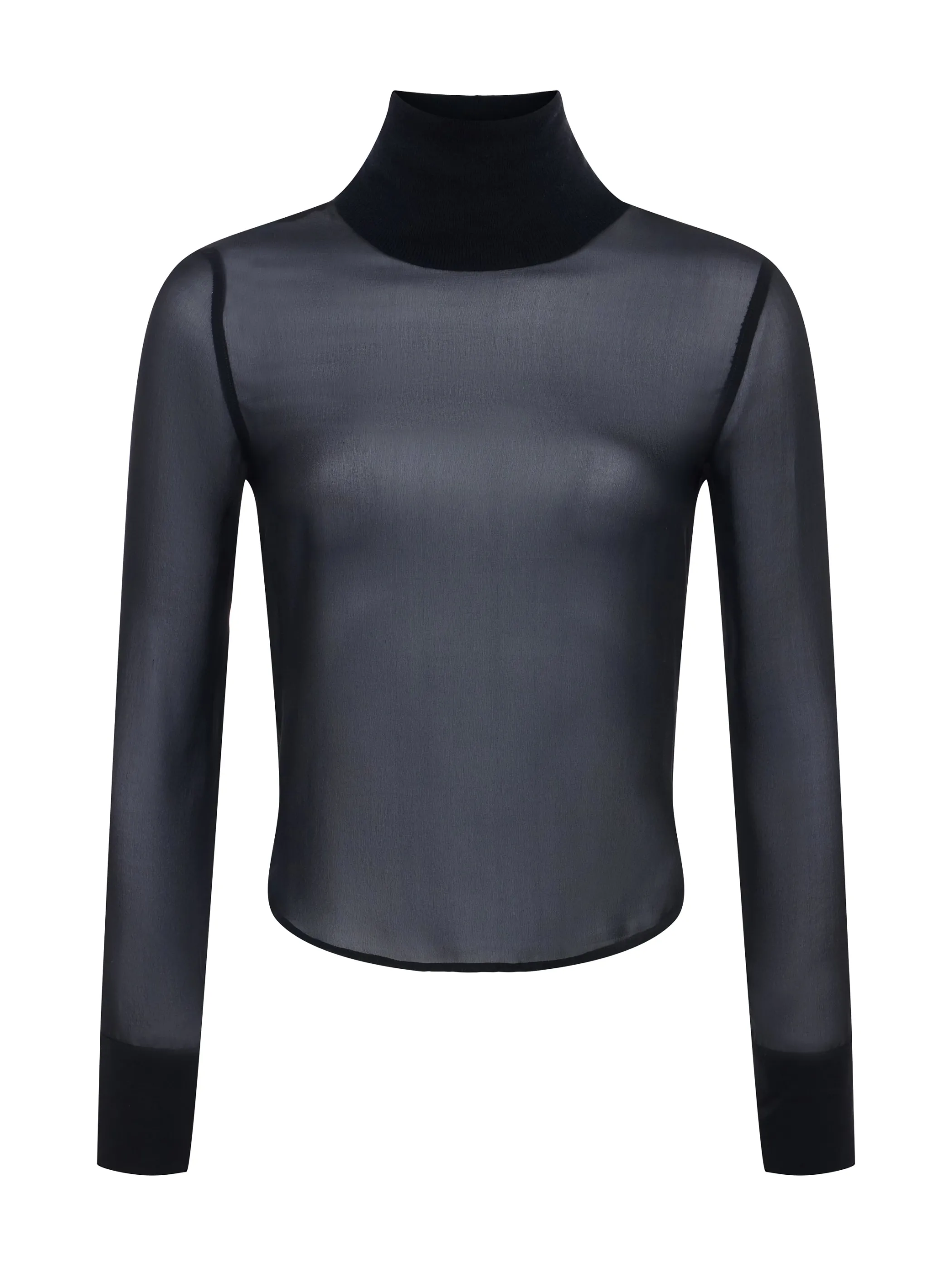 Breathtaking sheer silk chiffon contrasts a ribbed knit turtleneck. Layer Toulon over your favorite camisole or wear alone.