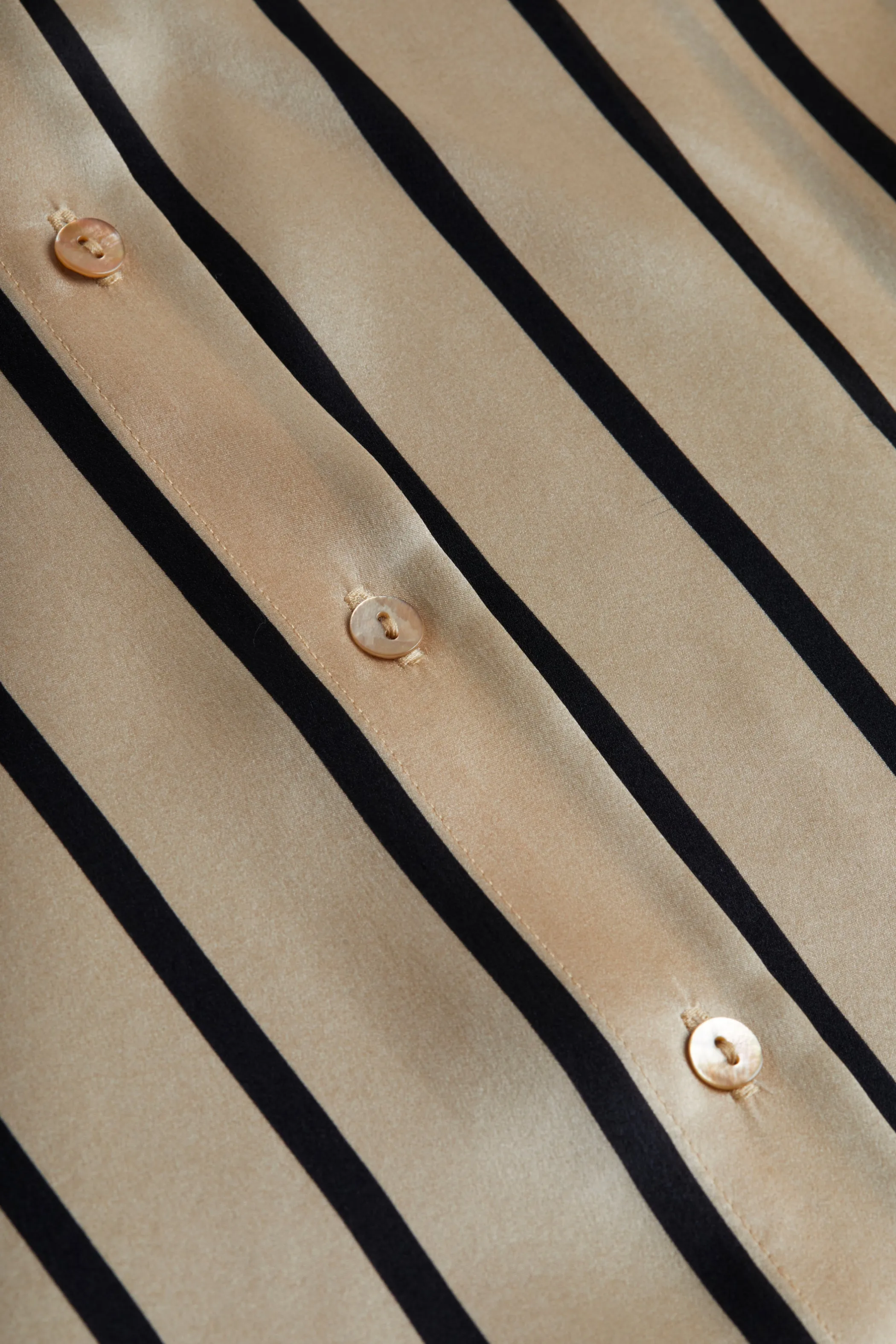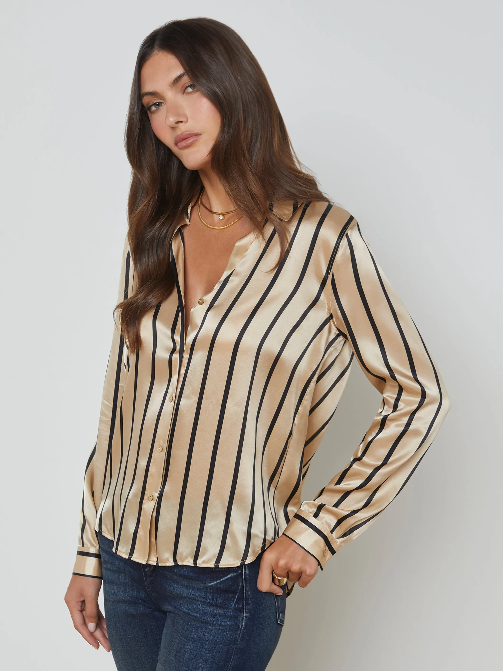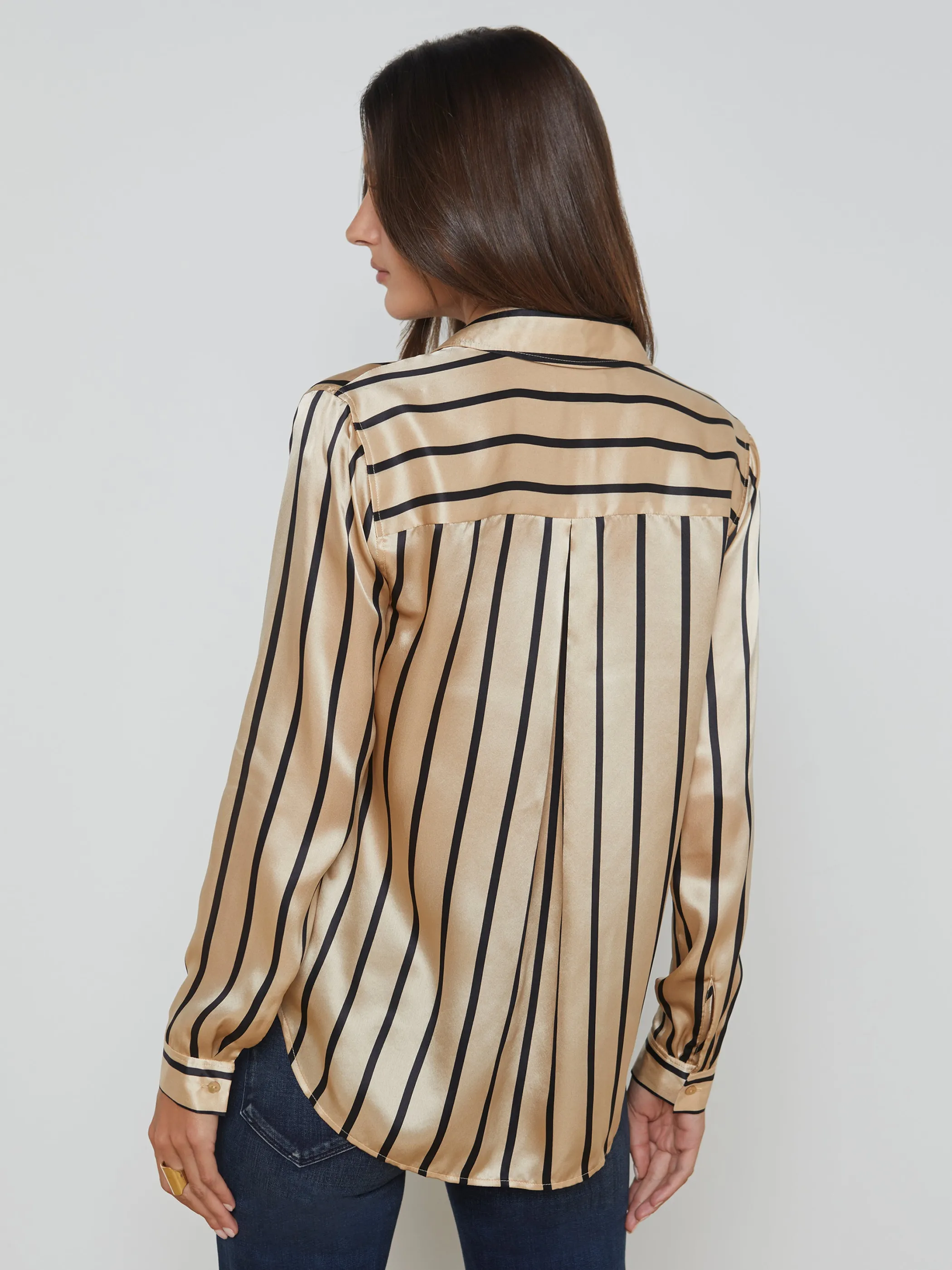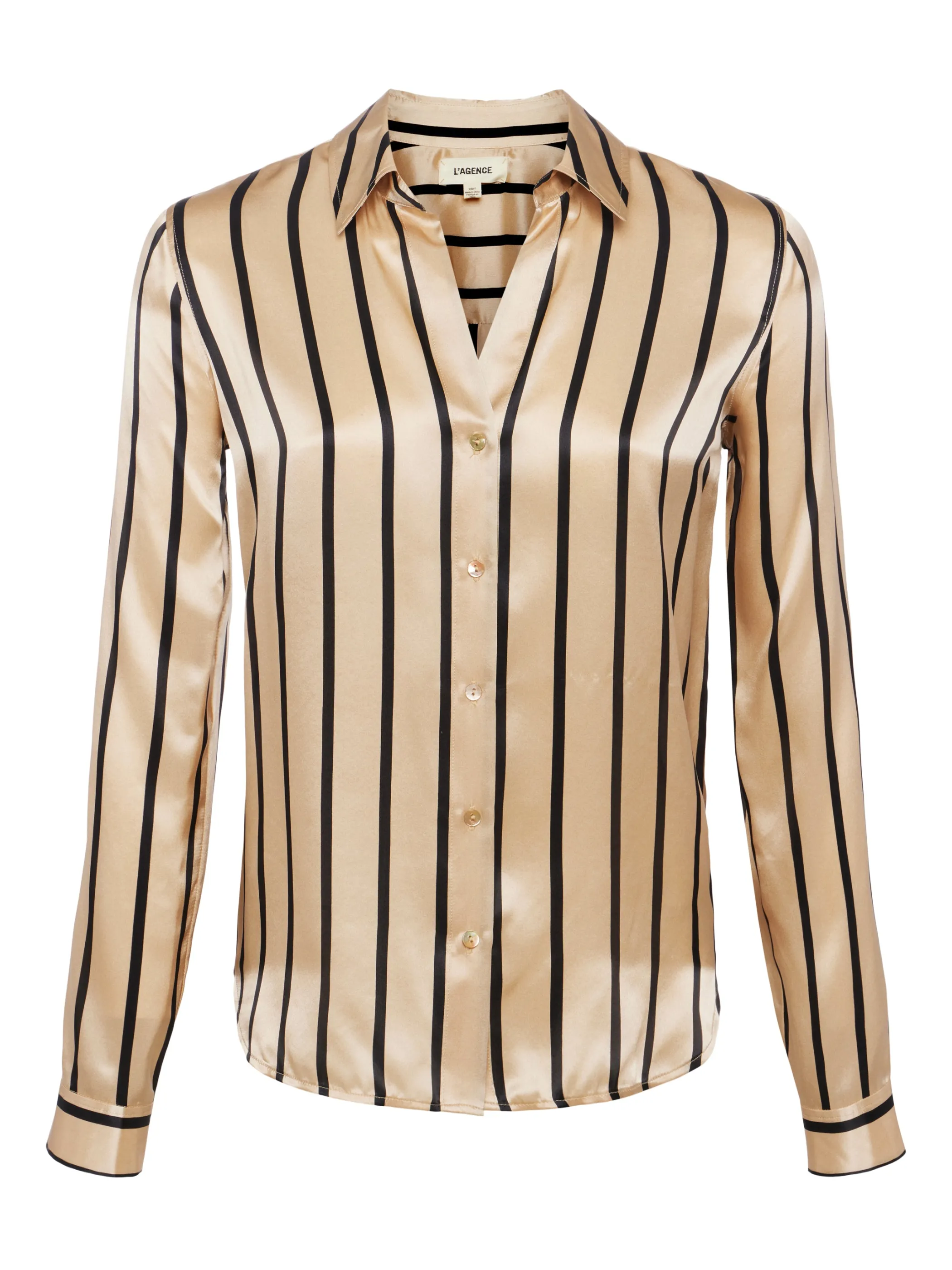 Meet the iconic long-sleeve silk button-down that belongs in every wardrobe. This L’AGENCE bestseller is now back in a black and almond stripe.