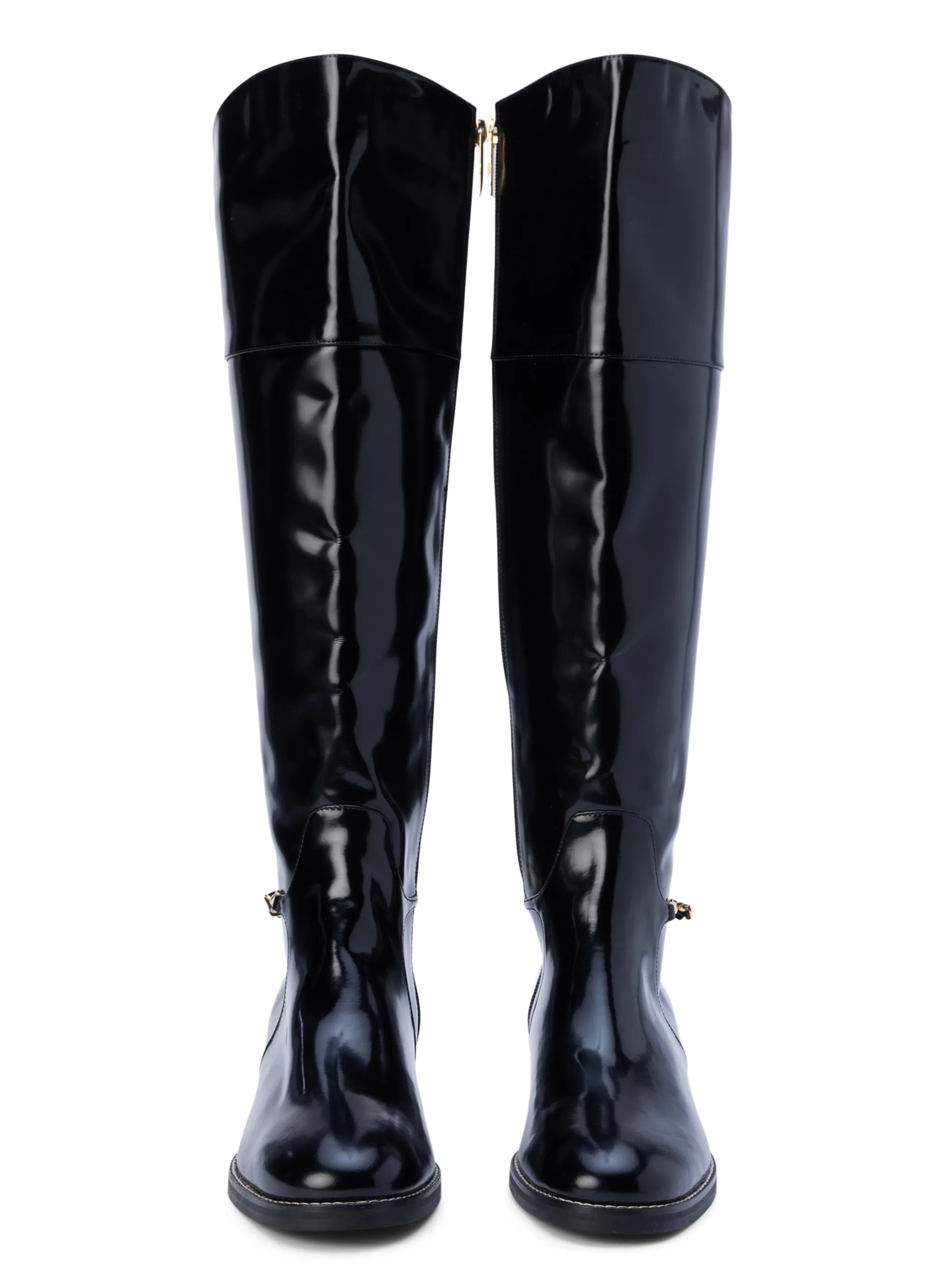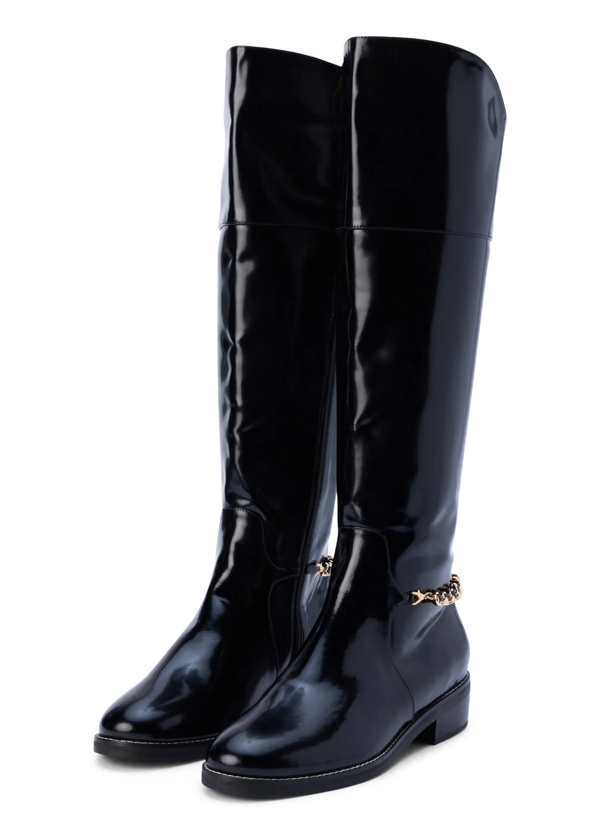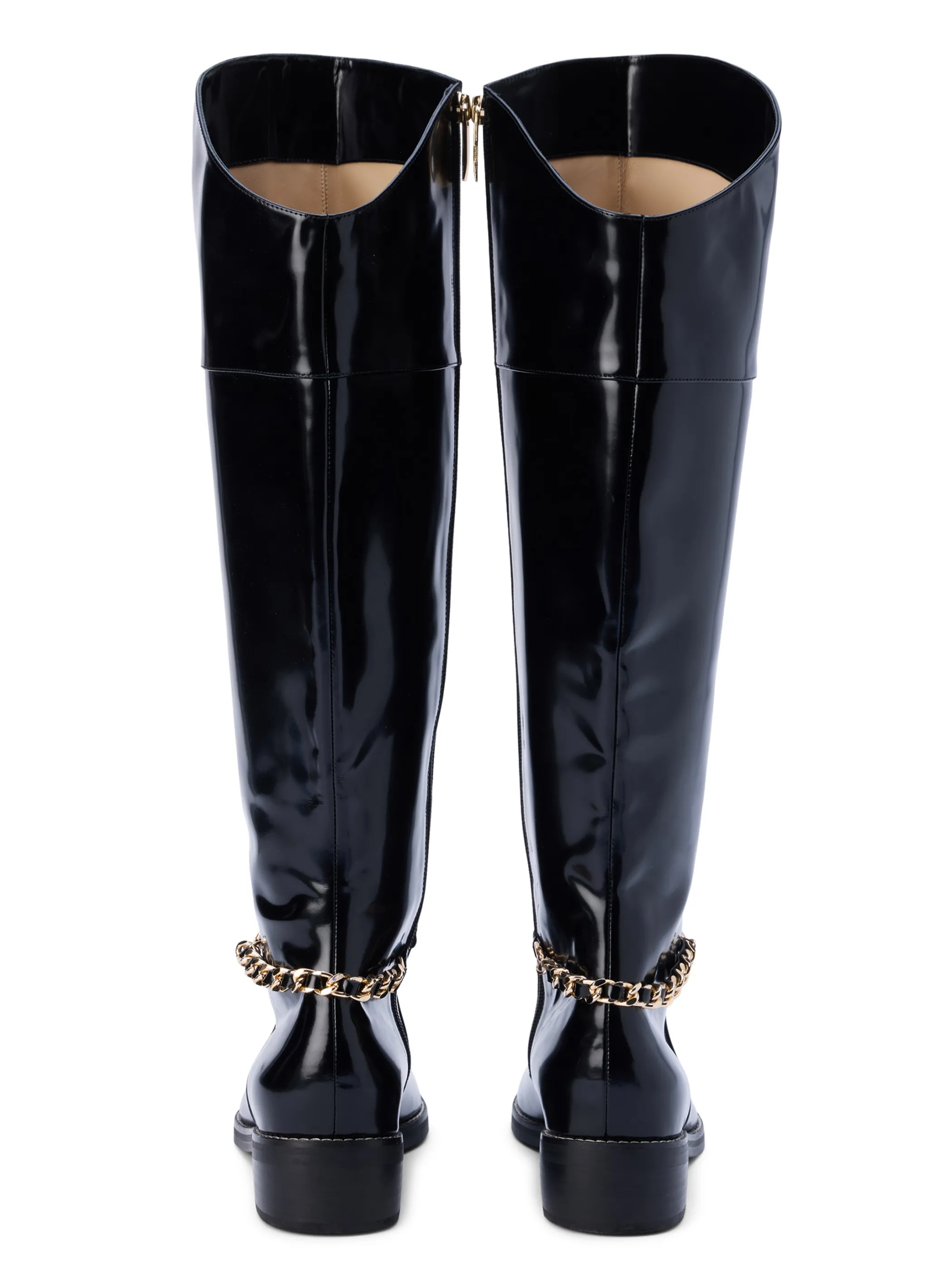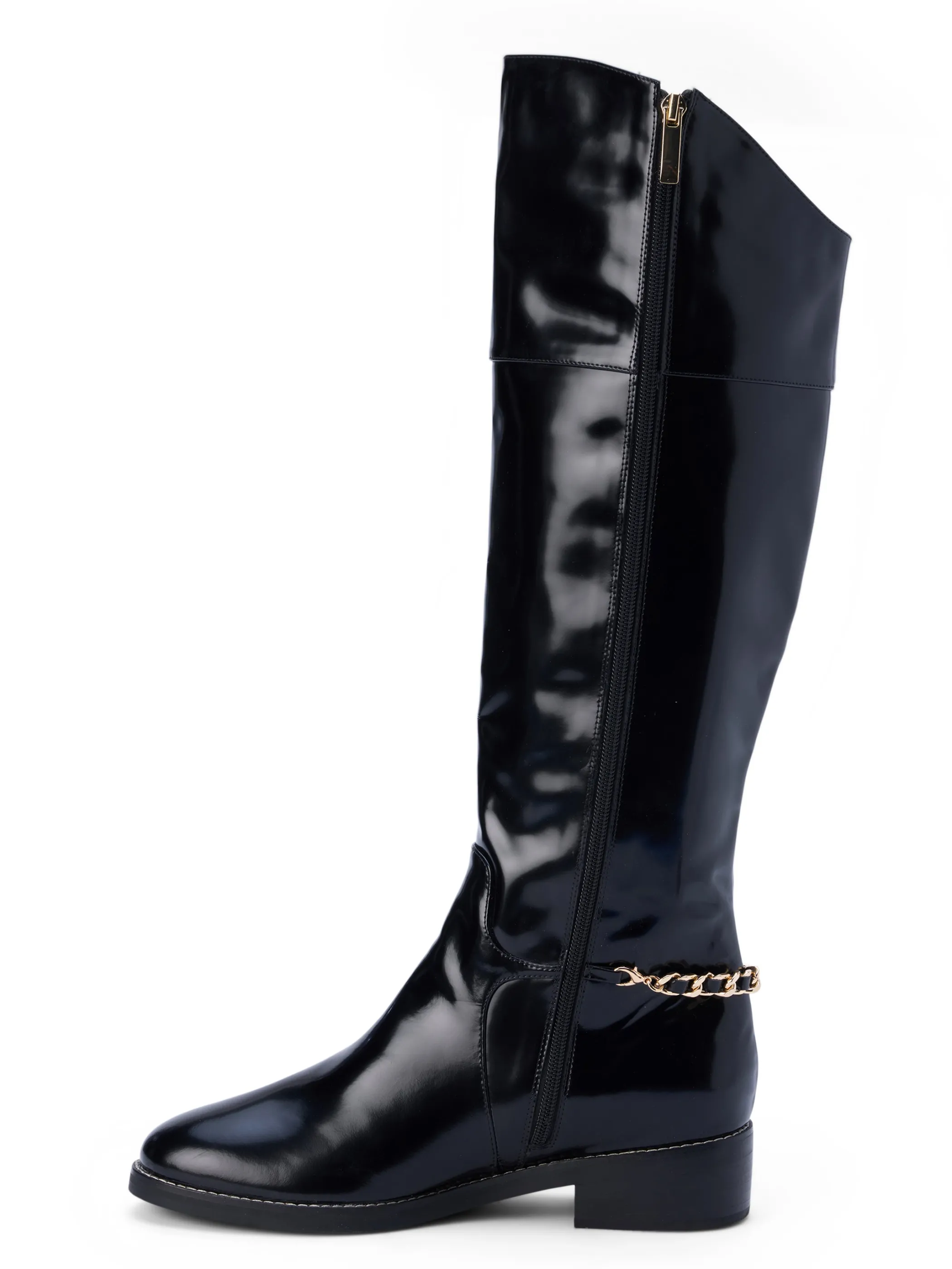 A beautiful riding boot made modern with a gold chain detail. • Calf leather upper• Canvas lining• Almond toe• D…
