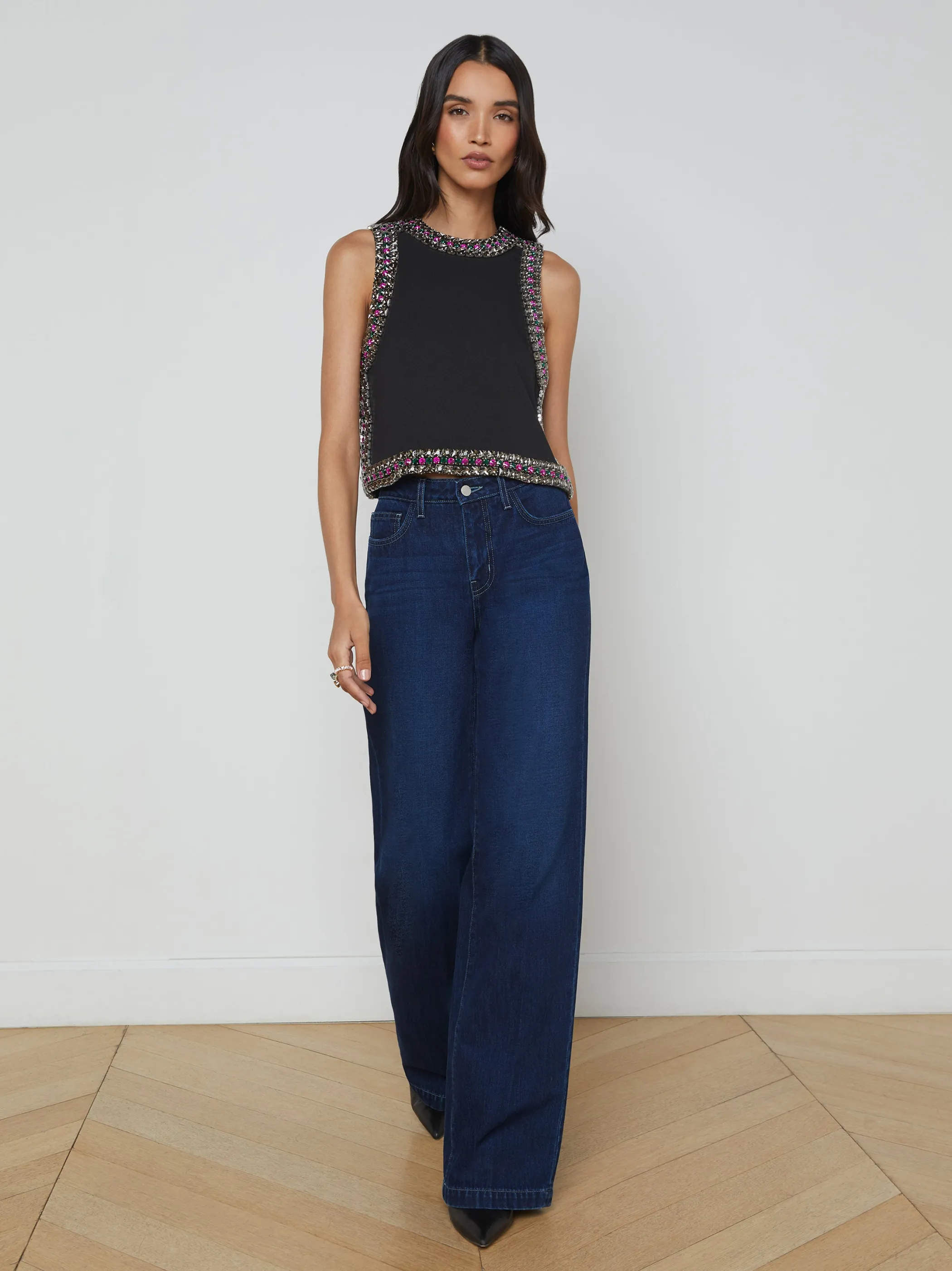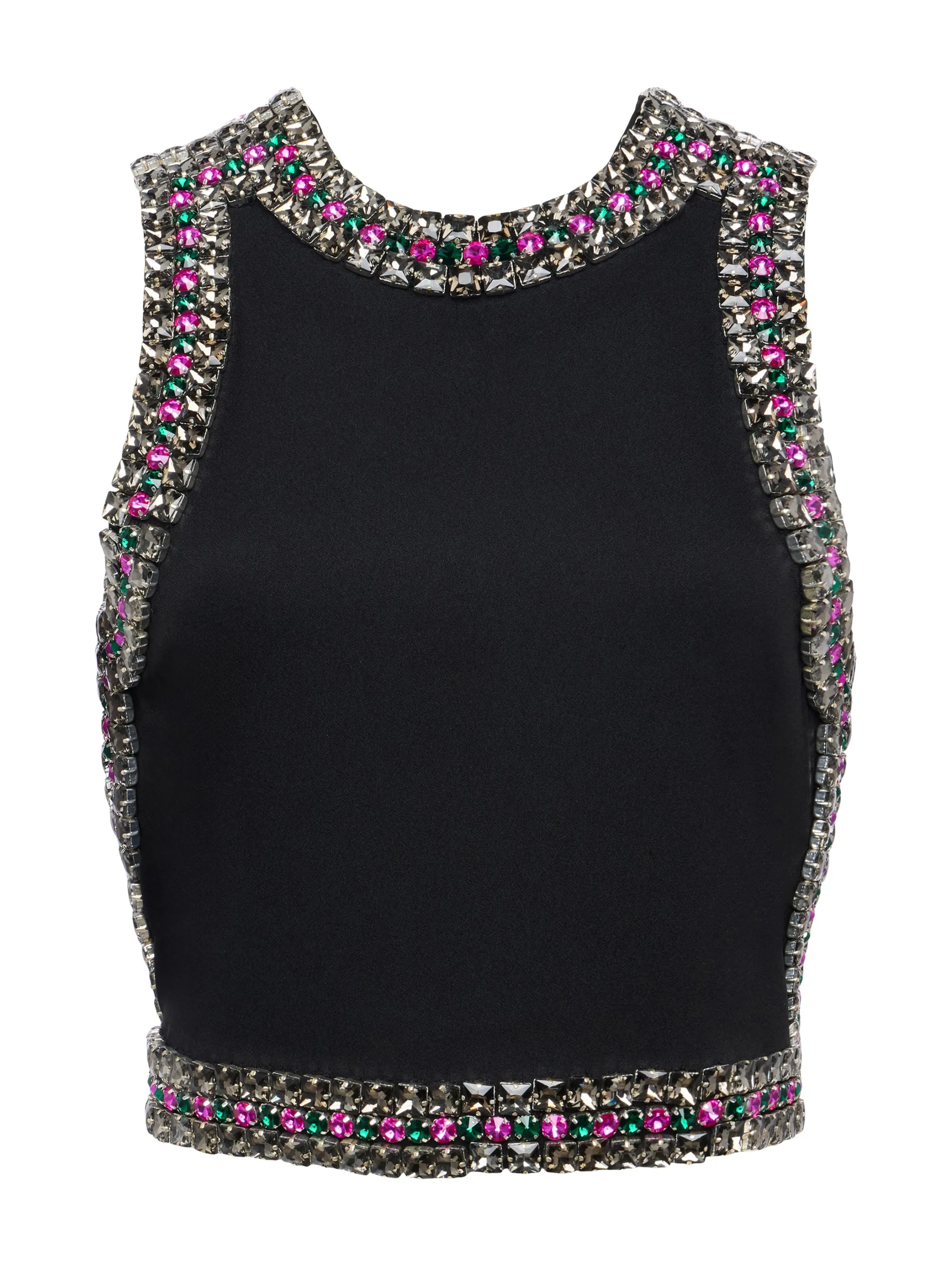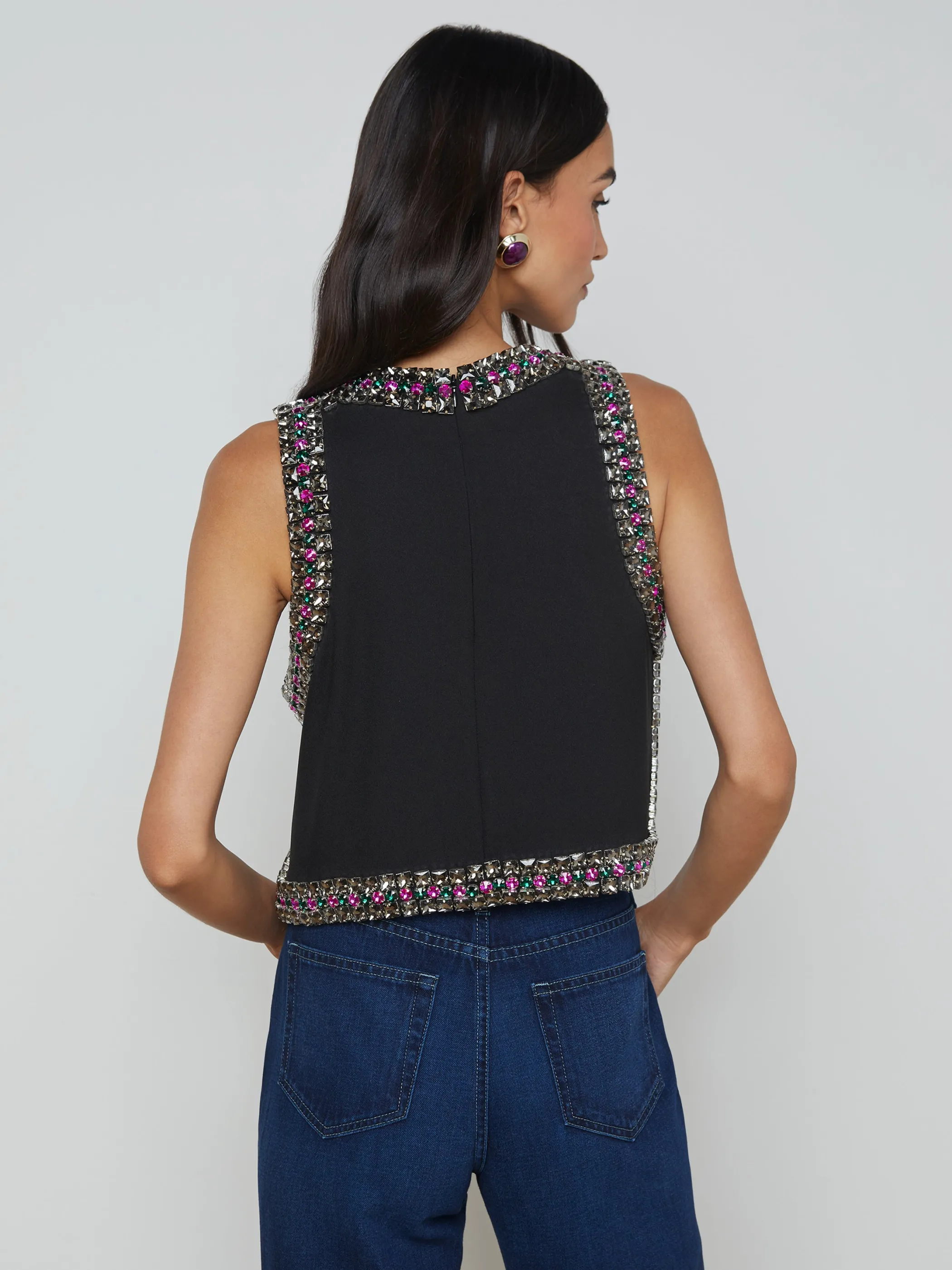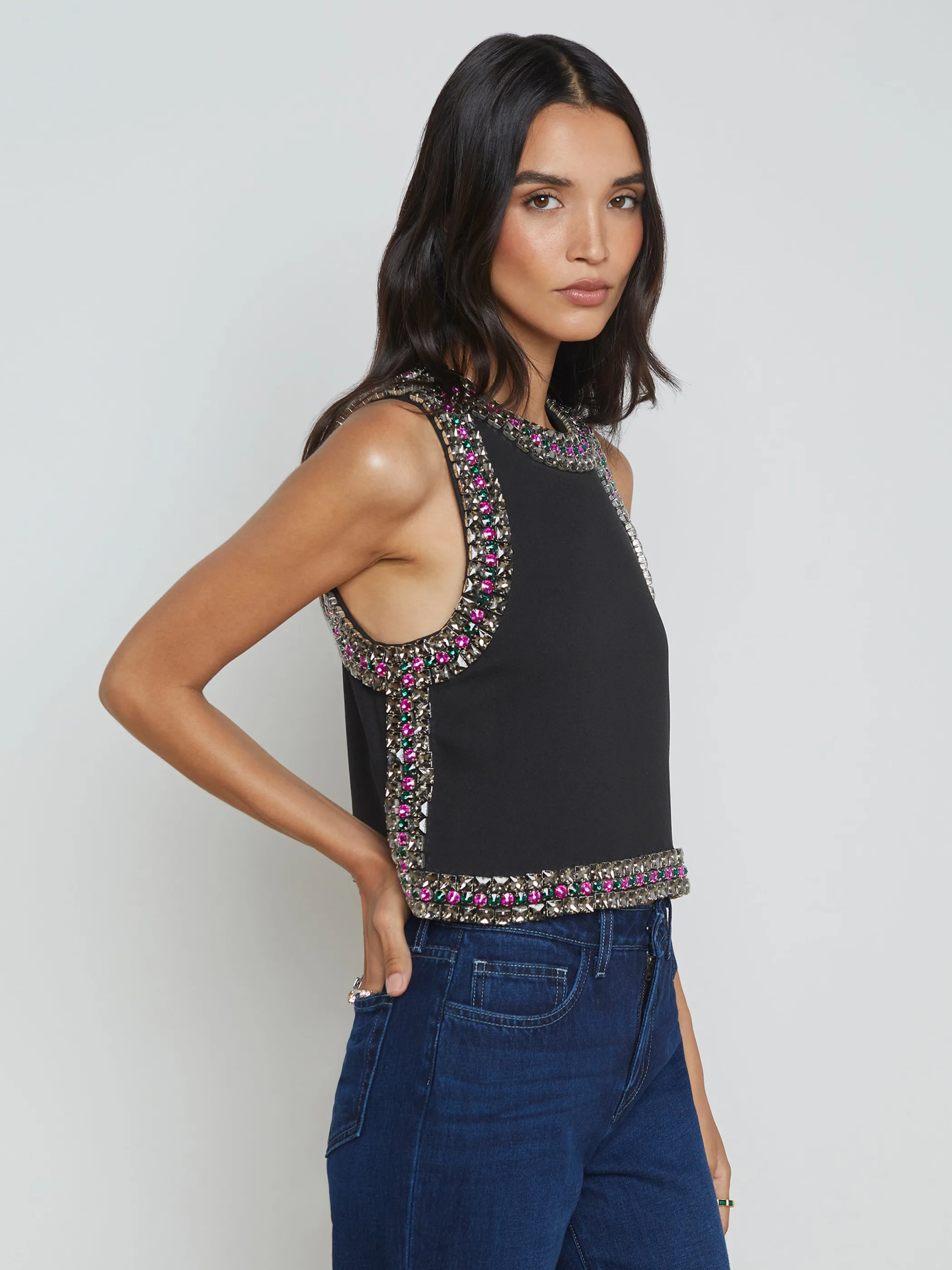 Each Bastia tank features 850 crystals in 3 different sizes, meticulously hand beaded over a 30-hour period. Constructed from a lightweight, matte suiting fabric, this piece hangs beautifully on the body with a balanced weight.