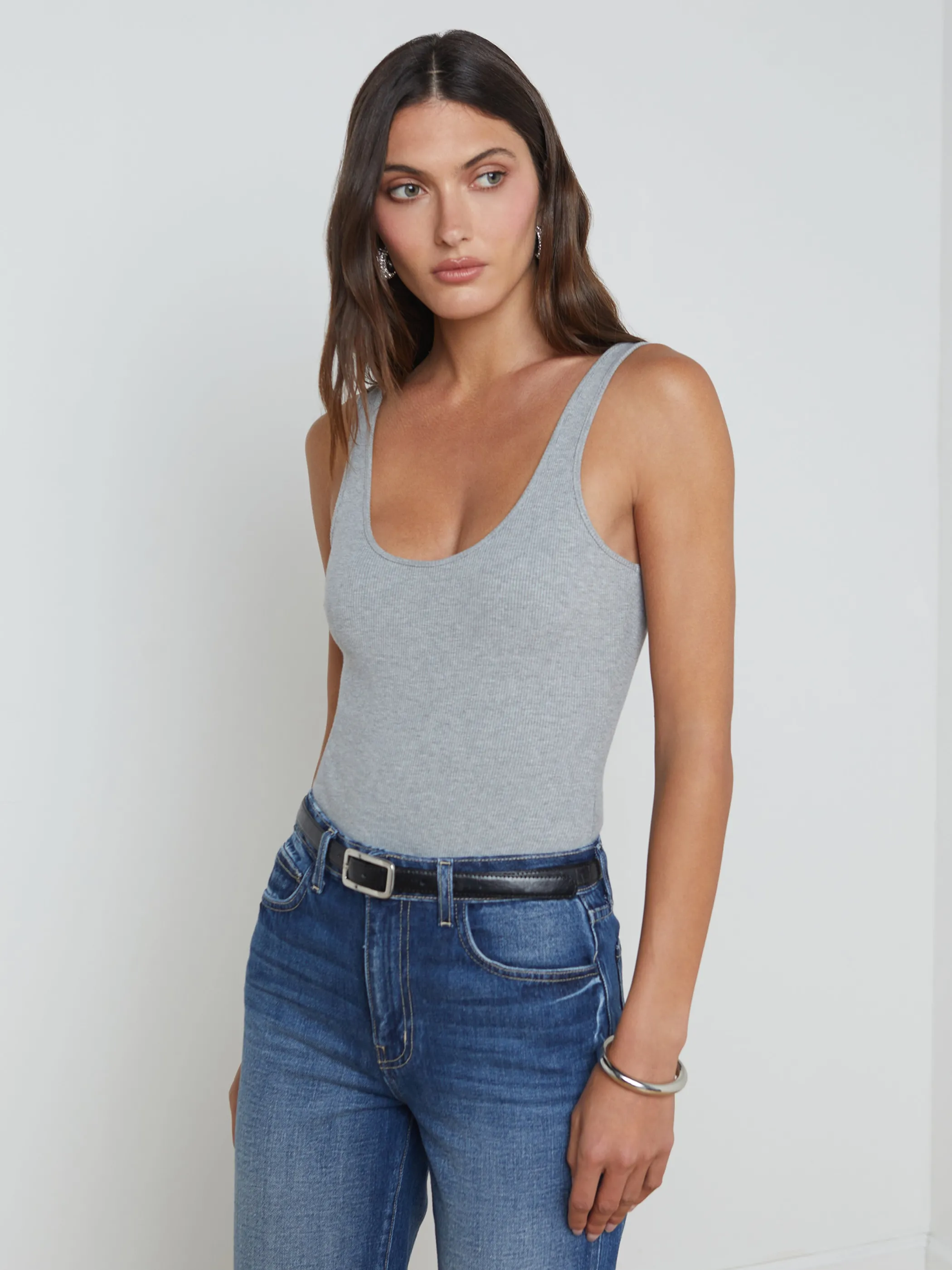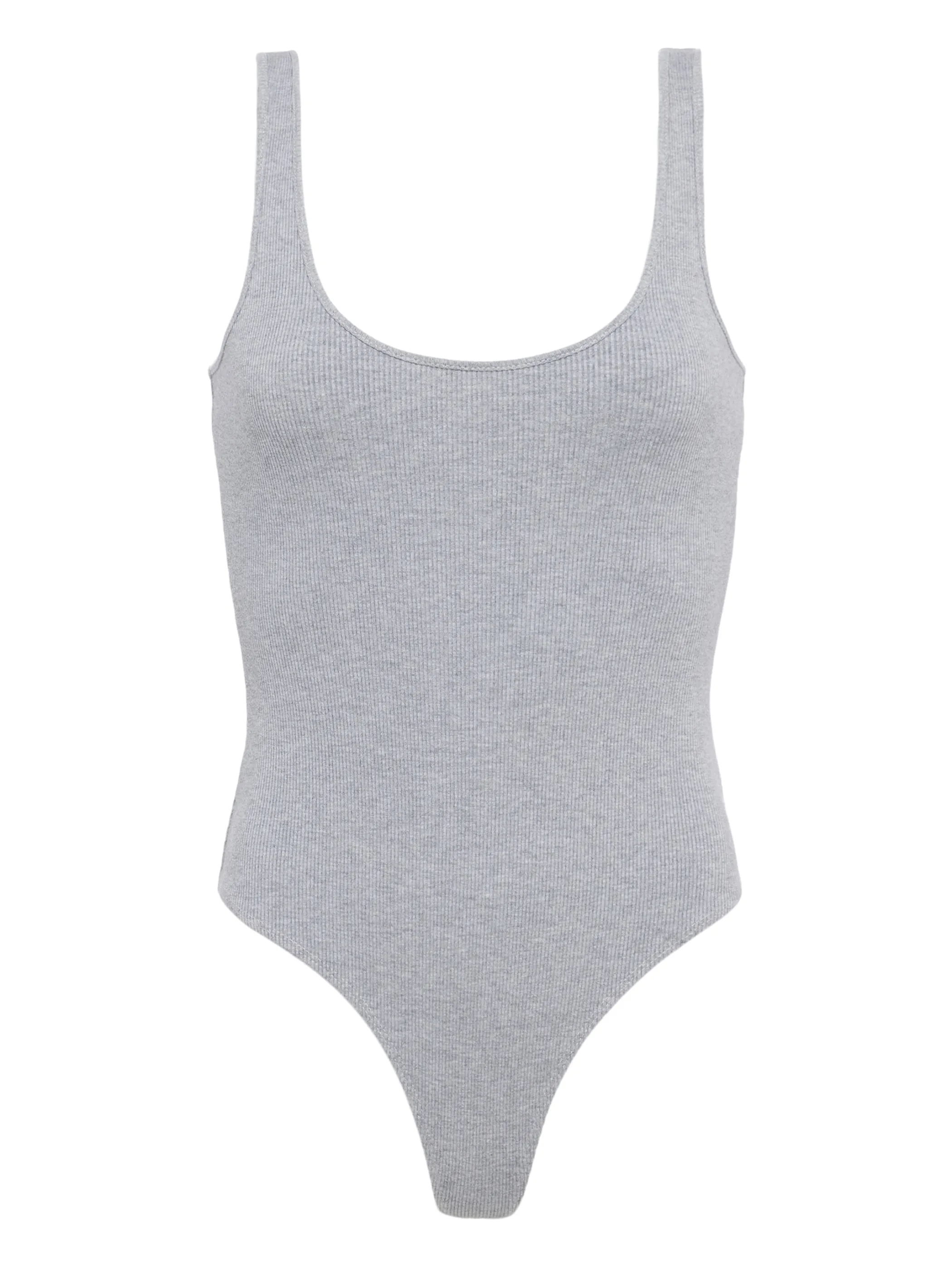 With a deep scoopneck and flattering, smooth fit, the Nica bodysuit is the ultimate base layer. Now in timeless heather gray.
