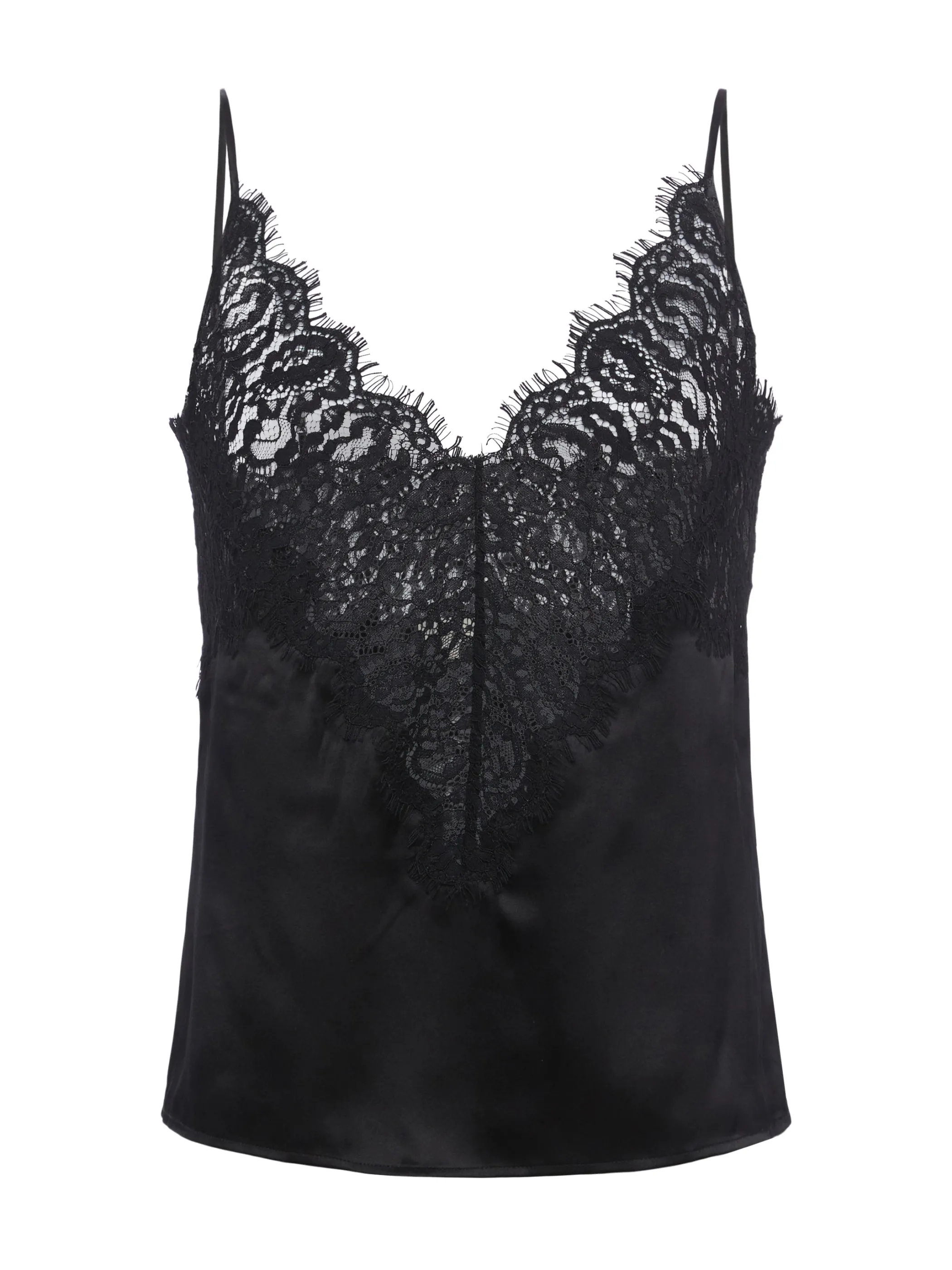Sheer lace adds a subtle lingerie-inspired appeal to our signature silk camisole in a versatile black.