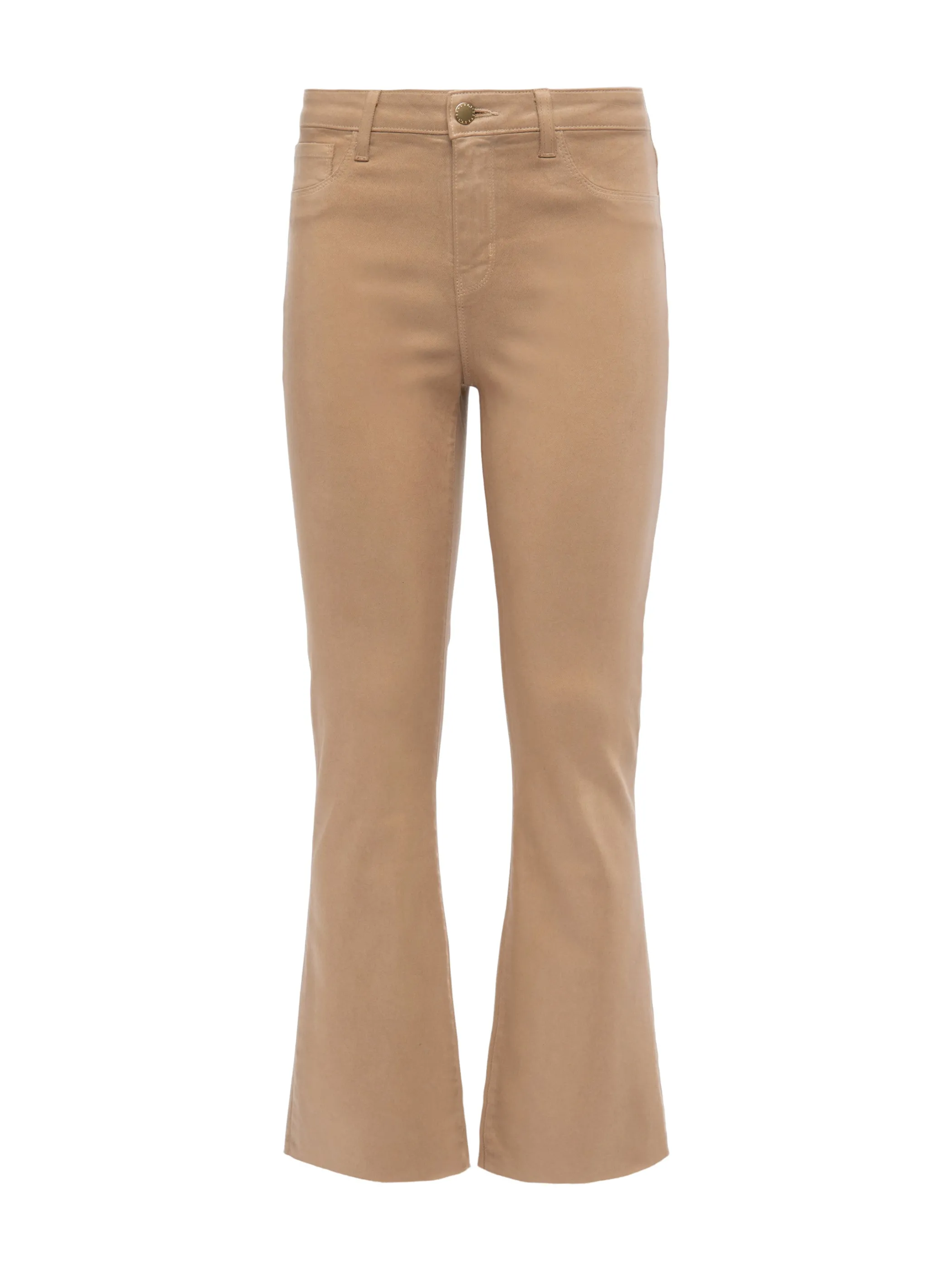 A high-rise cropped flare jean in a lustrous coated premium denim in a neutral cappuccino-beige hue. High-recovery denim hugs from waistband to knee before extending into a flared cropped leg finished with raw hem. Includes five-pocket construction and front zip fly closure.