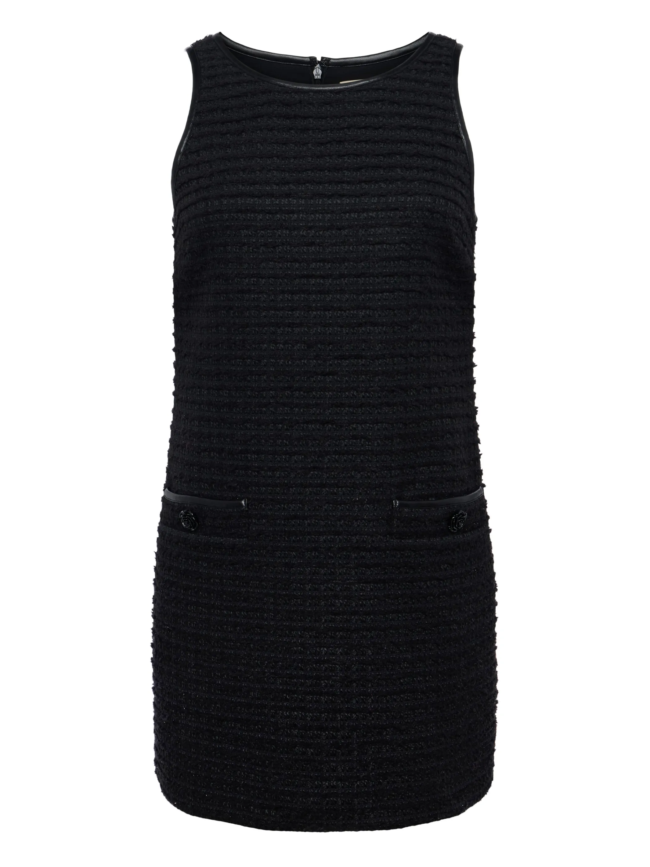 A clean, vintage-inspired shift dress cut from beautifully textured fringed tweed and finished with vegan leather piping.