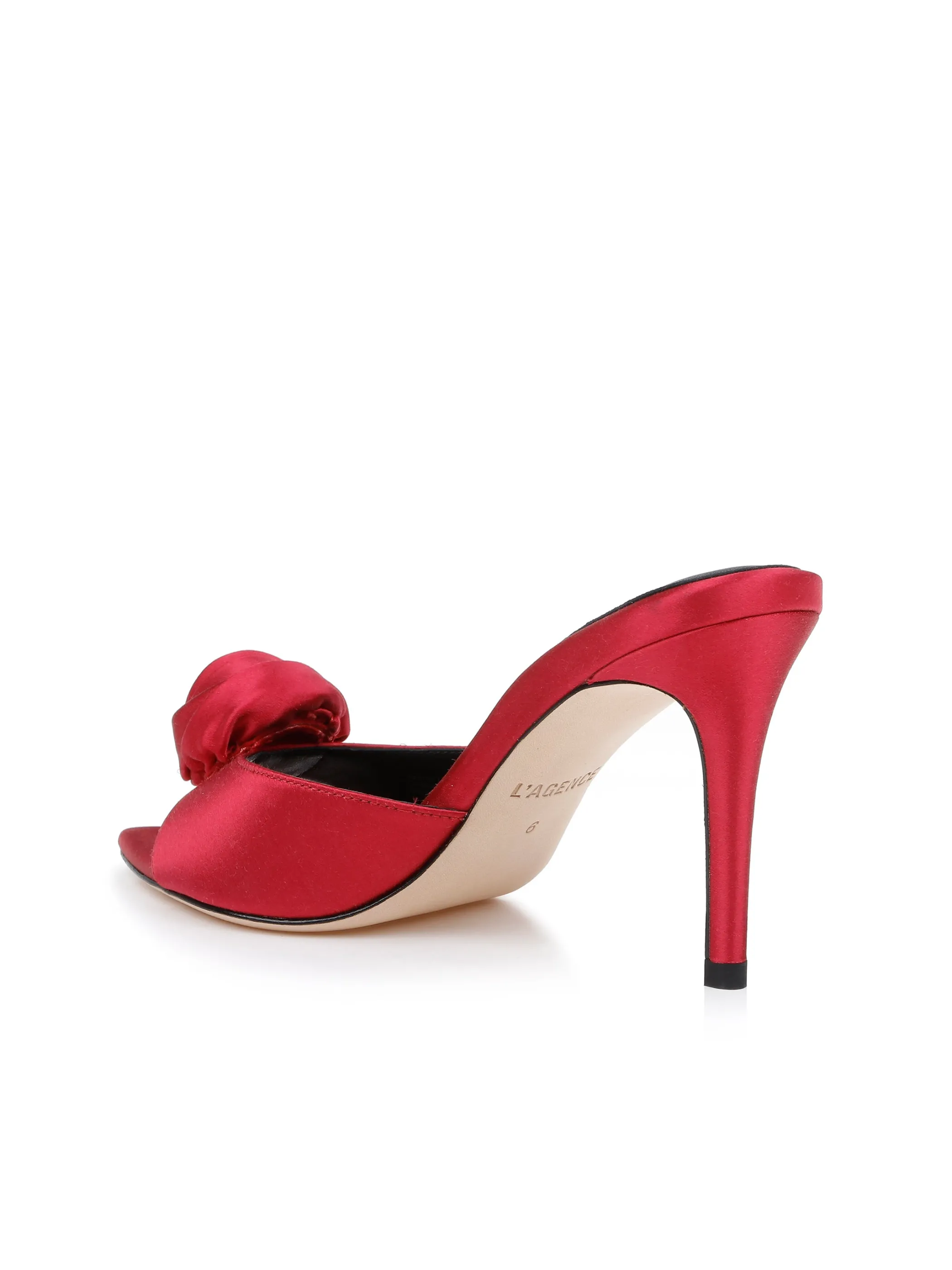 A rosette detail transforms our signature mule into a romantic statement. Now in a lustrous red satin, the Felice is perfect for pairing with a gown for your next event or blue jeans and a tee for every day.