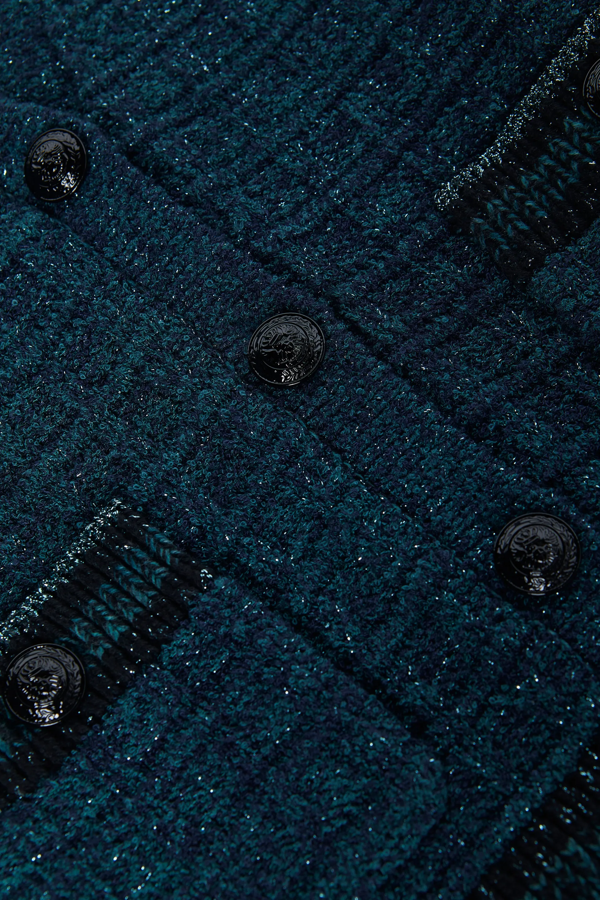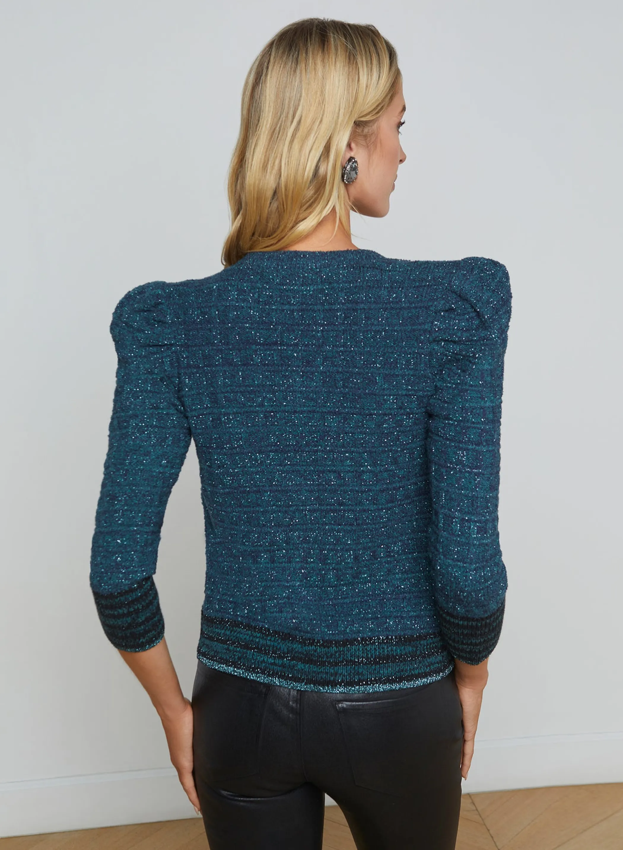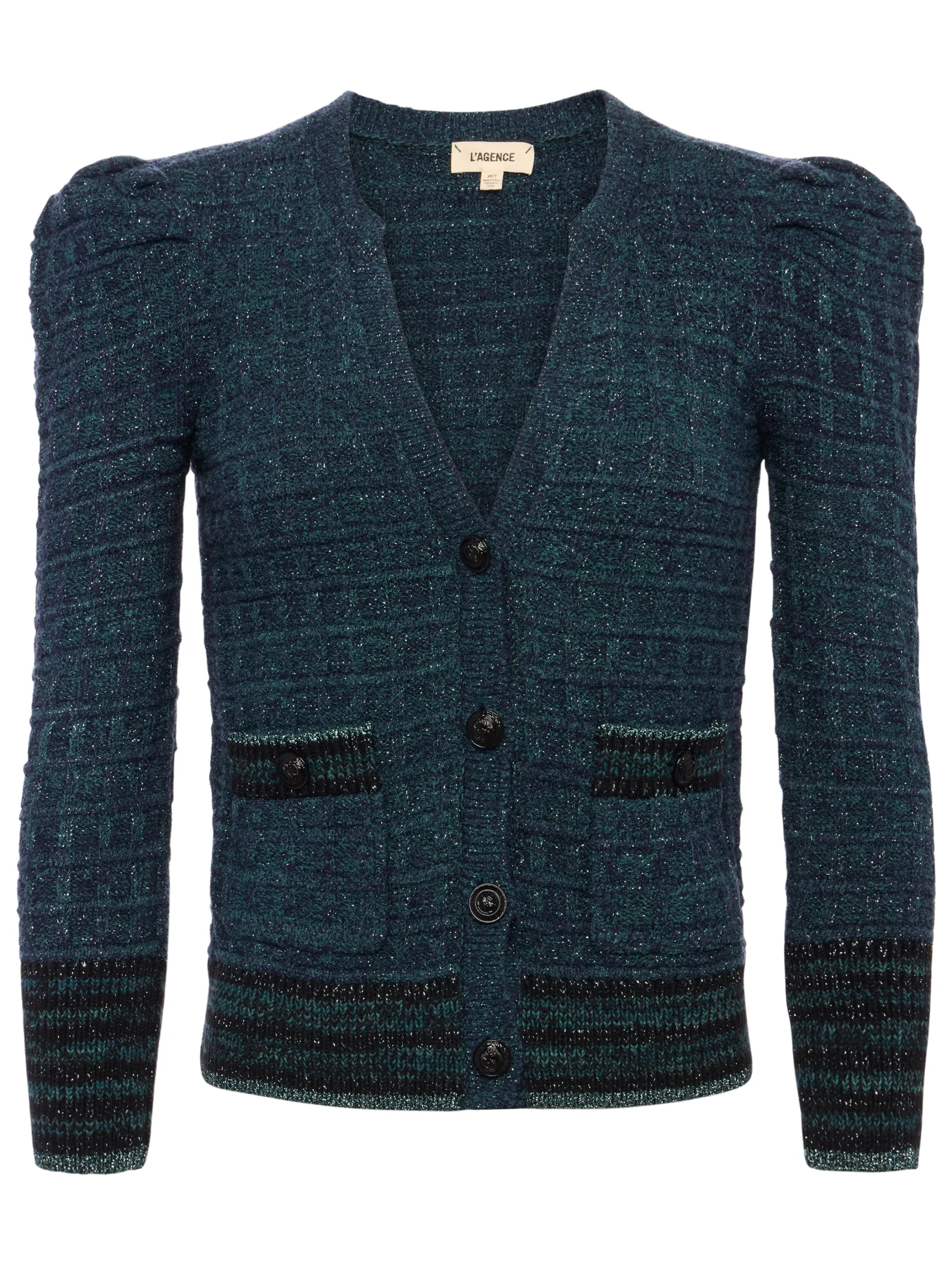 A lurex-infused waffle knit adds dimension and sparkle to this feminine cardigan top.
