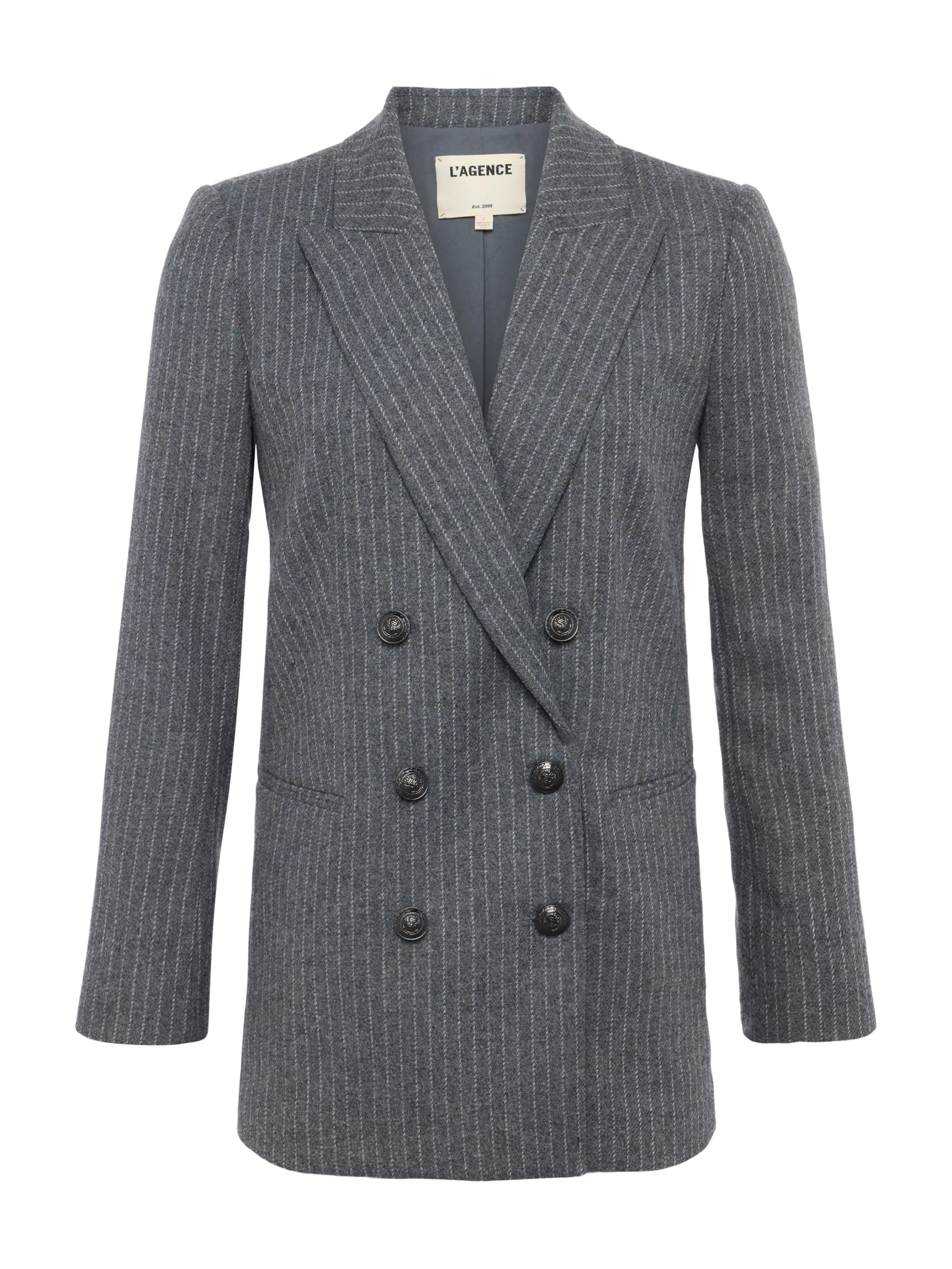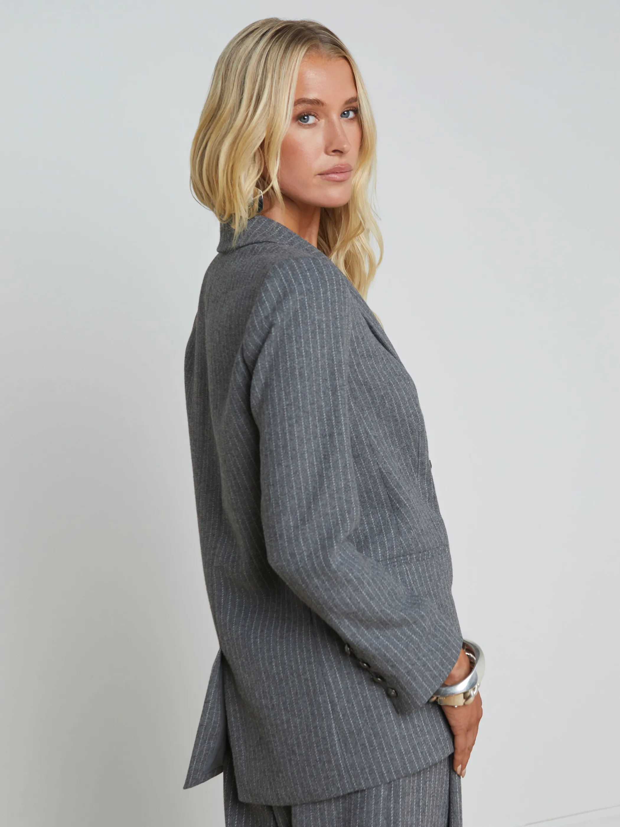 The Aimee blazer features a cool-without-trying oversized fit, now in a menswear inspired pinstripe.