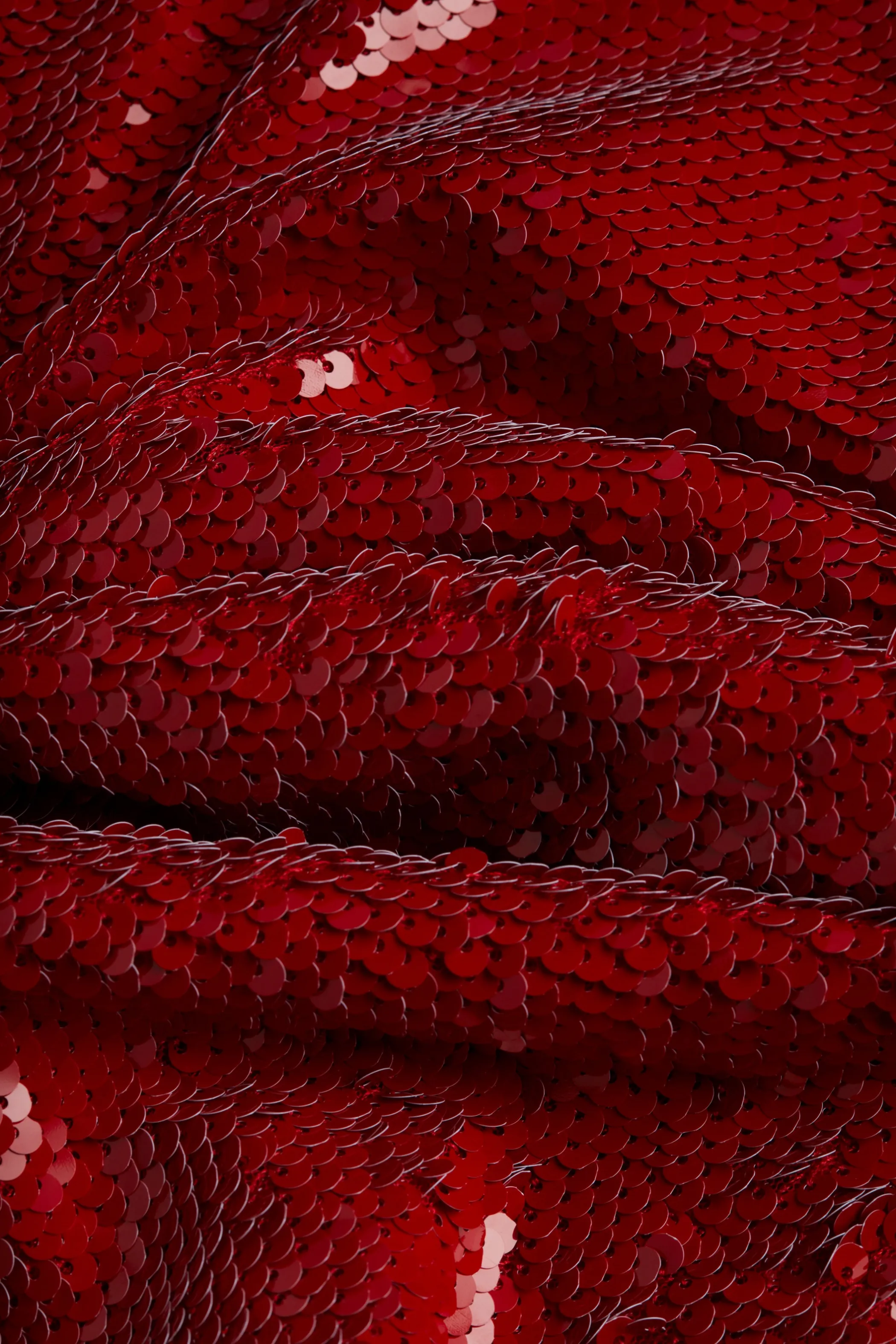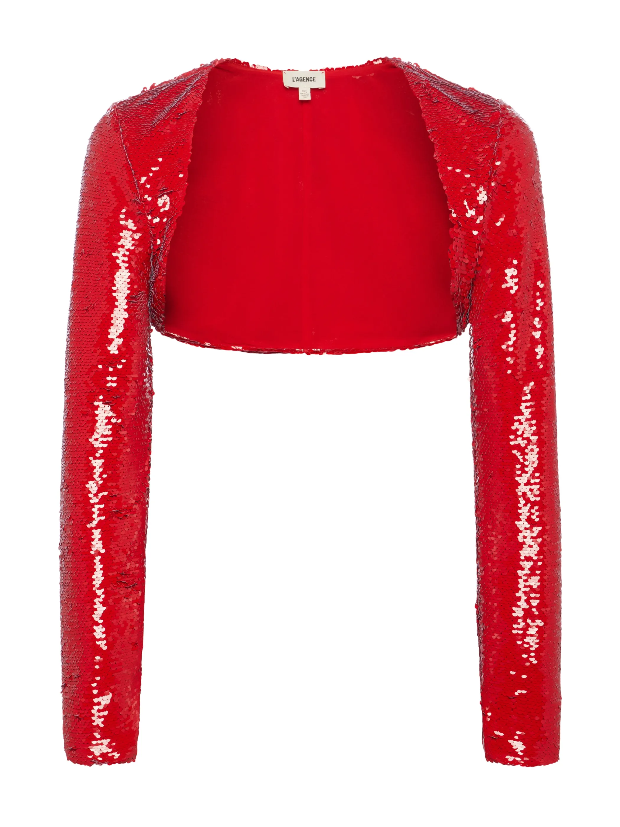 A stunning, bold red sequin shrug for any occasion that calls for statement sleeves.