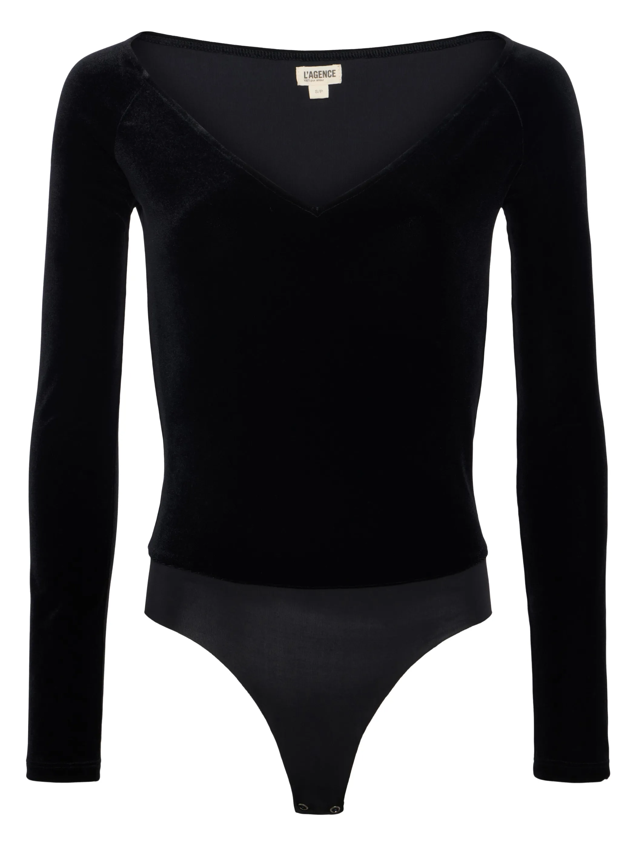 A deep V-neck cuts a beautifully elegant shape wide across the shoulders.