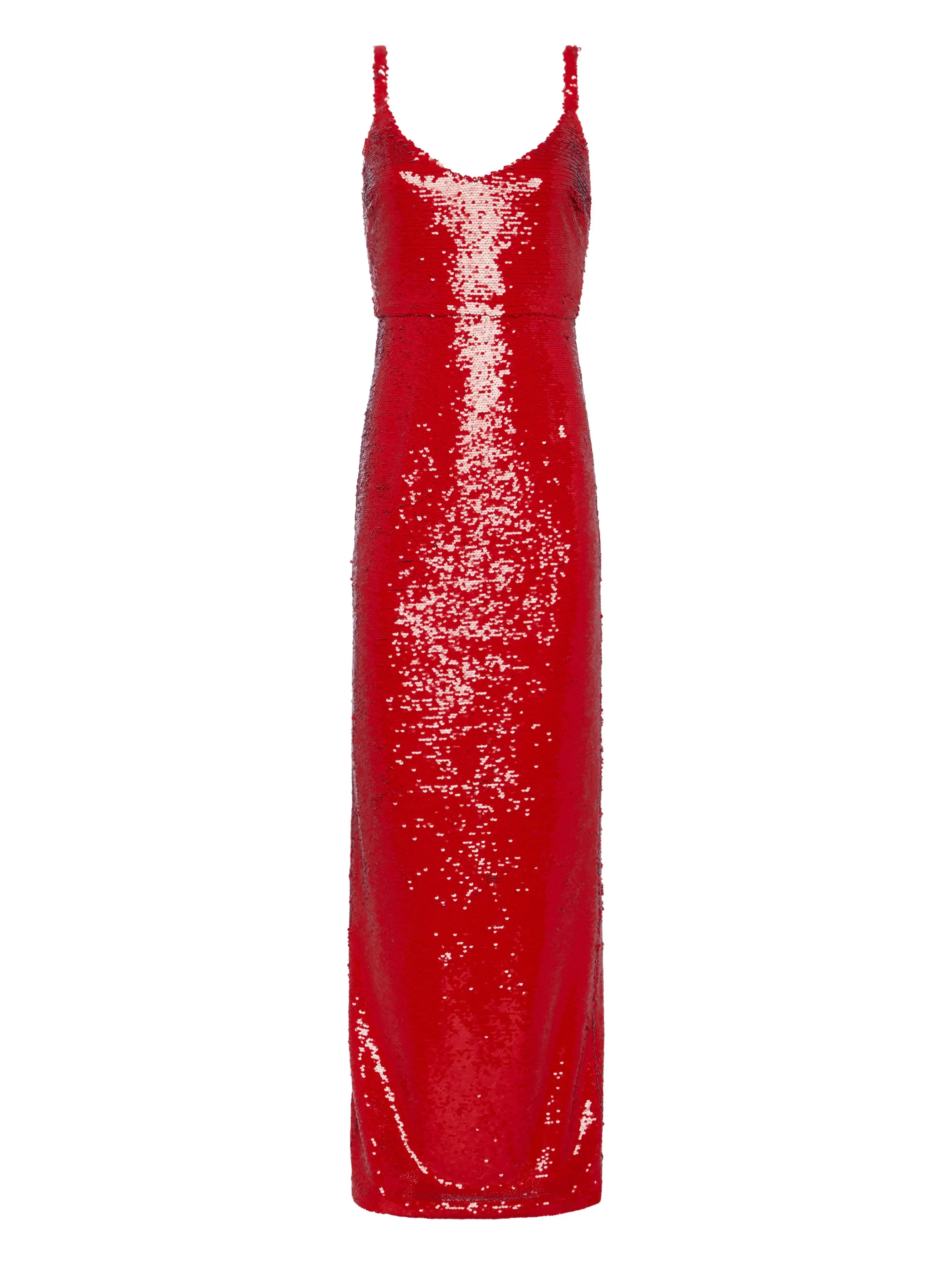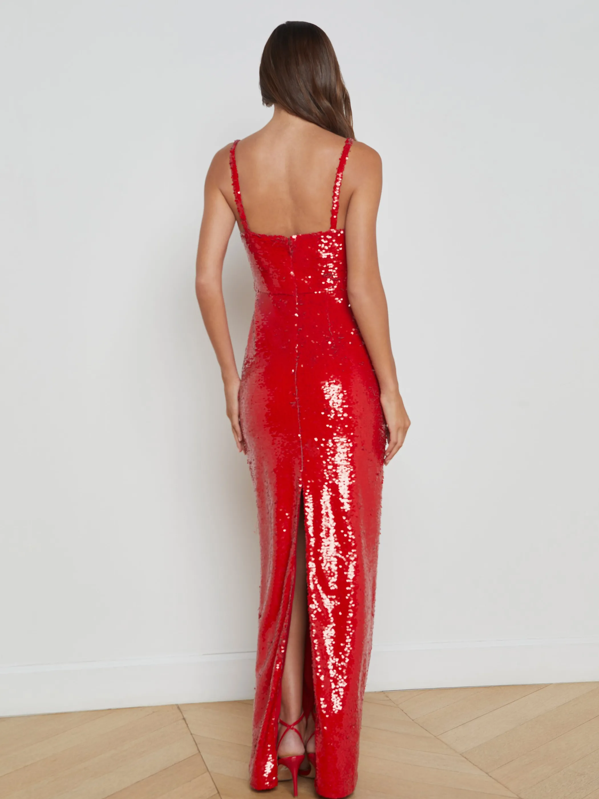 Make an entrance with the Karma. A sexy, structured bodice meets bold red sequins for a body-skimming statement.