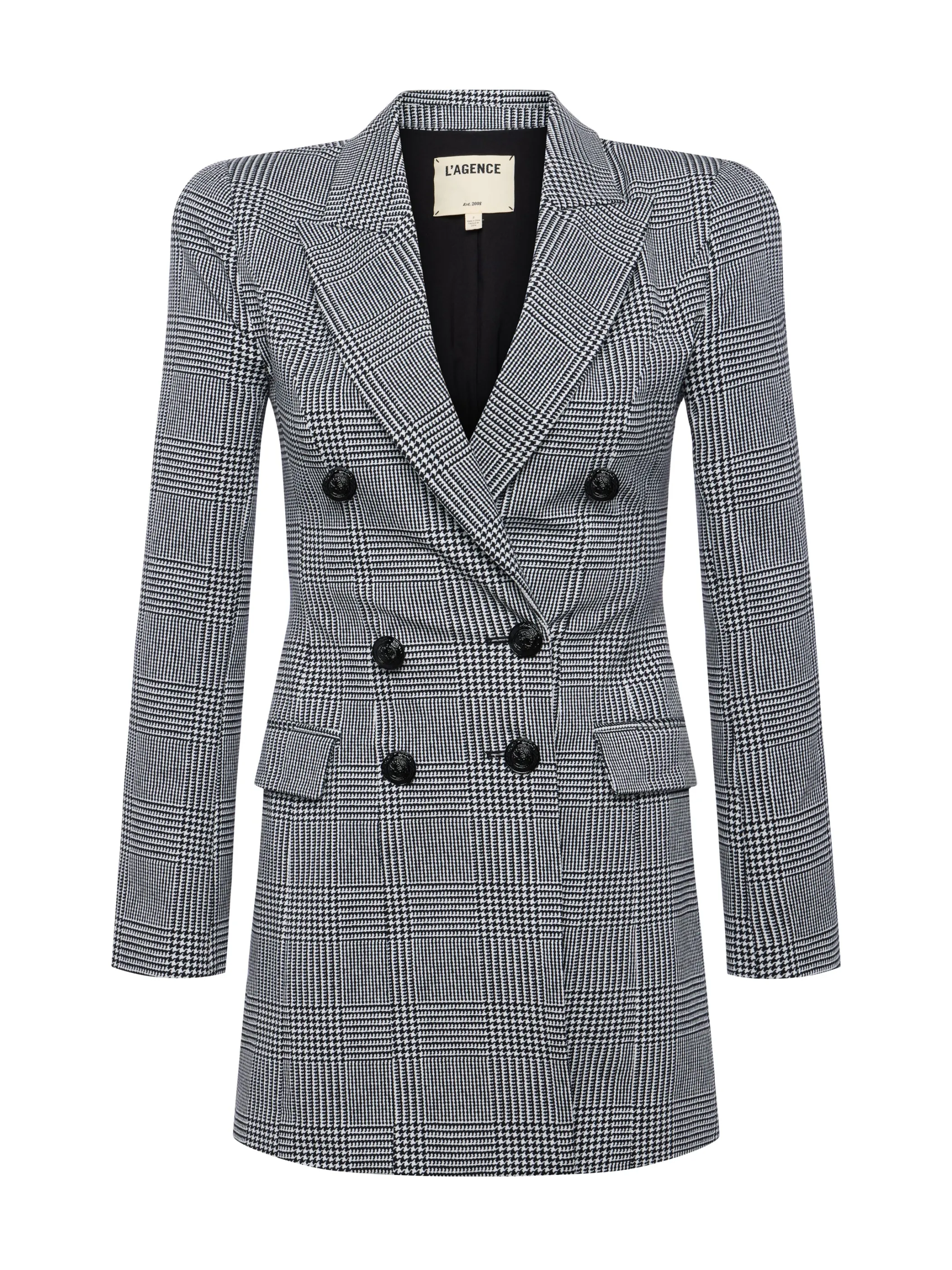 Our newest blazer dress features a flattering, cinched fit in a classic houndstooth plaid.