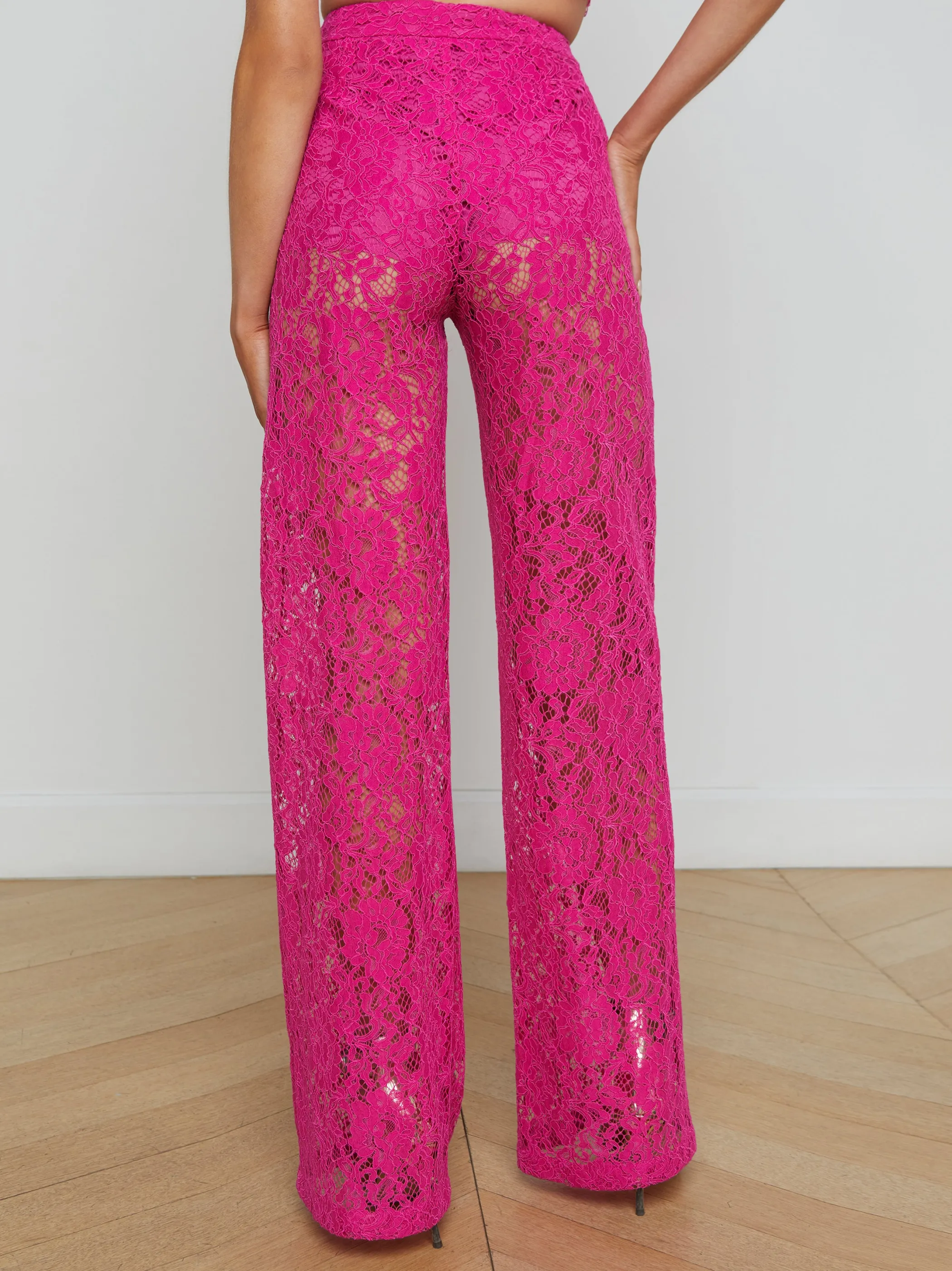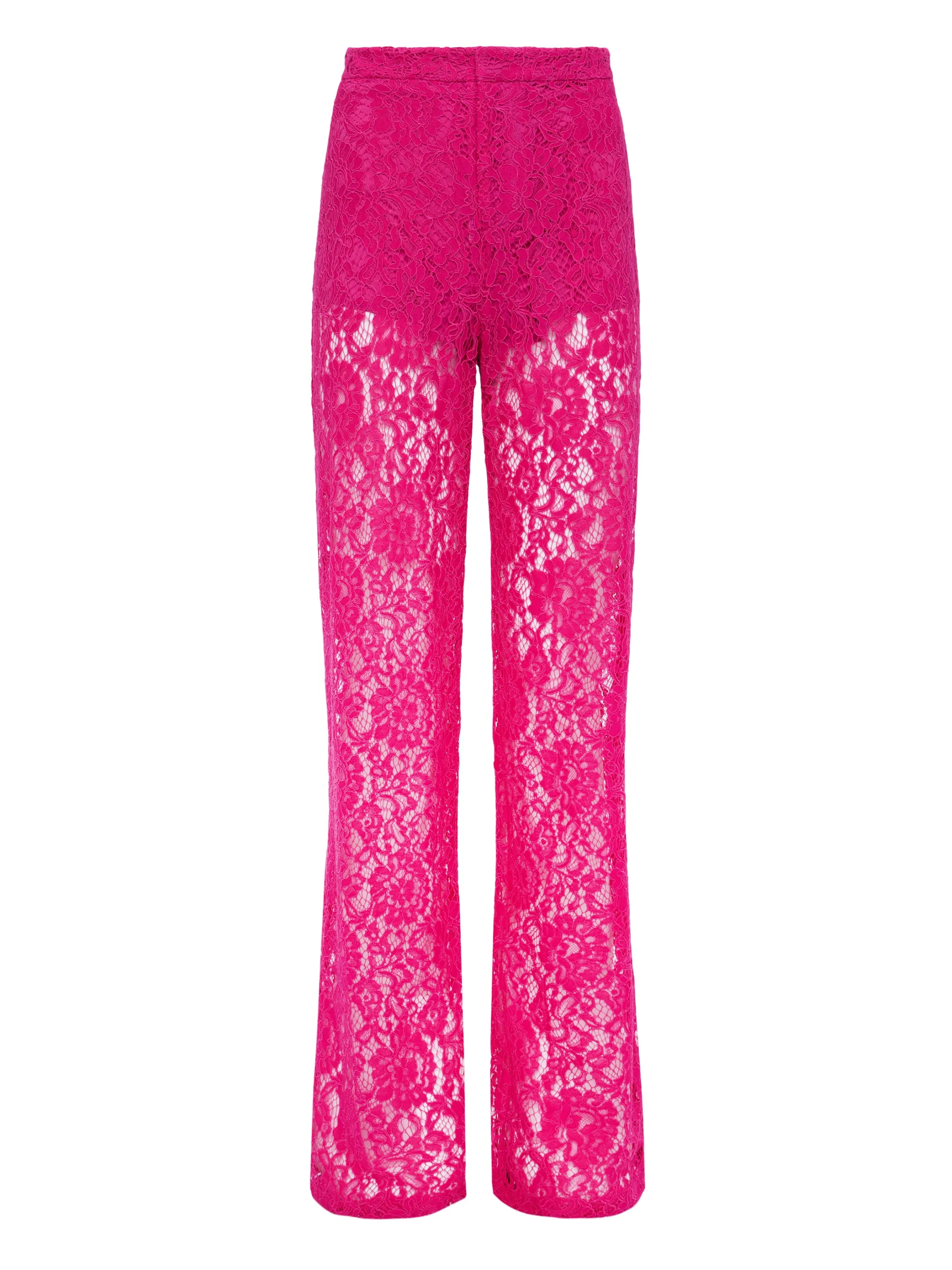 The L’AGENCE favorite straight-leg trouser, fitted through the hips and relaxed through the leg. Now in a hot pink structured floral lace.