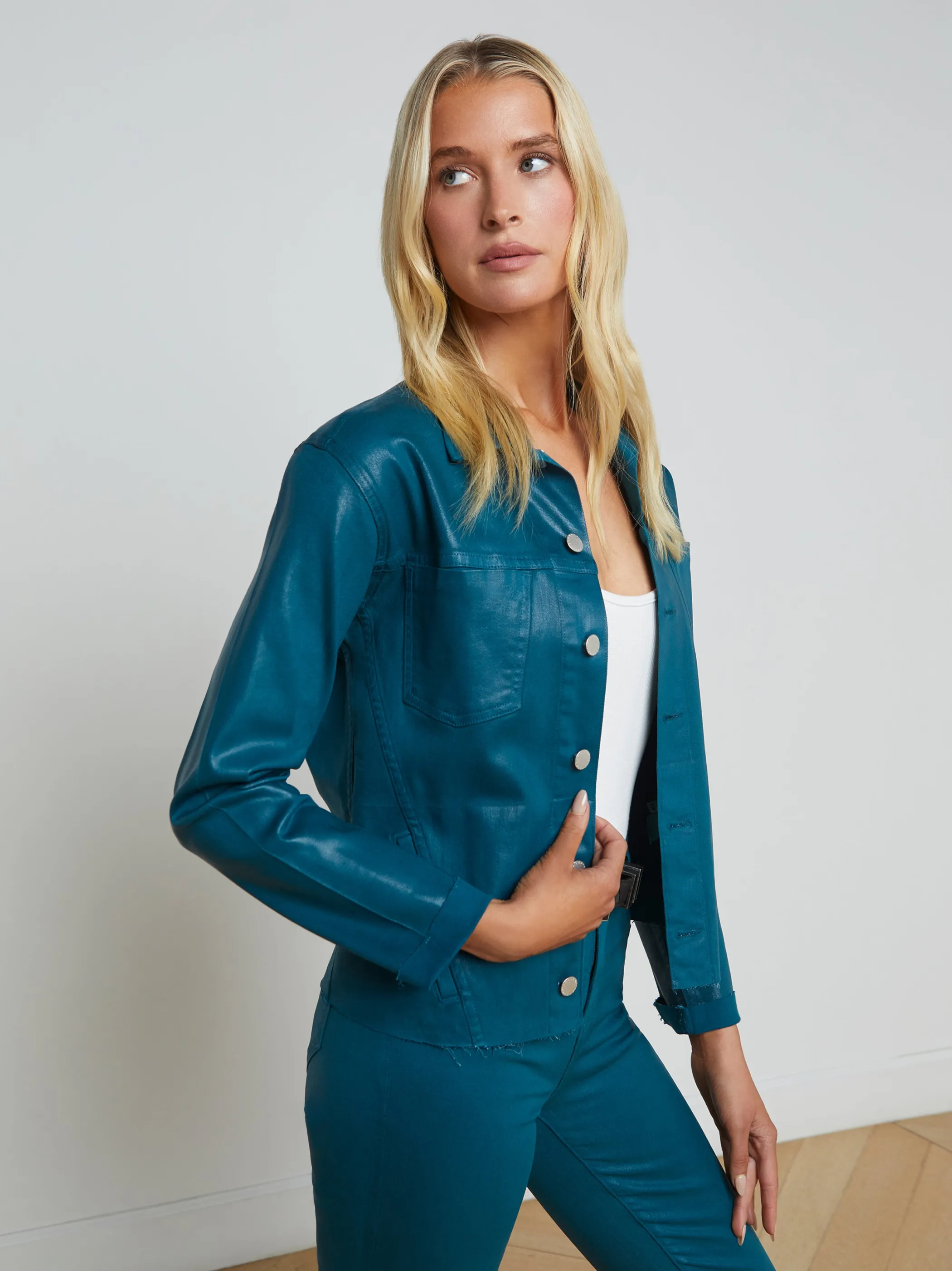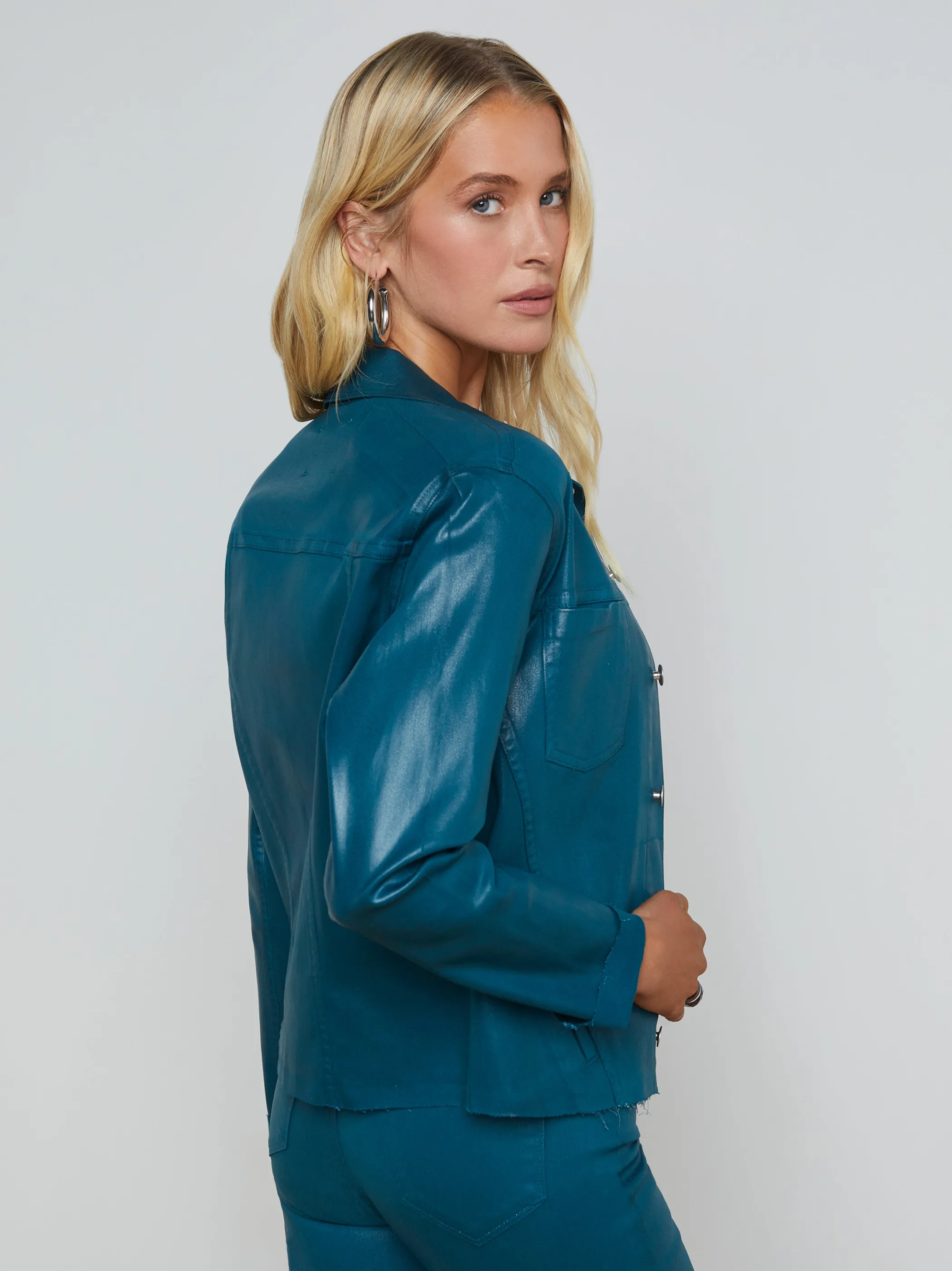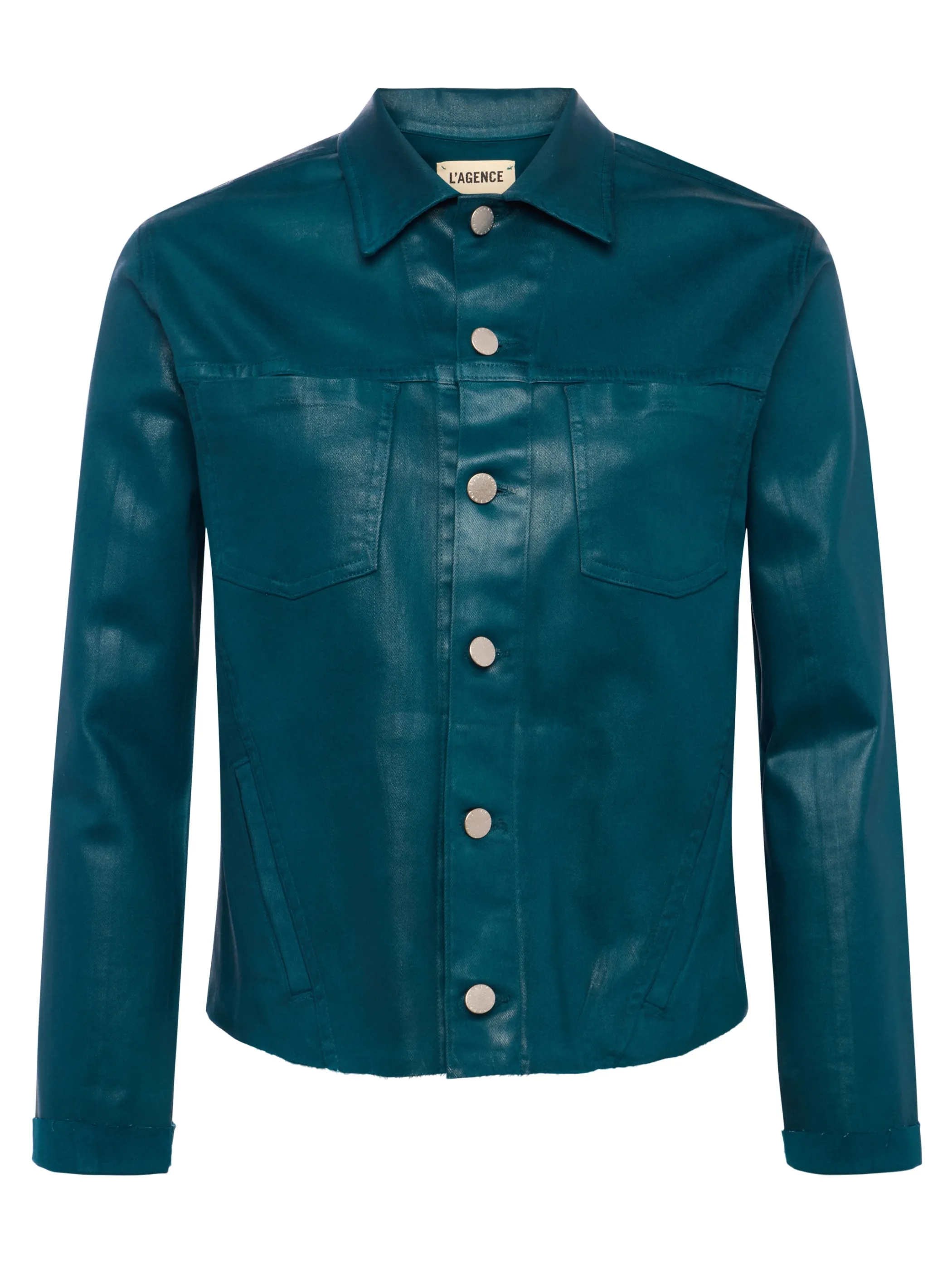 A flattering, feminine jacket, now updated in leather-look coated denim. This all-time bestseller is constructed with angled seams for waist definition.