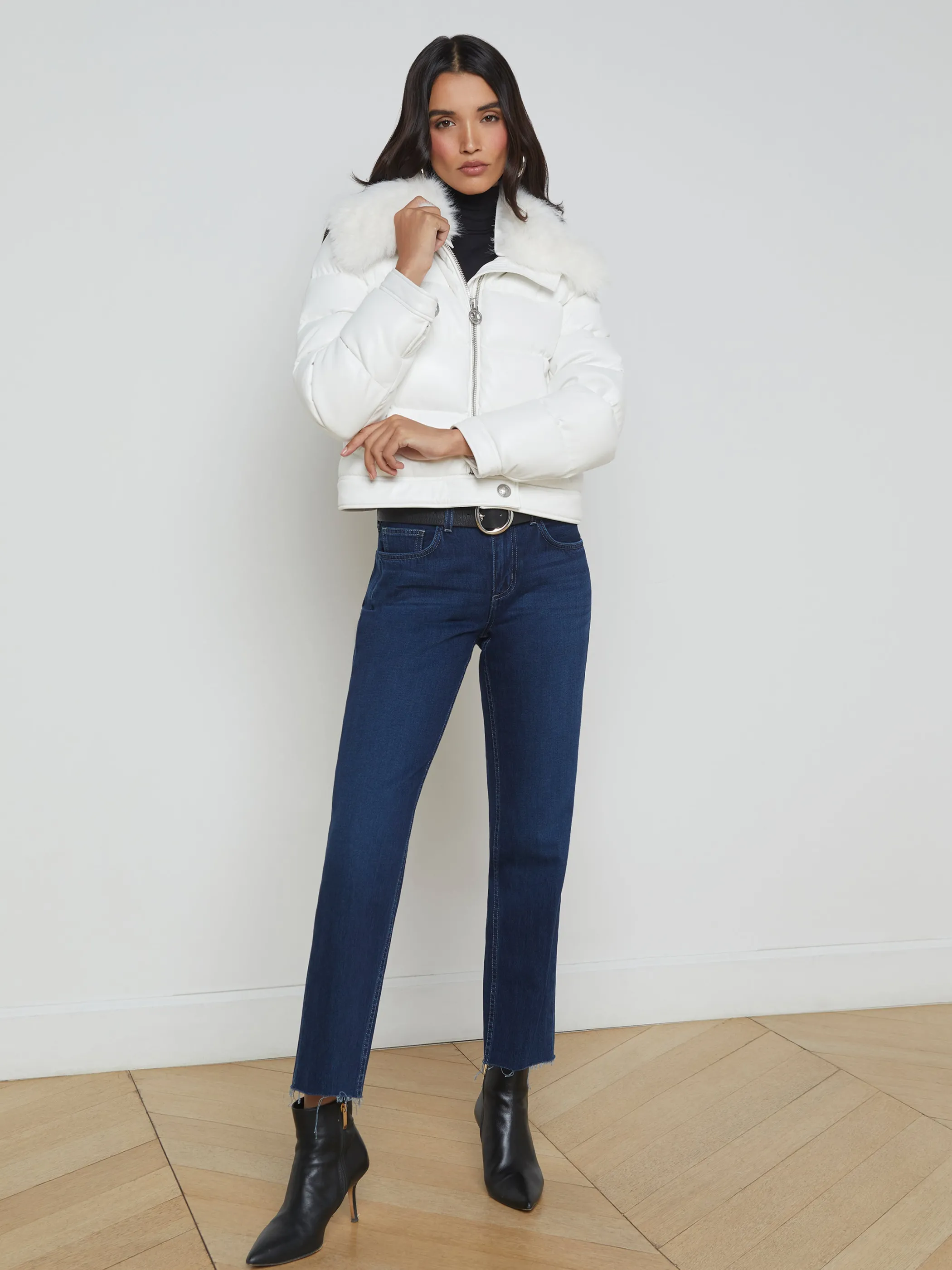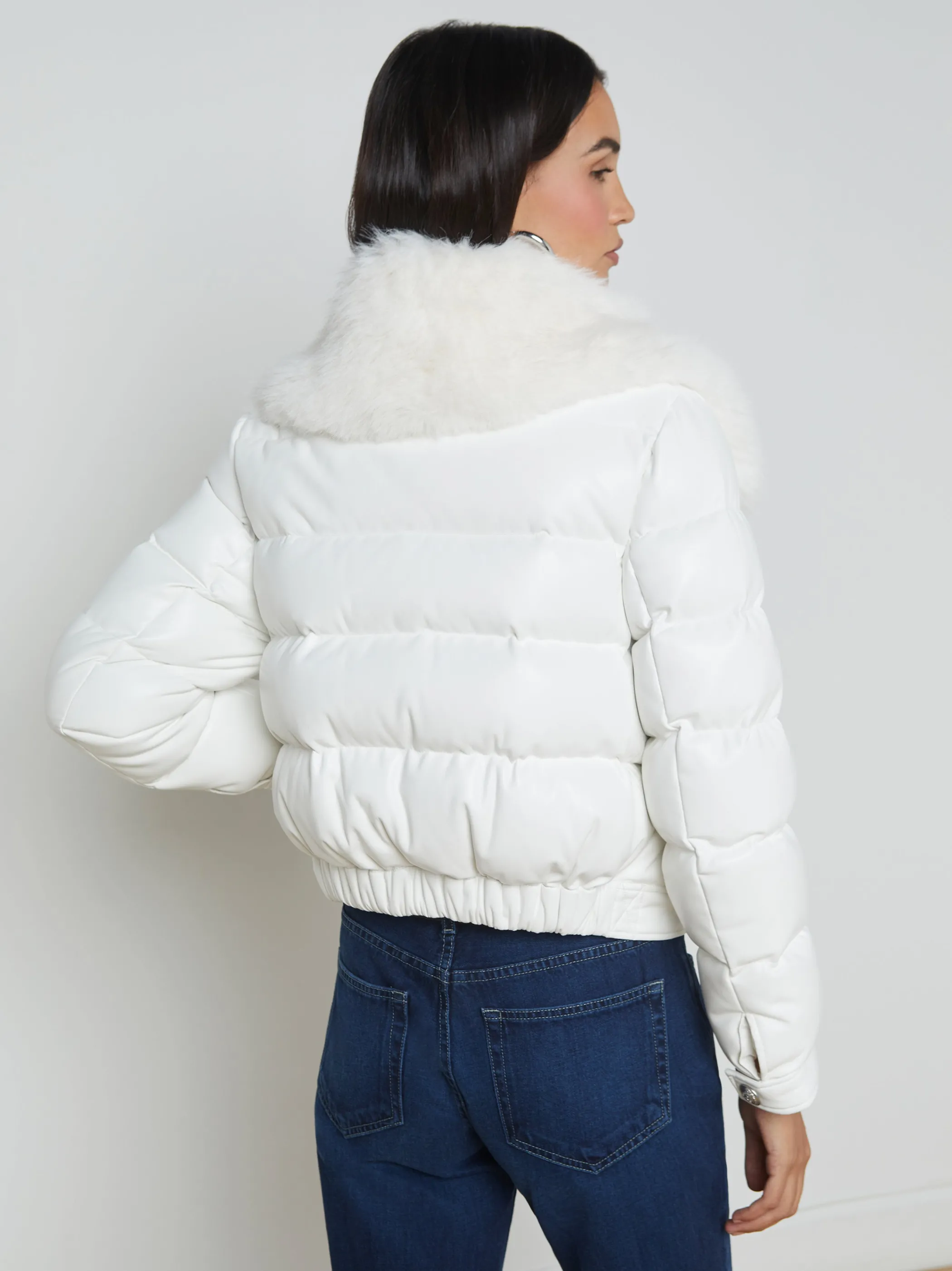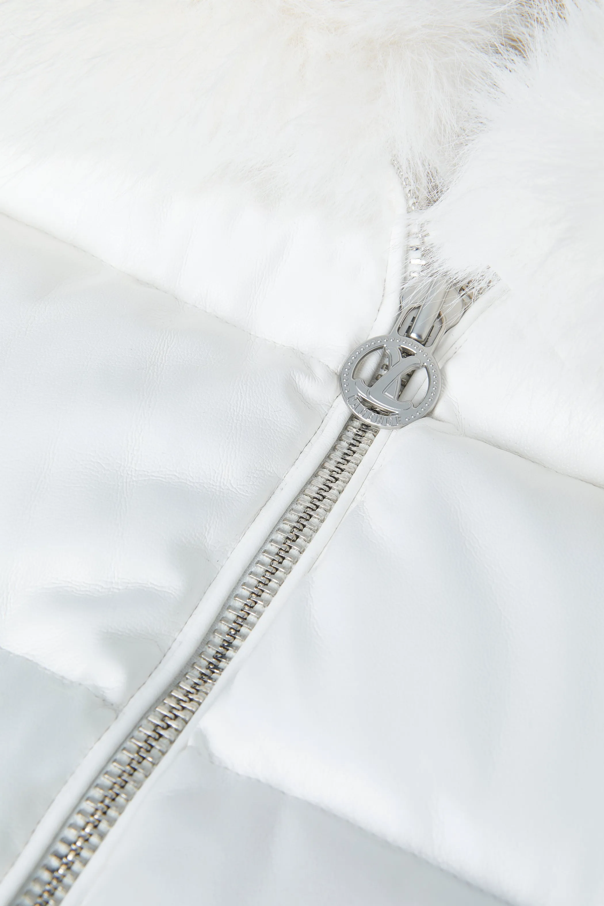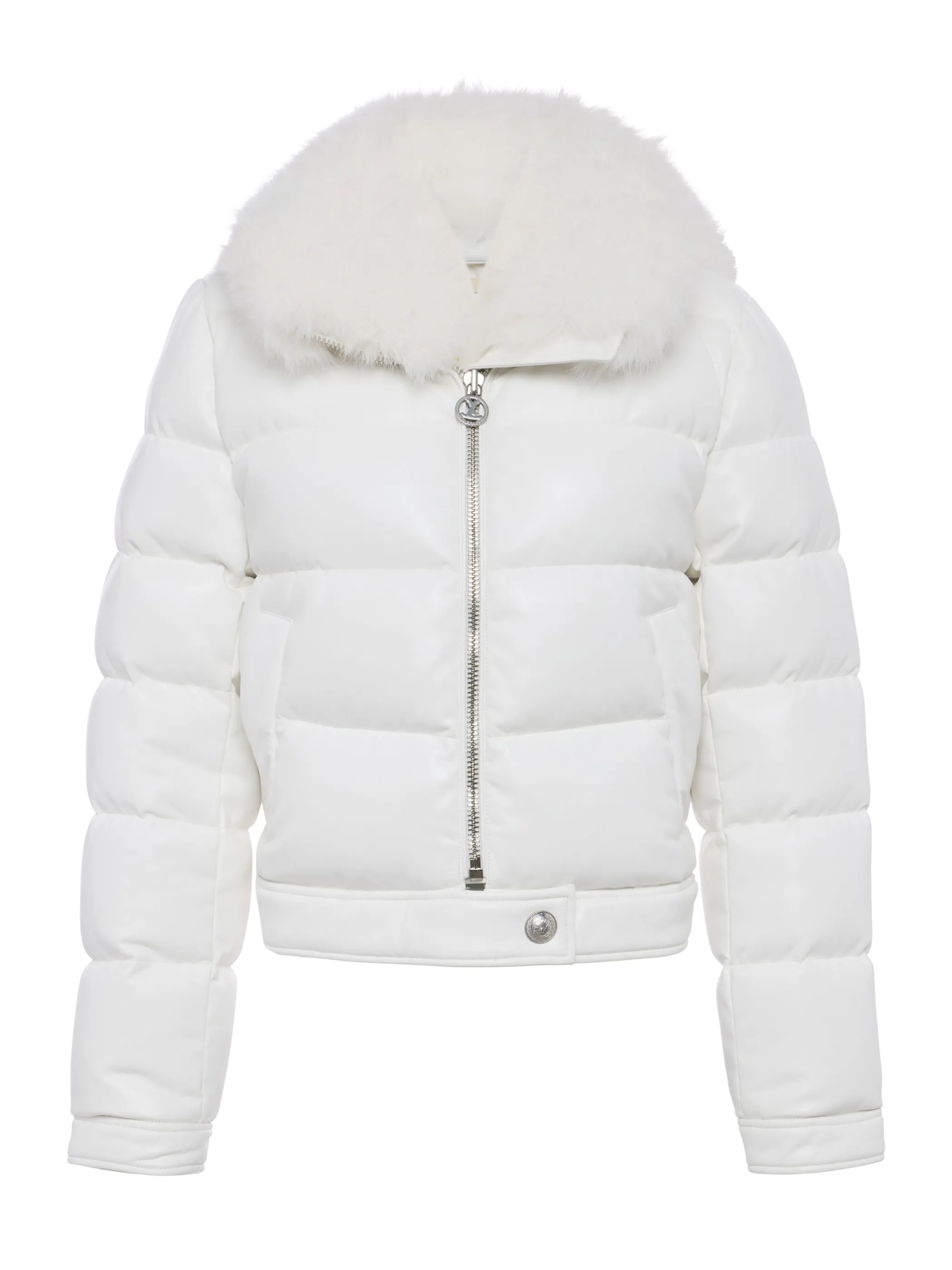 A cool, cropped puffer with a luxe faux fur collar, in timeless white.