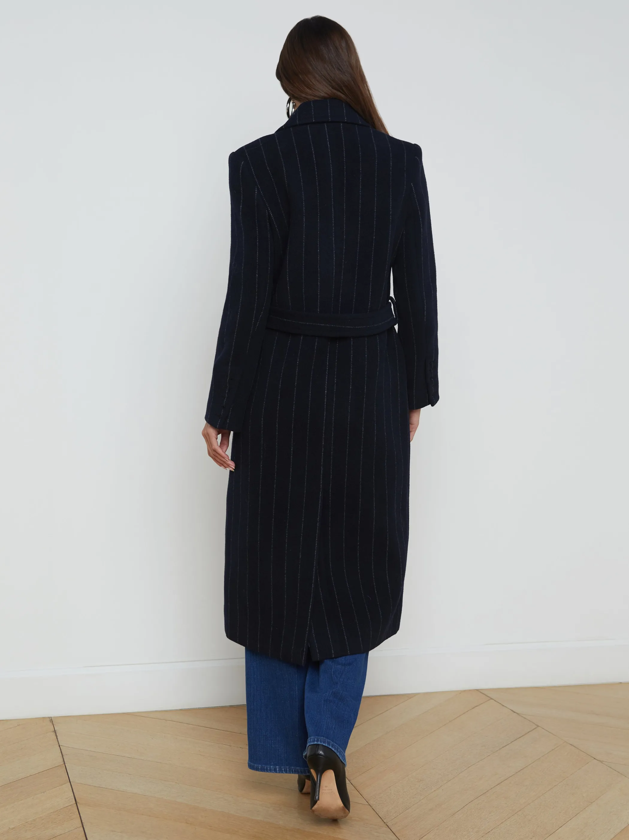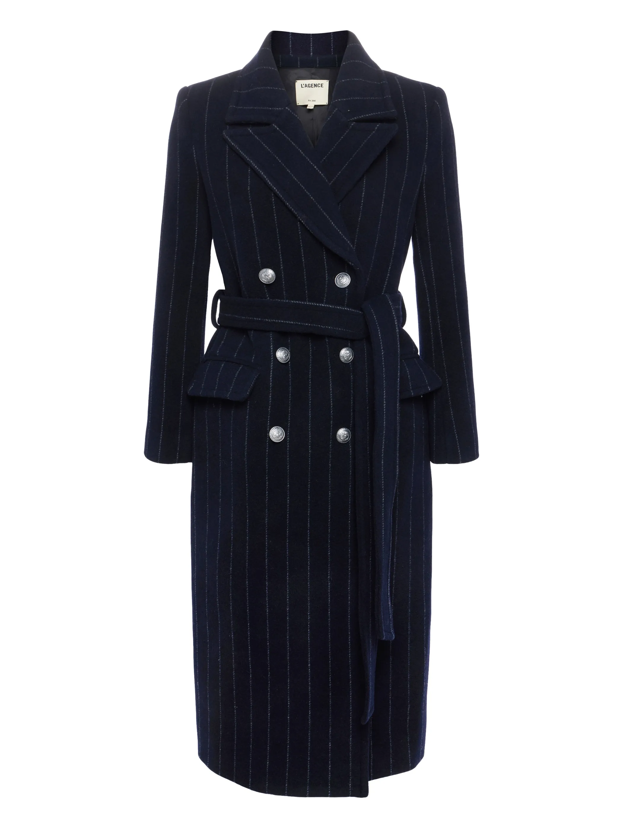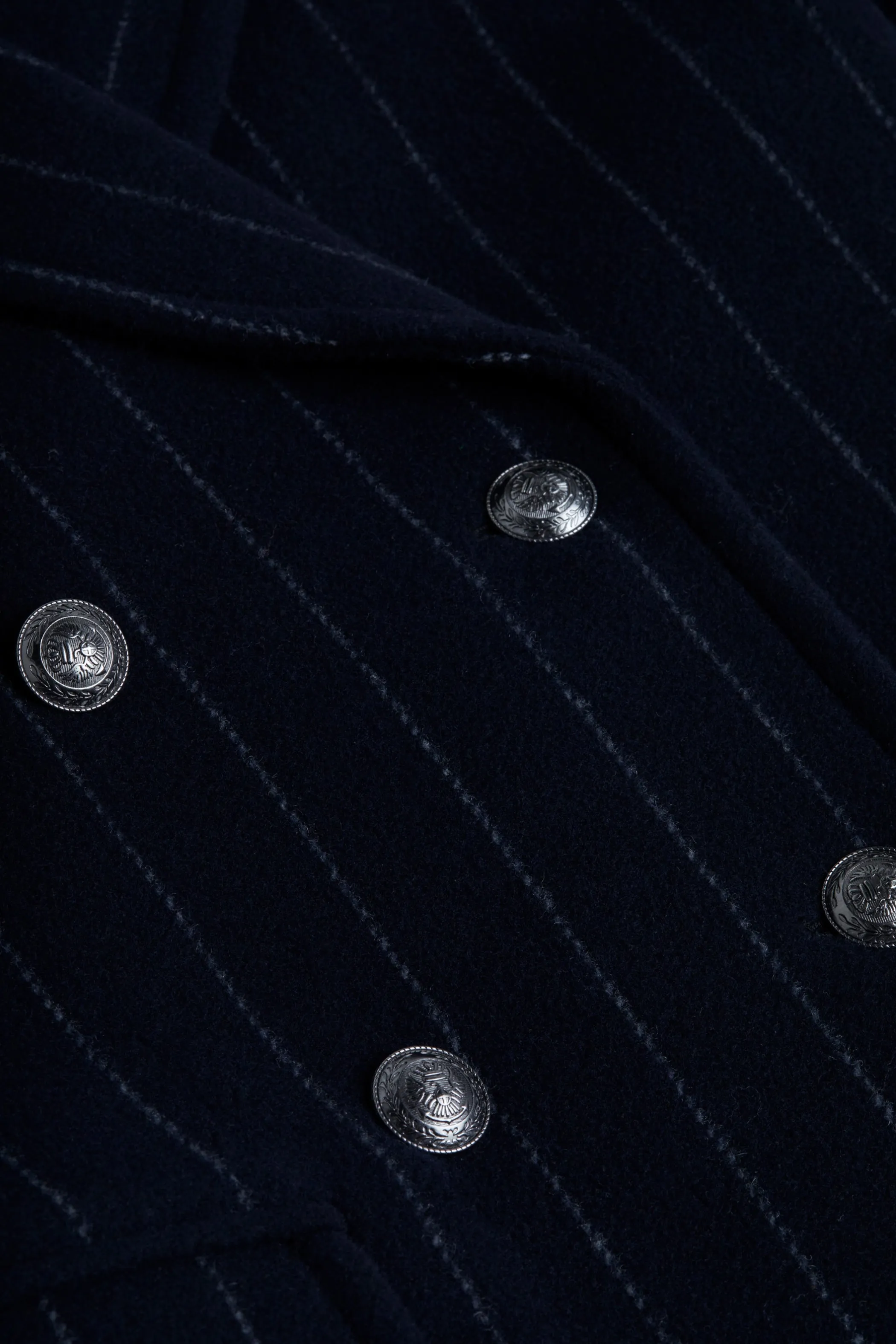 Classic meets chic in our pinstriped Olina coat.• Wool blend fabric• Fully lined• Double-breasted front closure wi…