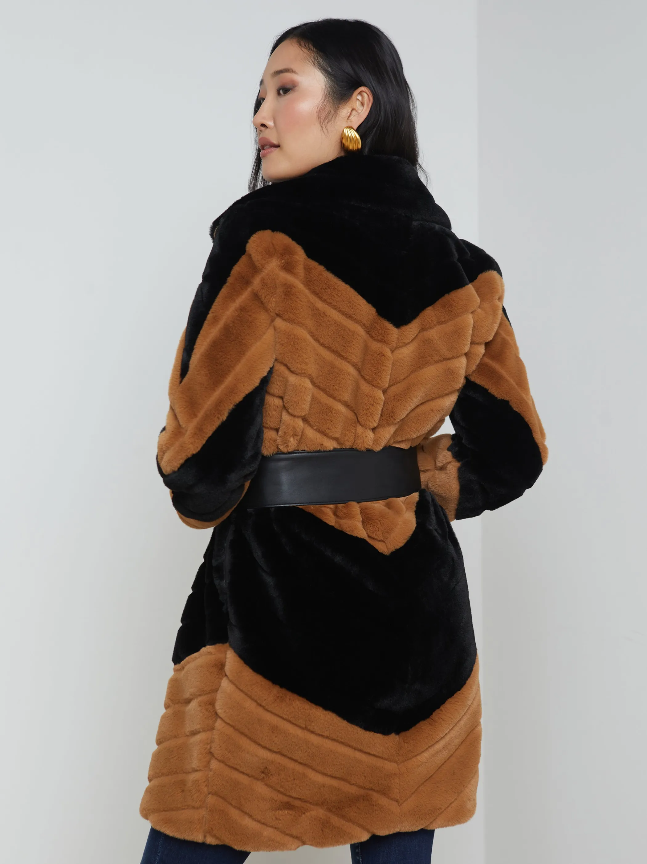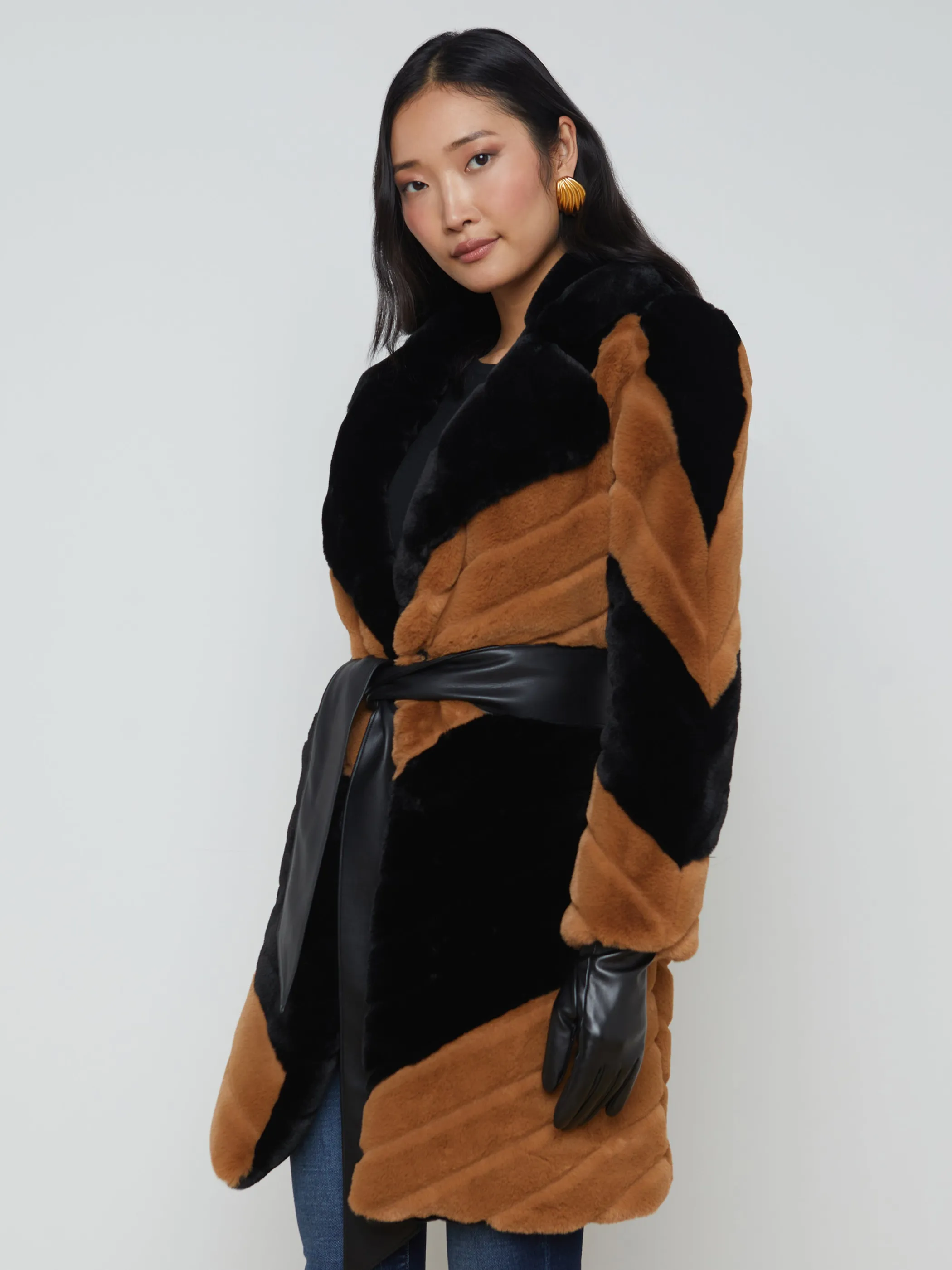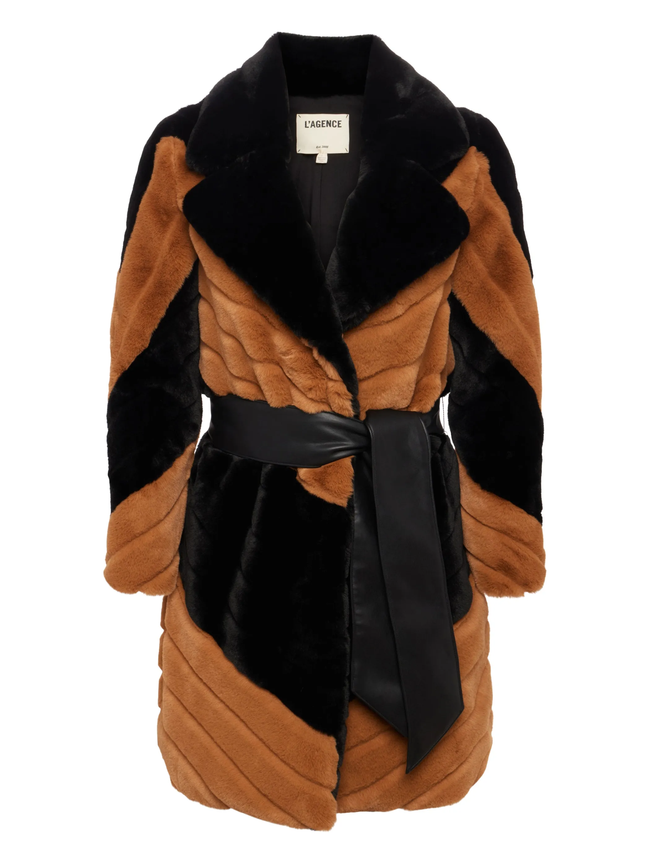 The Zoya features contrasting tones of faux fur defined by a ribbed texture and tie belt for added definition.