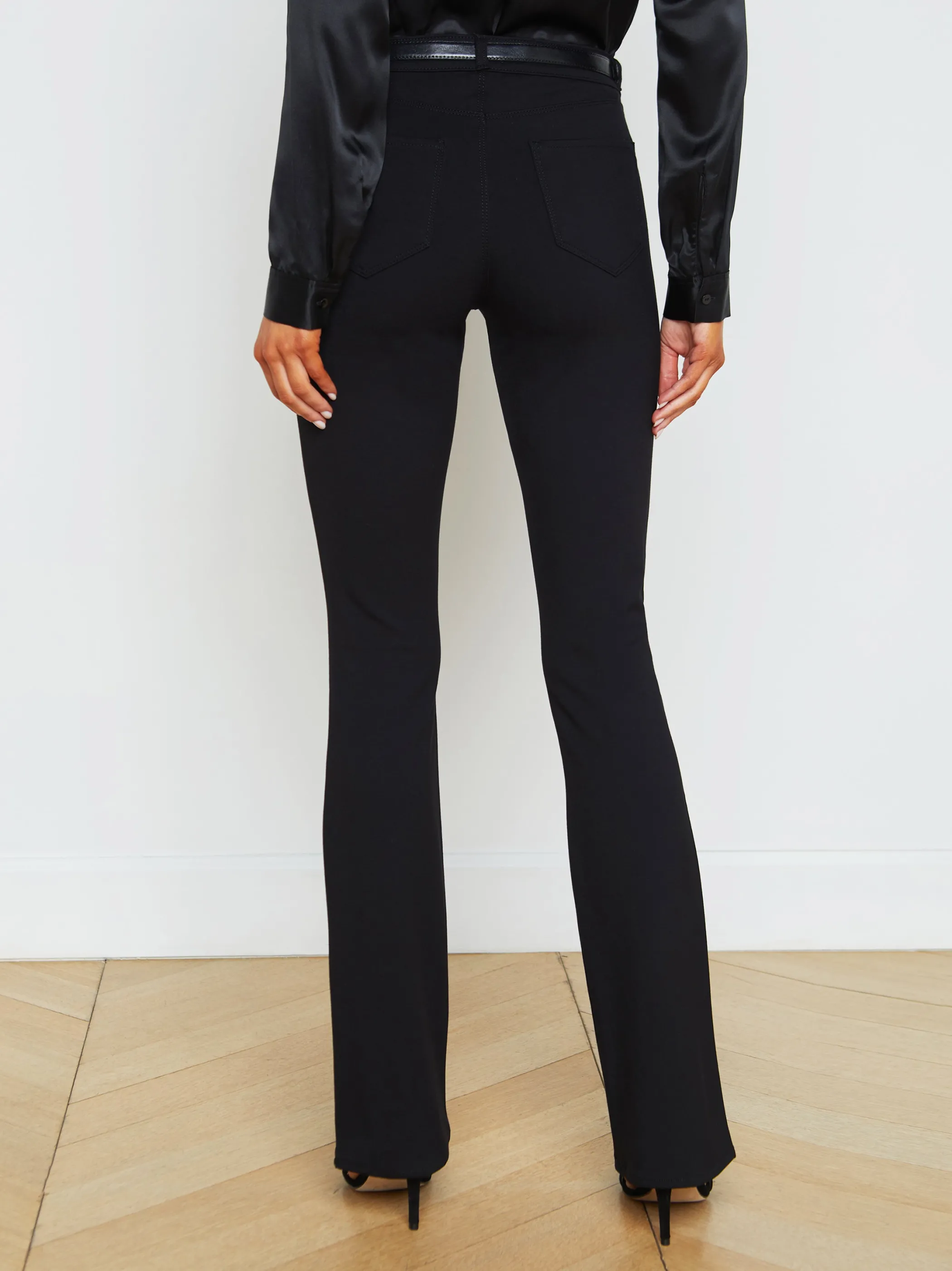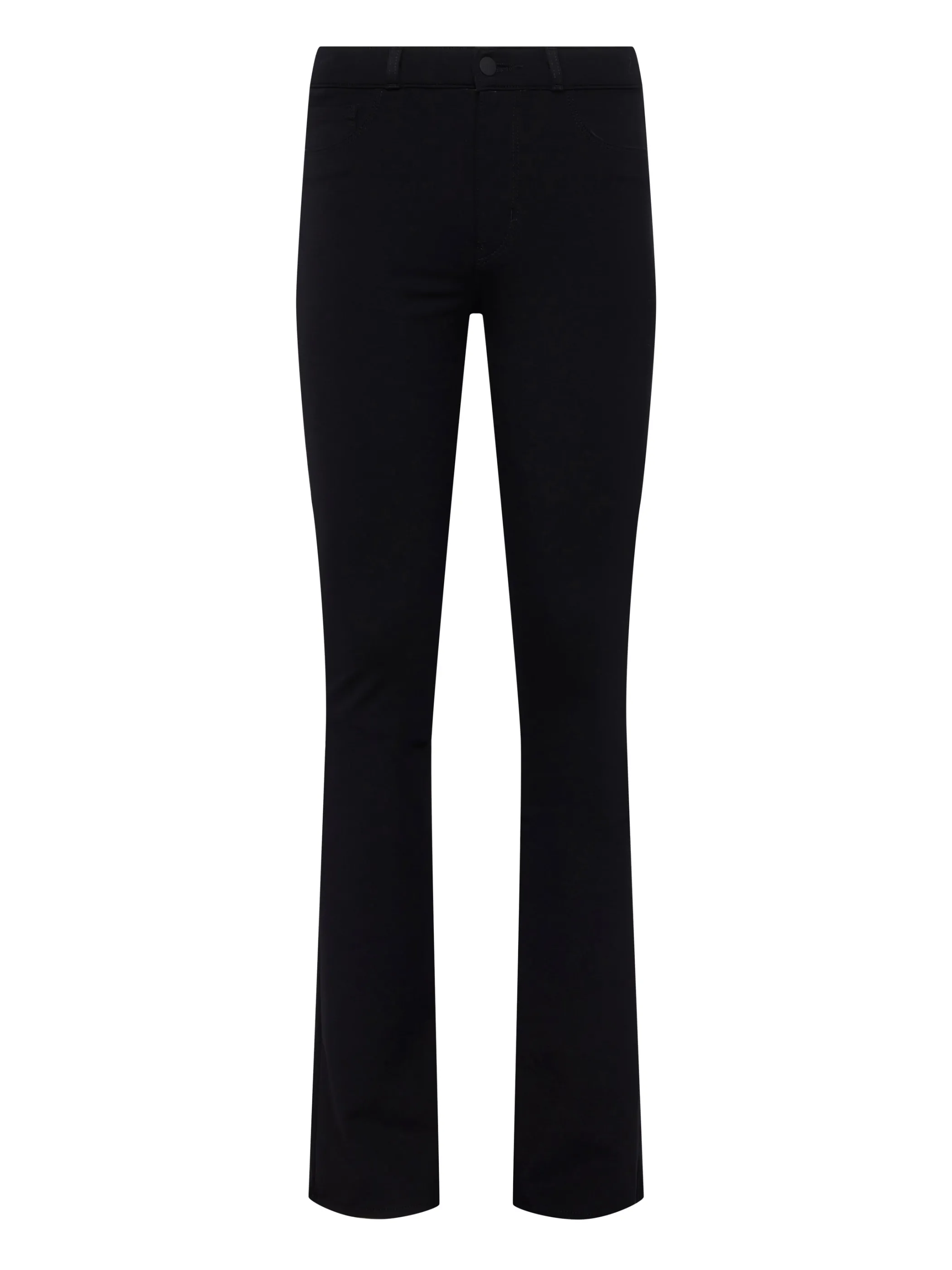 A classic high-rise bootcut pant in true-black ponte. Contoured waistband fits securely at natural waist, then hugs from hip to knee before releasing into a slim bootcut hem. High-recovery ponte holds its shape, smoothing the figure without sacrificing comfort. Classic five-pocket construction and zip fly closure.