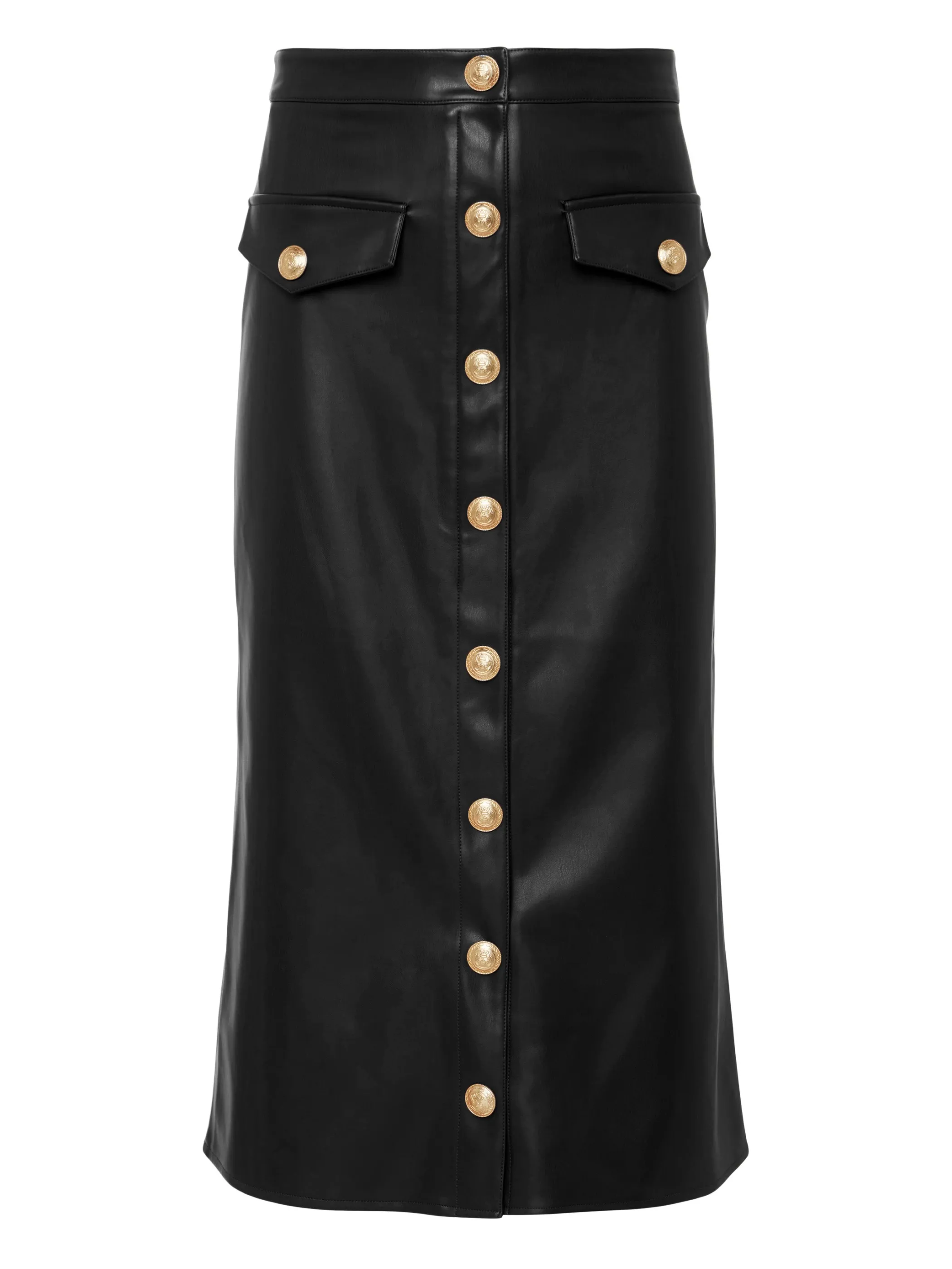 A sleek silhouette and luxe gold accent buttons define our Milann vegan leather skirt. The pencil skirt silhouette hugs the waist before draping straight to the midi hem. The embossed-dome button convert to functional snaps at the hem, letting you create a front-slit look. Wear with a minimalist top and pointed-toe boot to let the skirt take center stage.