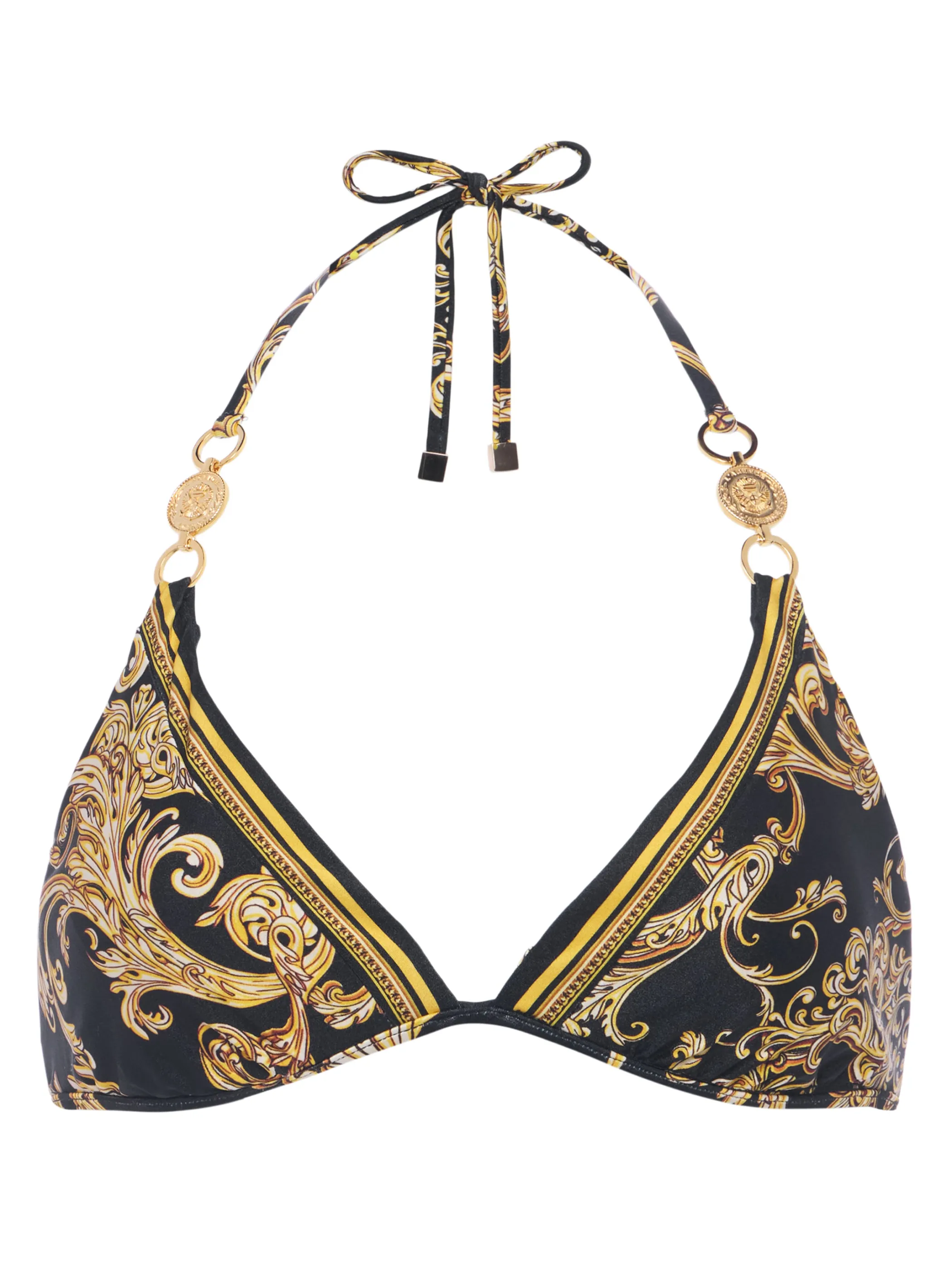 Our classic black triangle bikini top, now in a gold Barocco print.