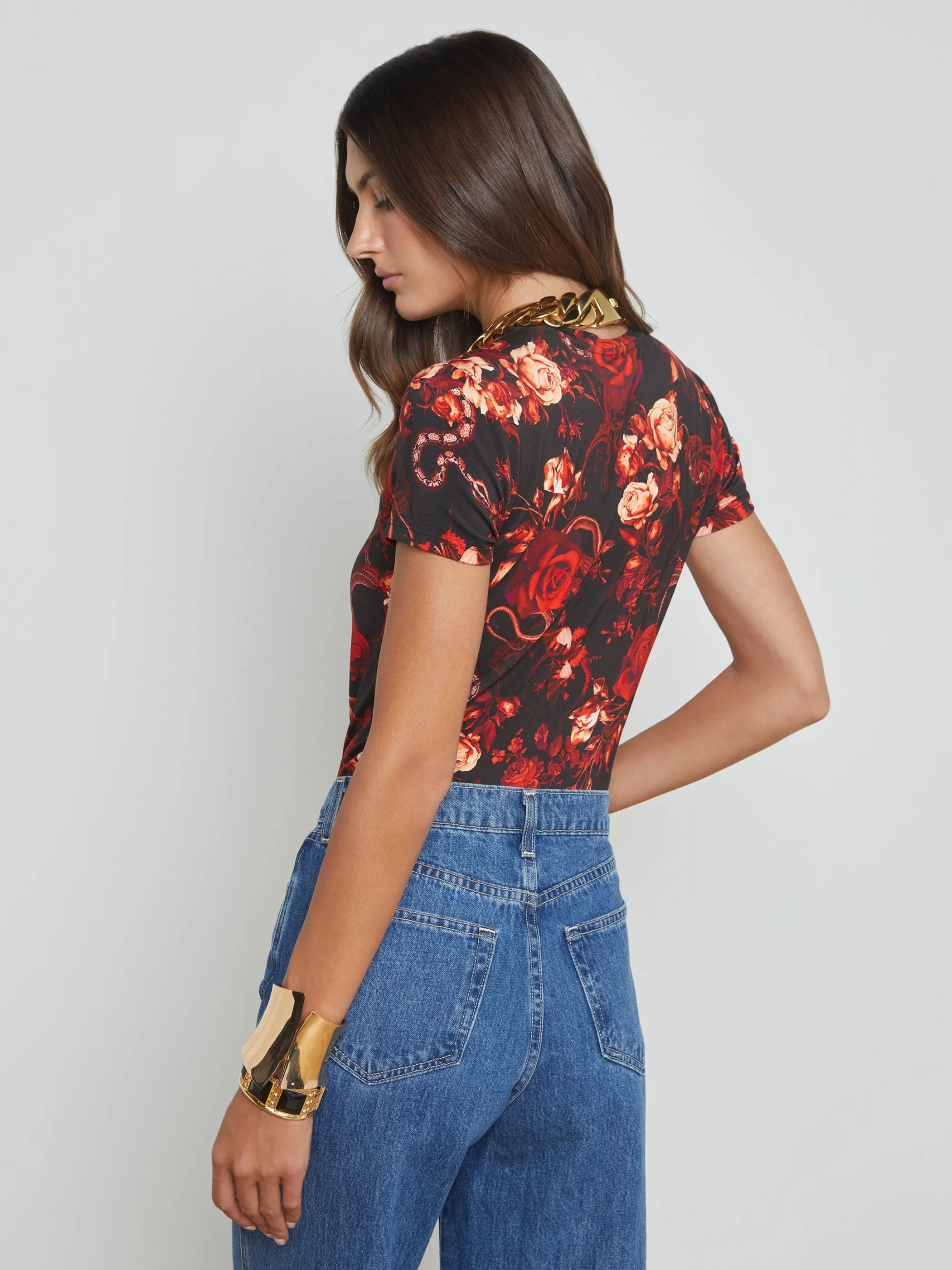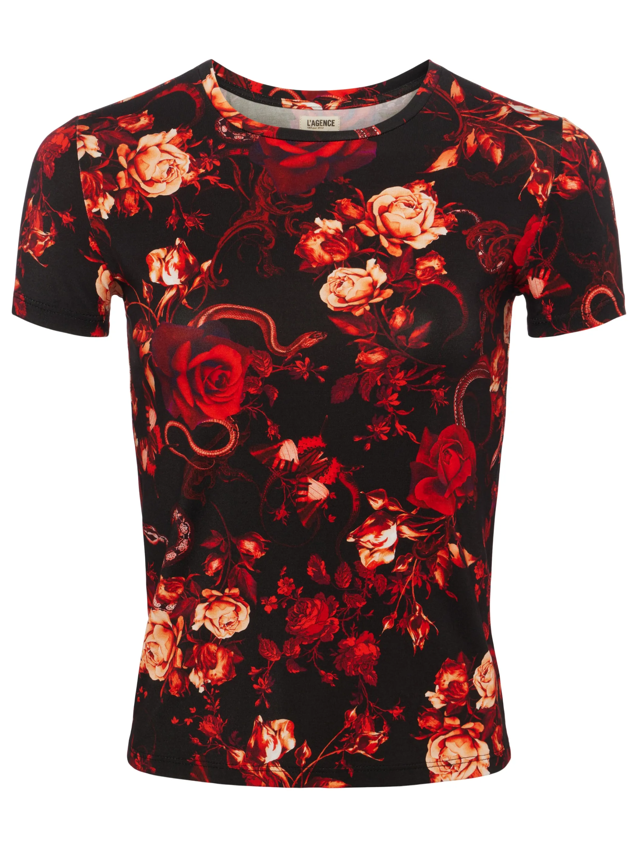 In a soft, supple fabrication and slim cut, Ressi is our most flattering short sleeve tee. This L’AGENCE favorite is back in a deep red rose and snake print.
